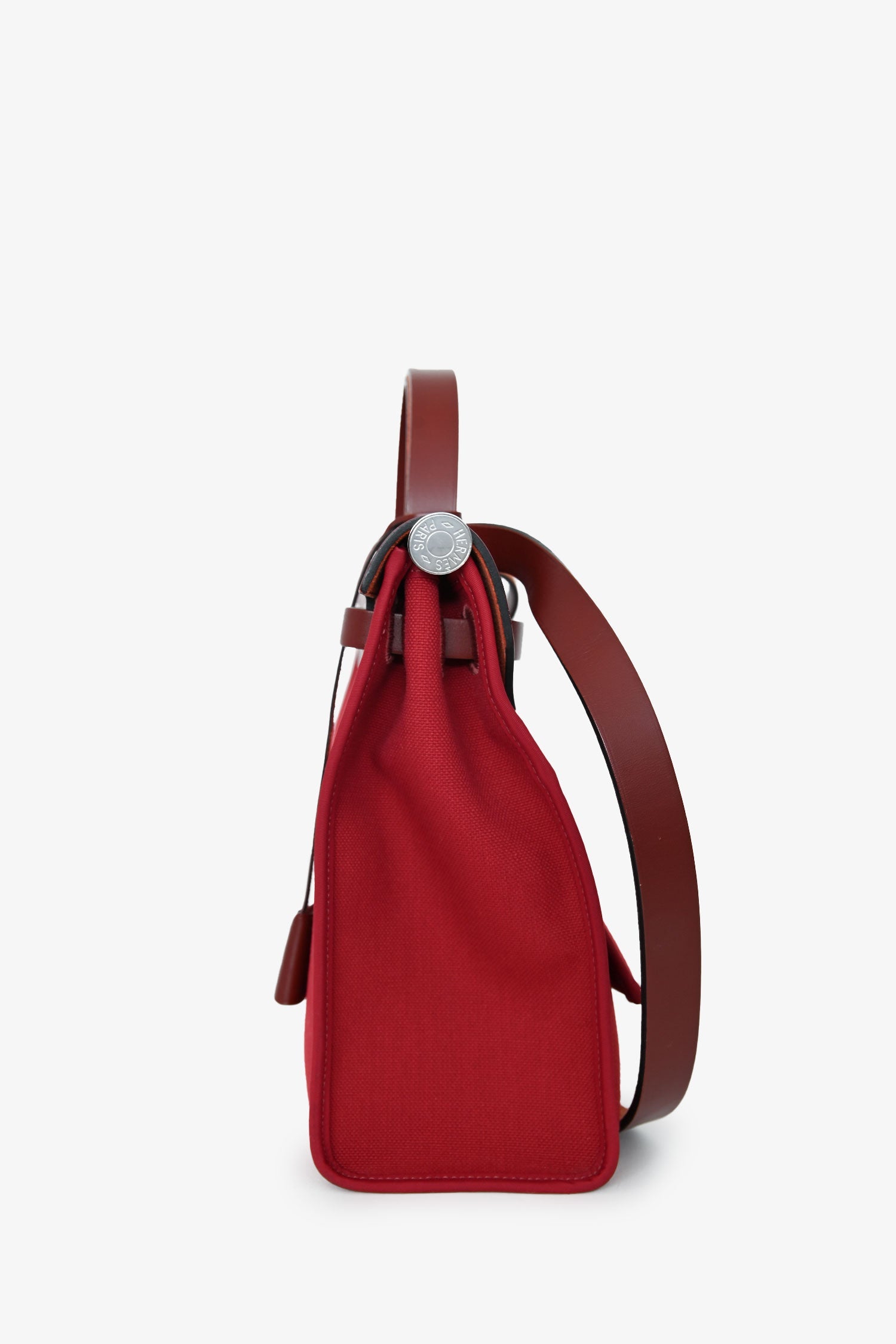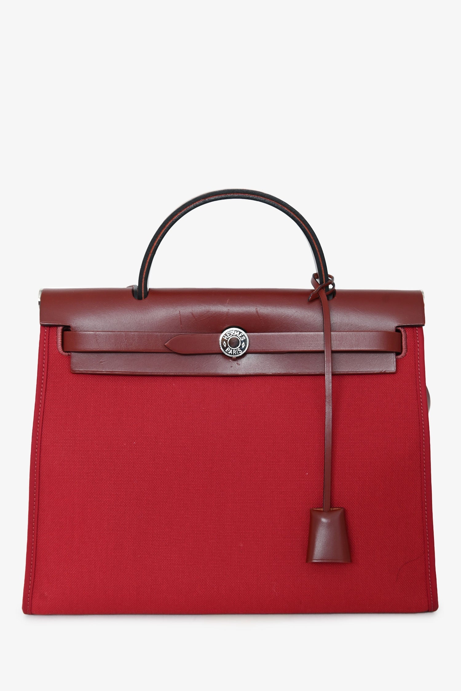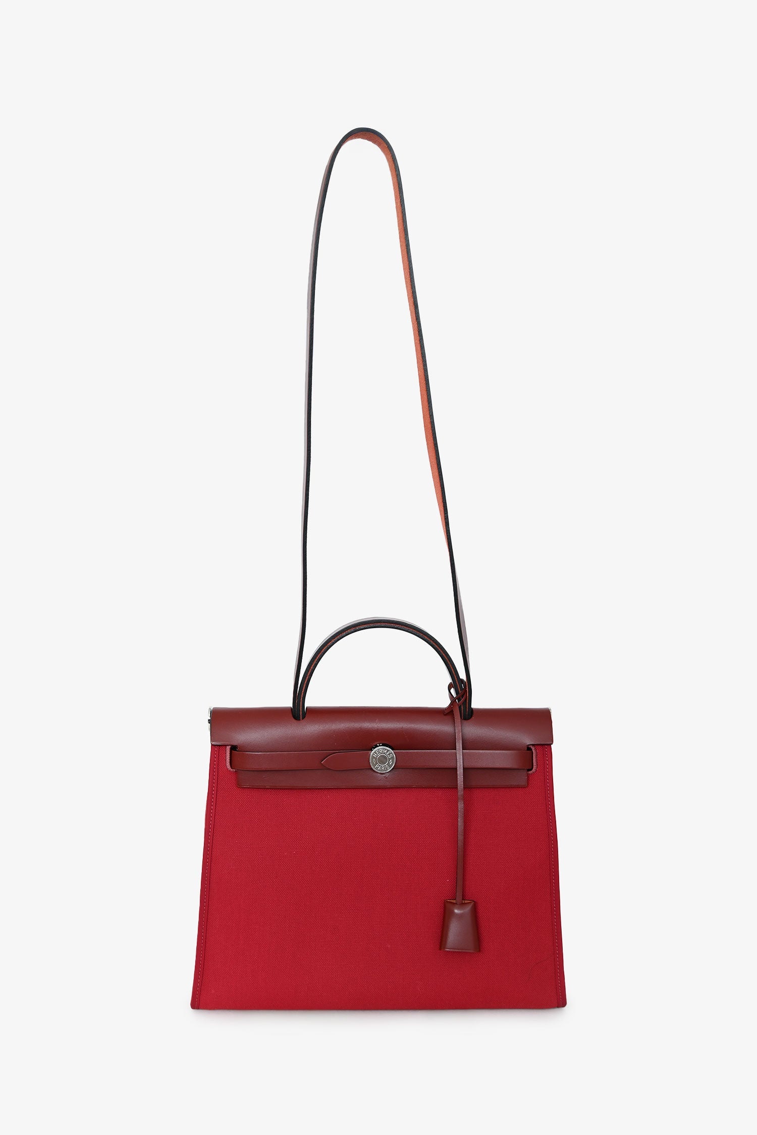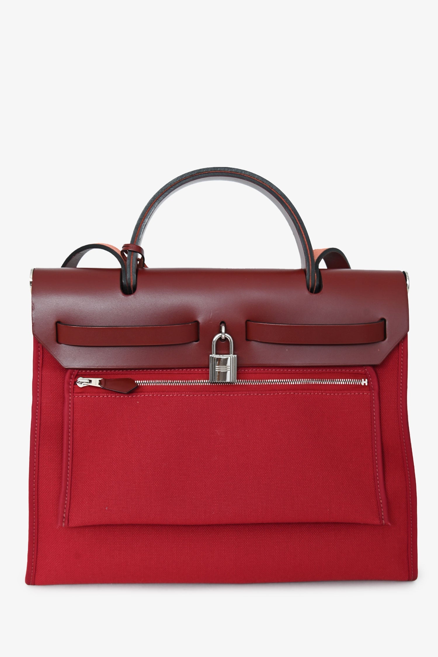 Hermès 2019 Red Herbag Zip 31. Front fold-over flap with strap closures. Top handle. Single exterior zip pocket. Textile-lined interior. Removable interior zip pouch. Detachable clochette. Palladium-tone hardware. Tonal stitching.