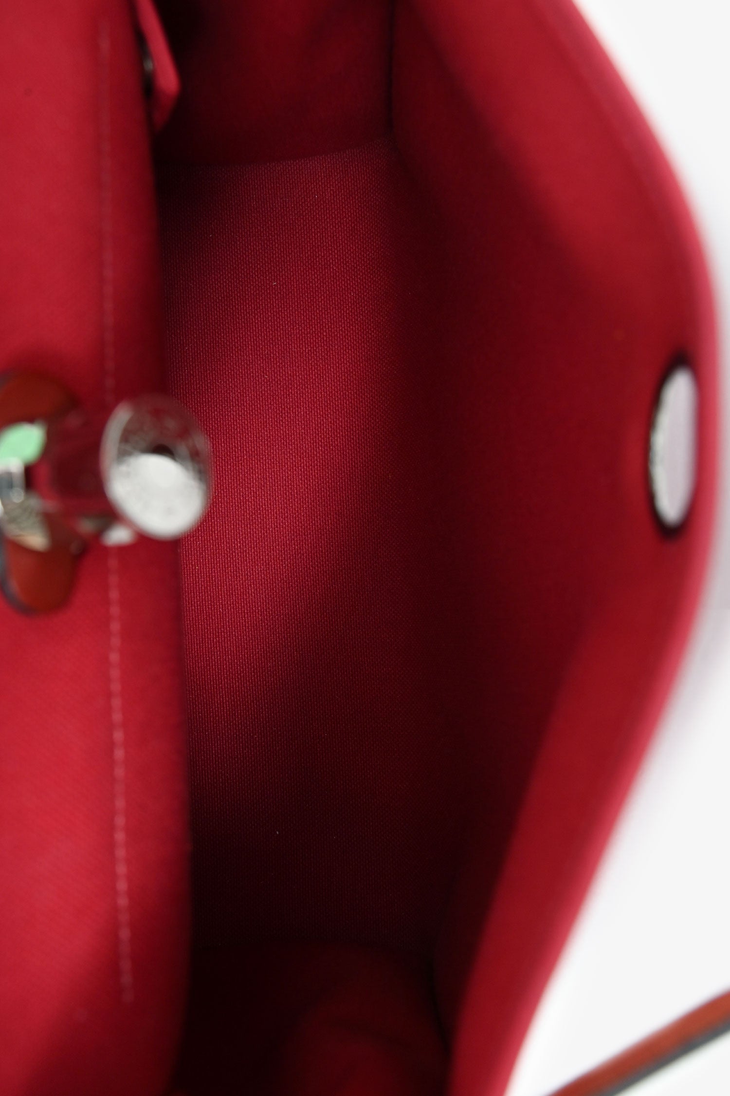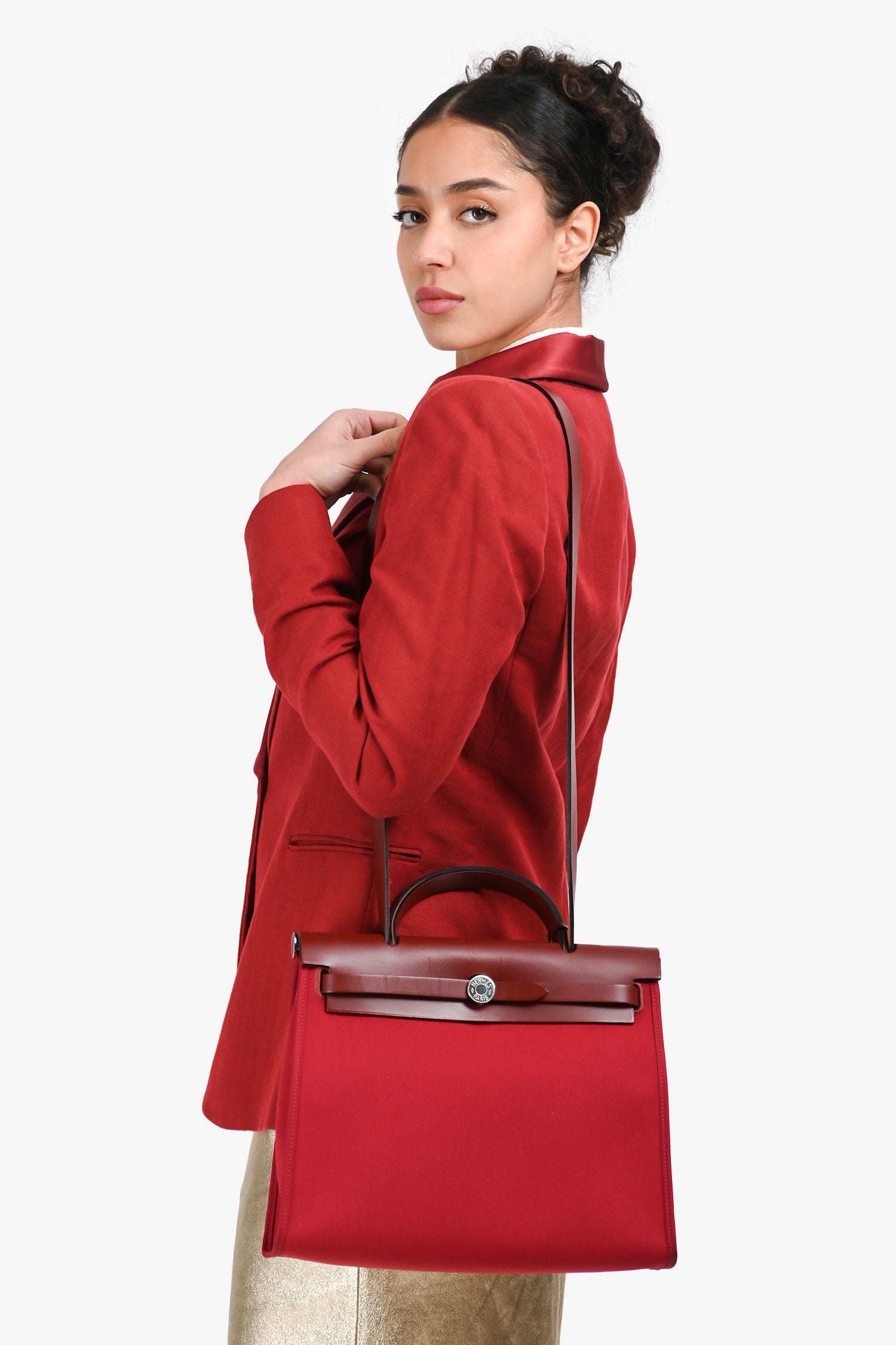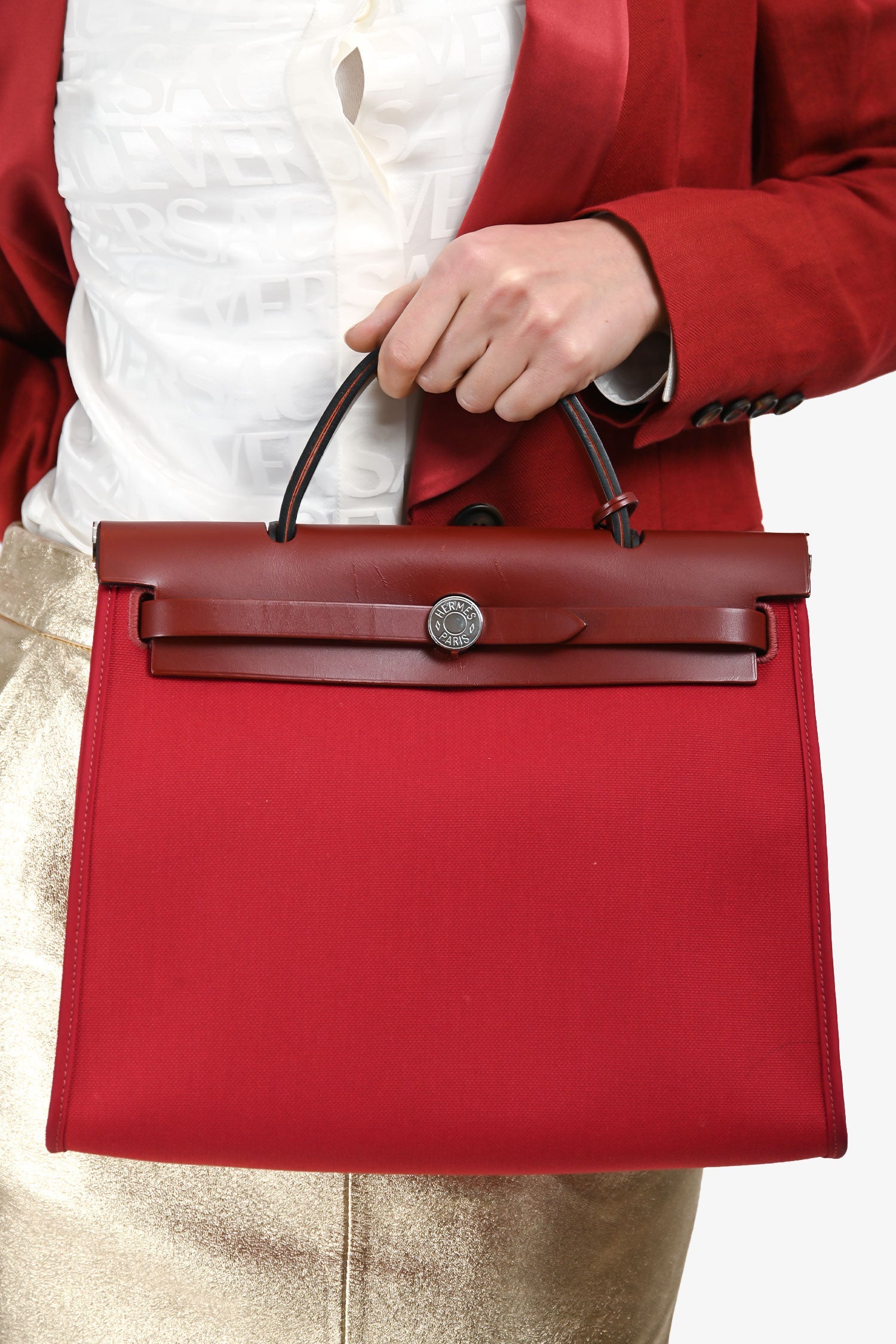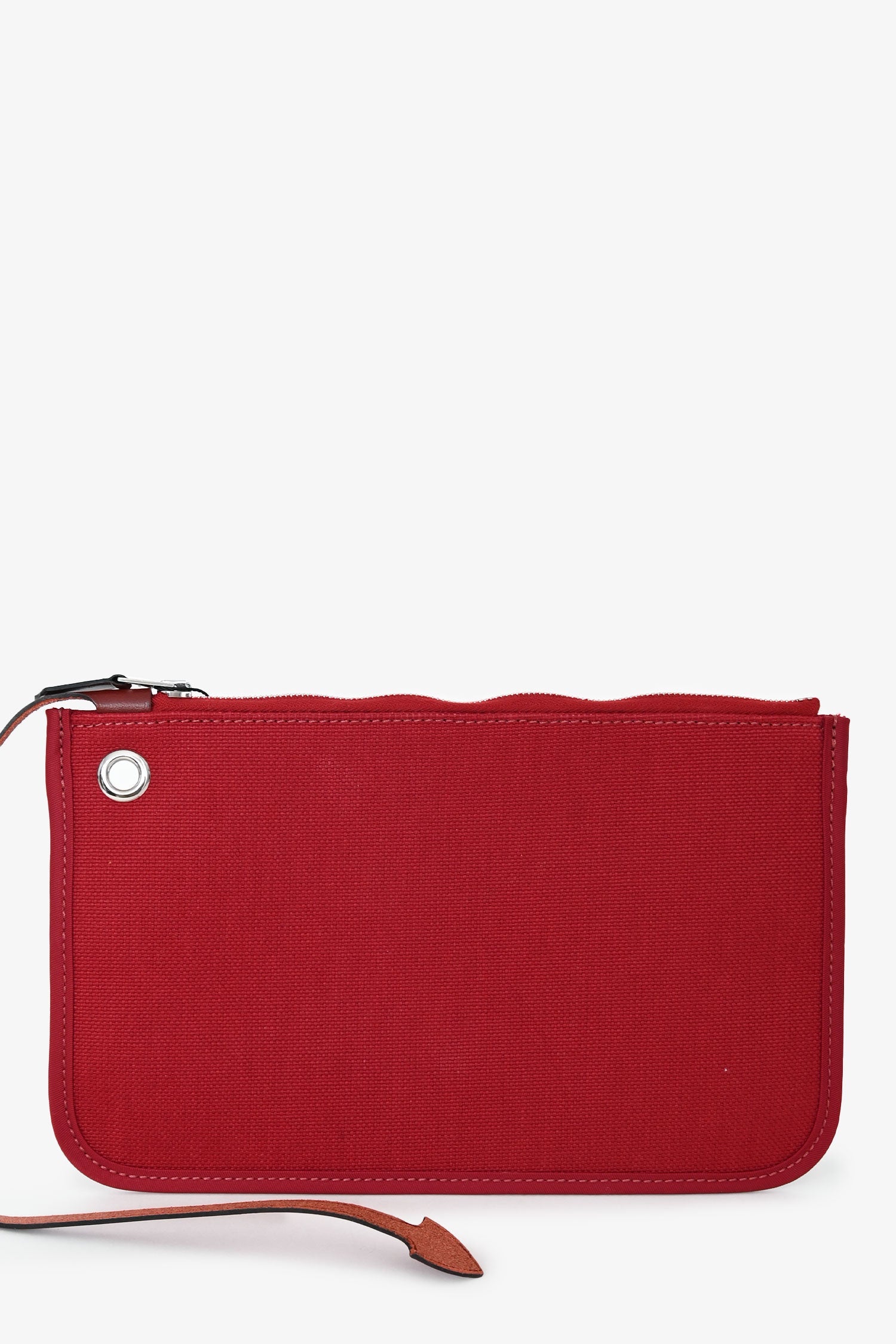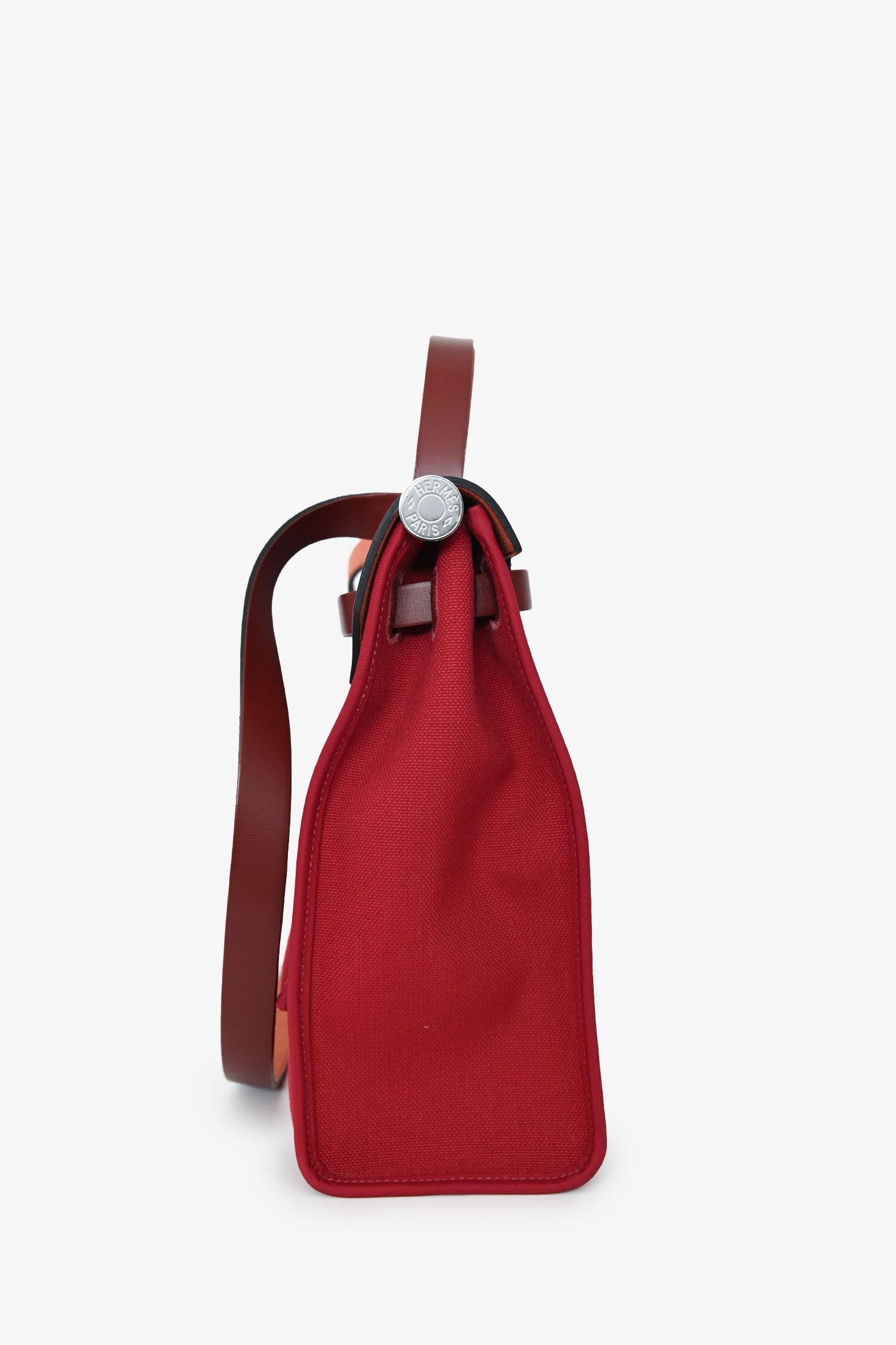 Hermès 2019 Red Herbag Zip 31. Front fold-over flap with strap closures. Top handle. Single exterior zip pocket. Textile-lined interior. Removable interior zip pouch. Detachable clochette. Palladium-tone hardware. Tonal stitching.