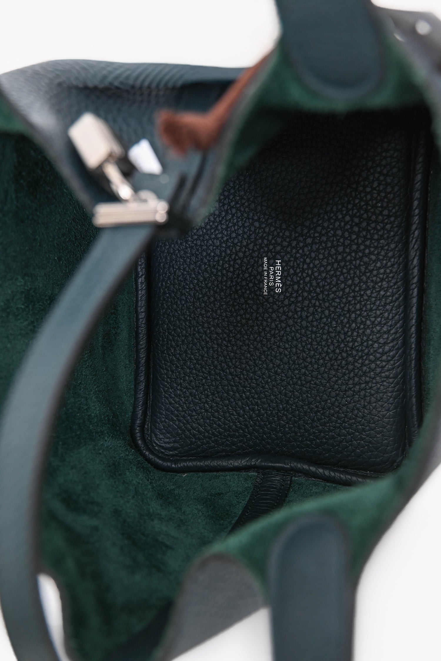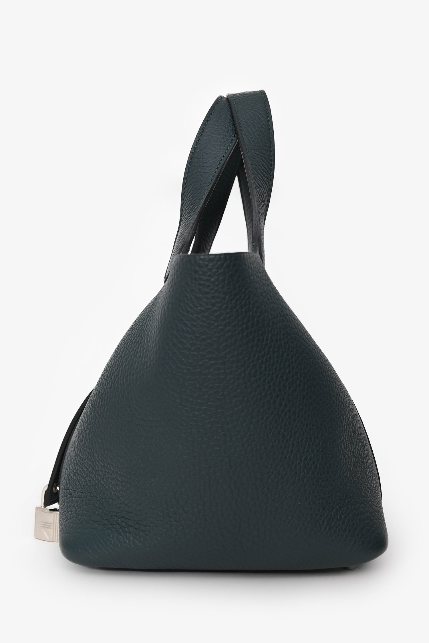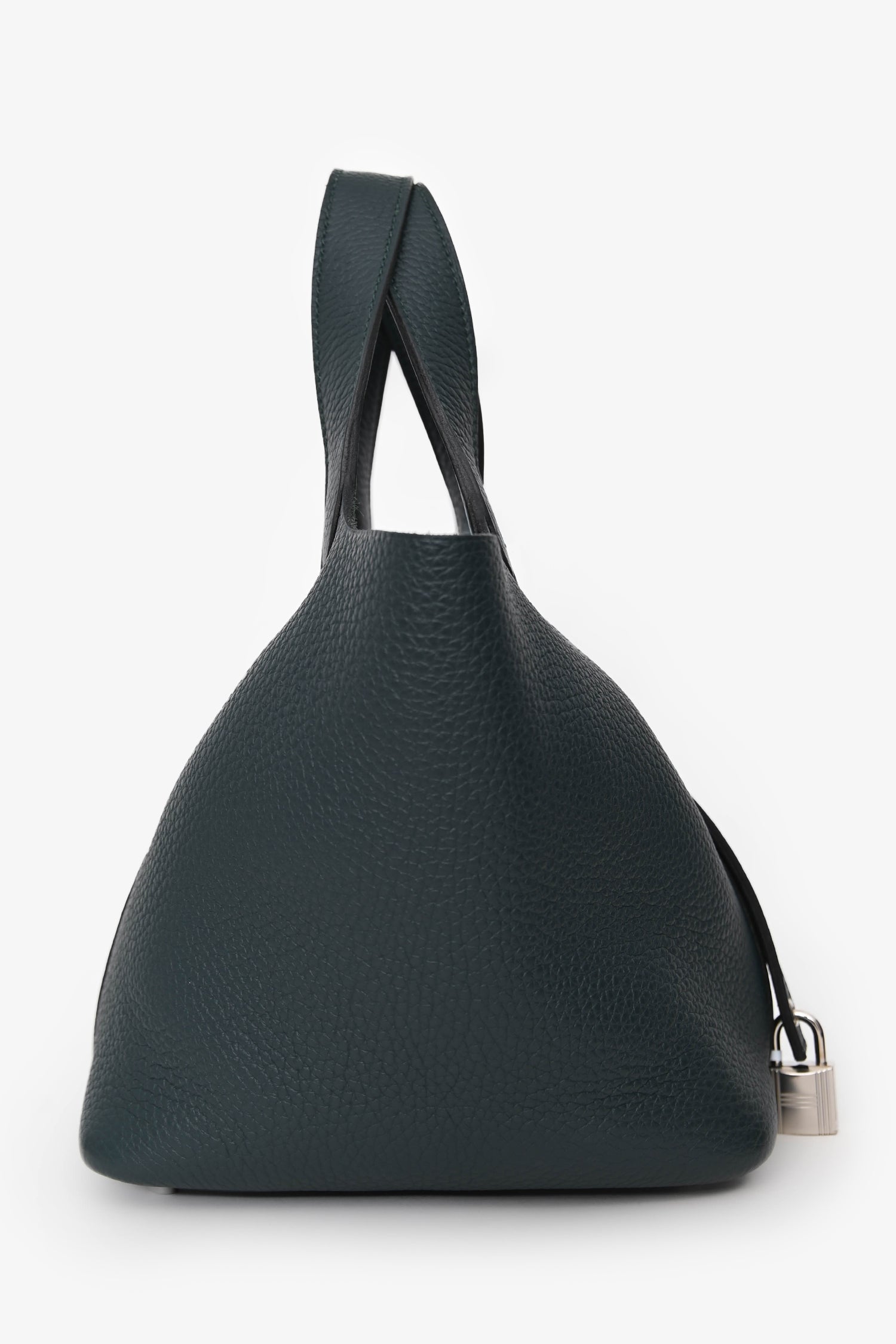Hermès 2021 Cypress Vert Clemence Picotin 18. Open top with strap closure. Twin top handles. Suede-lined interior. Detachable clochette with 2 keys. Protective base studs. Palladium hardware. Tonal stitching.