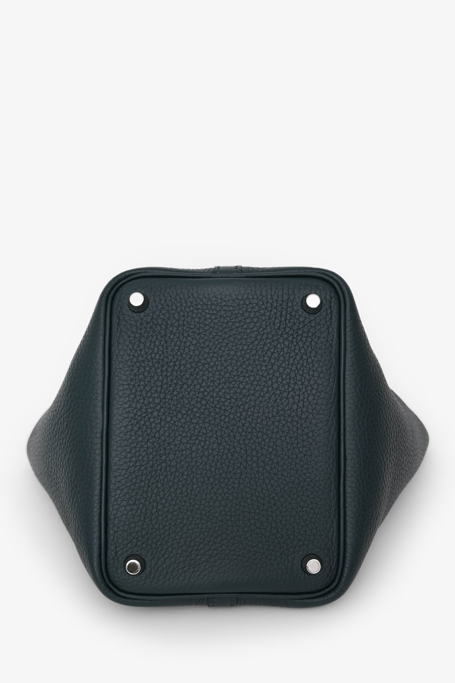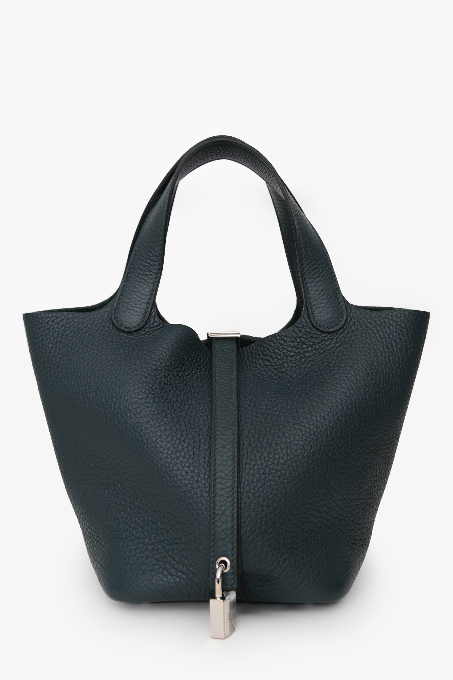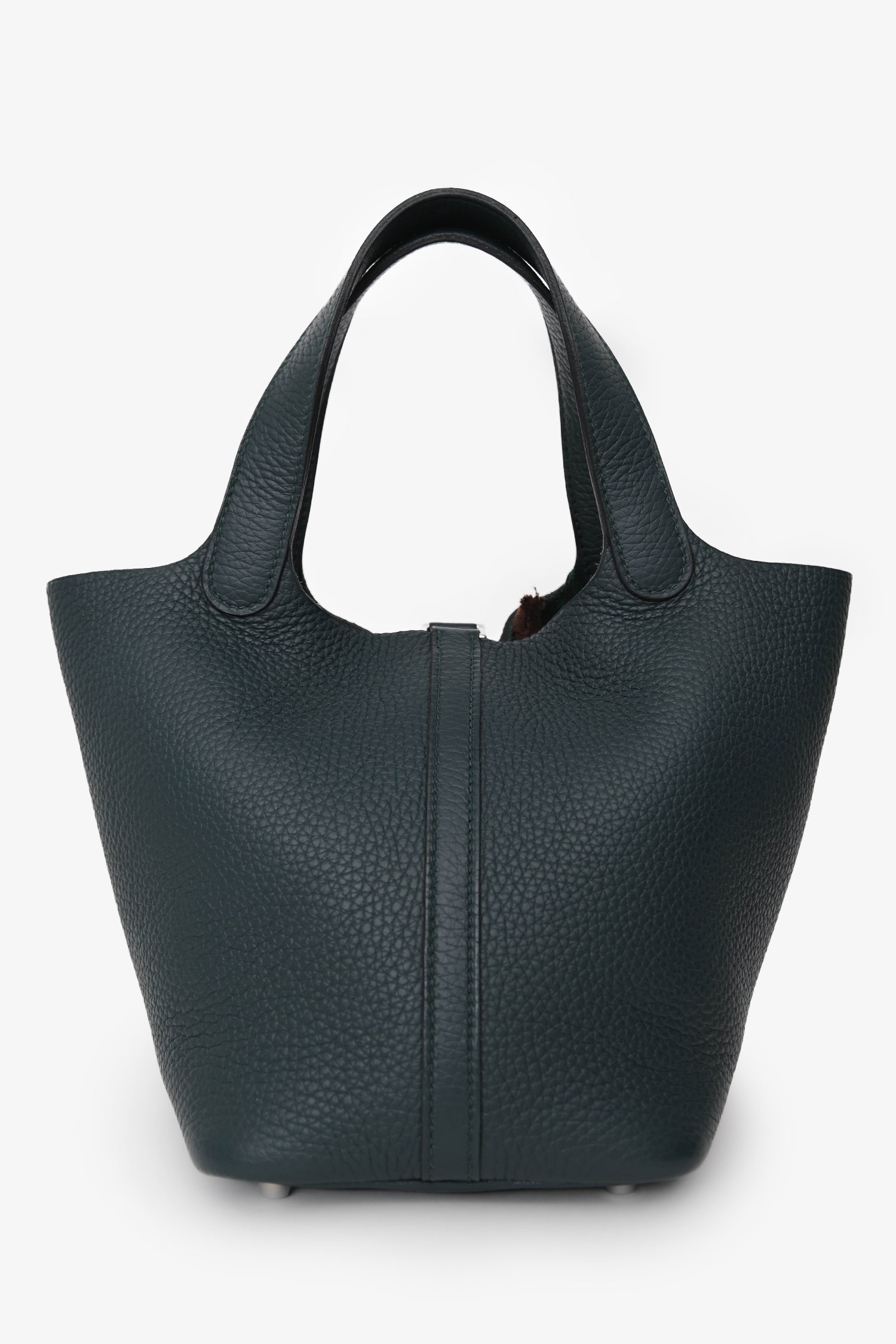 Hermès 2021 Cypress Vert Clemence Picotin 18. Open top with strap closure. Twin top handles. Suede-lined interior. Detachable clochette with 2 keys. Protective base studs. Palladium hardware. Tonal stitching.