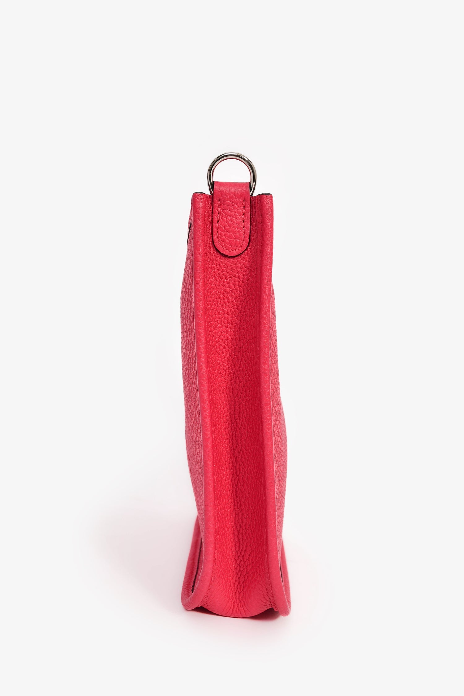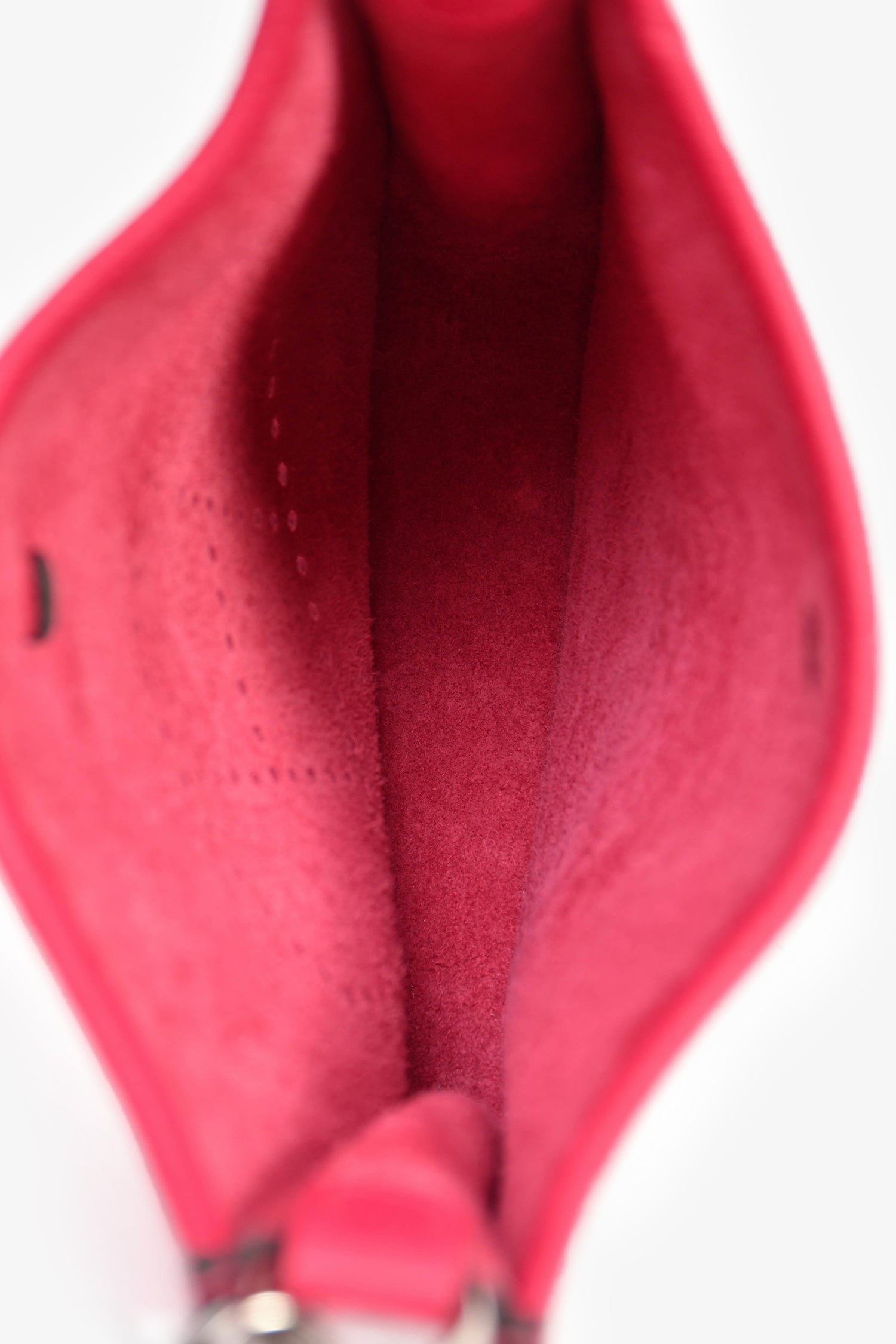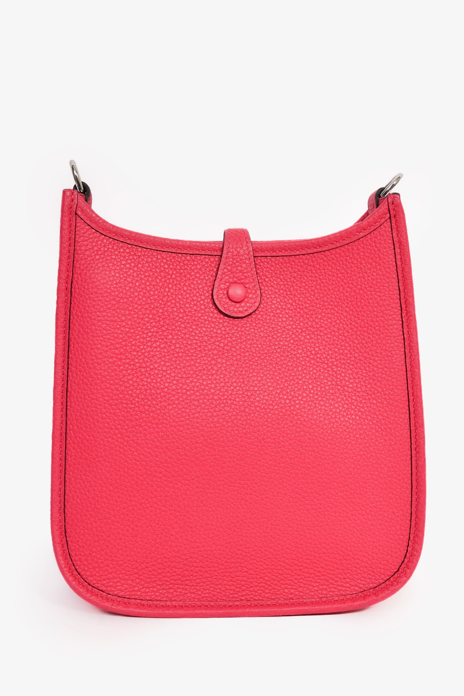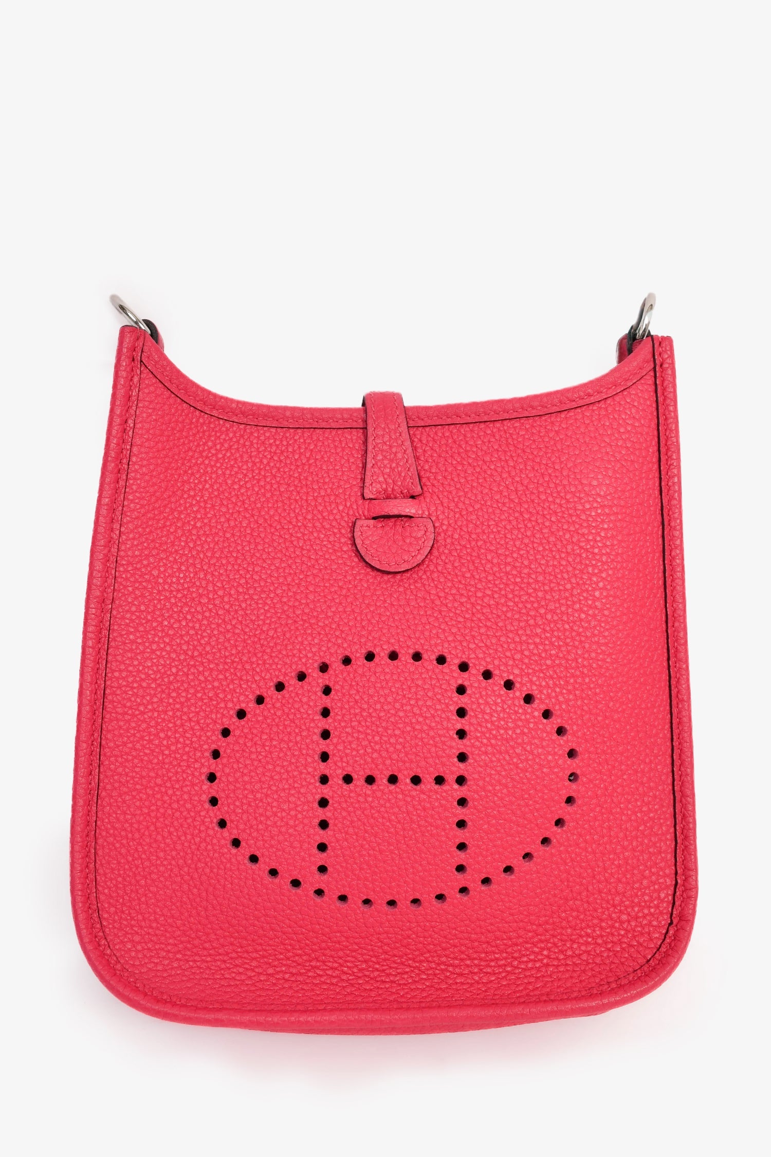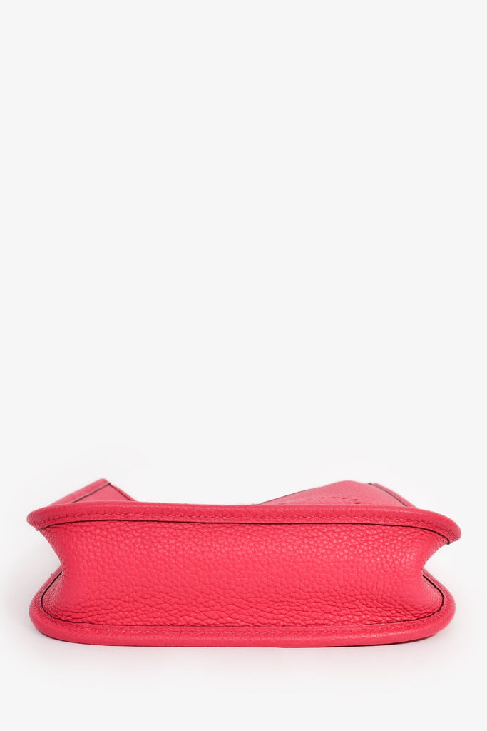 Hermès 2021 Pink Leather Evelyn TPM Crossbody PHW. Front fold-over strap with snap-button closure Removable crossbody strap. Perforated logo on front centre exterior. Open suede-lined interior. Palladium-tone hardware. Tonal stitching.
