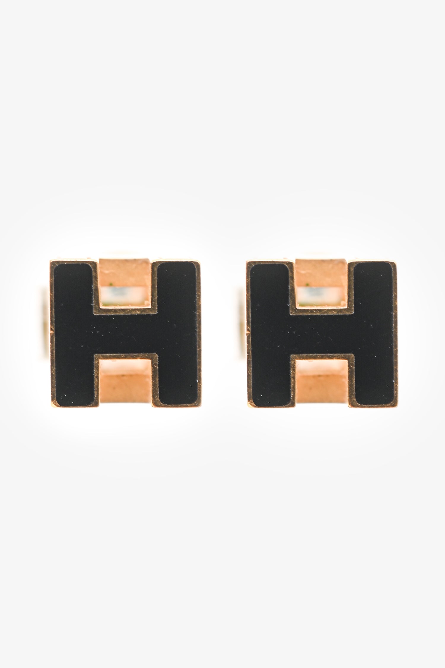 Hermès Gold Tone Metal/Black Enamel H Cube Earrings. Post stud closure.