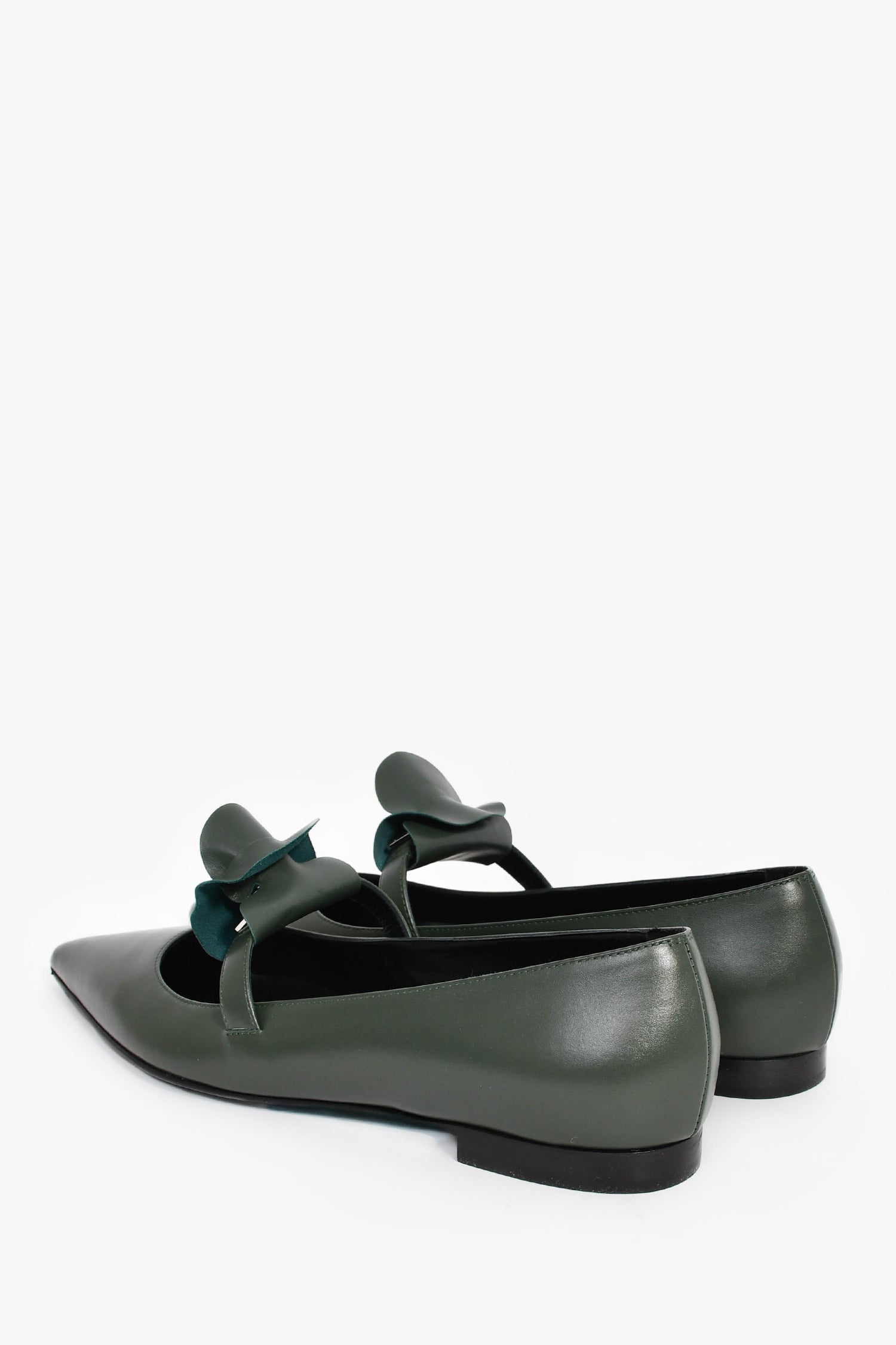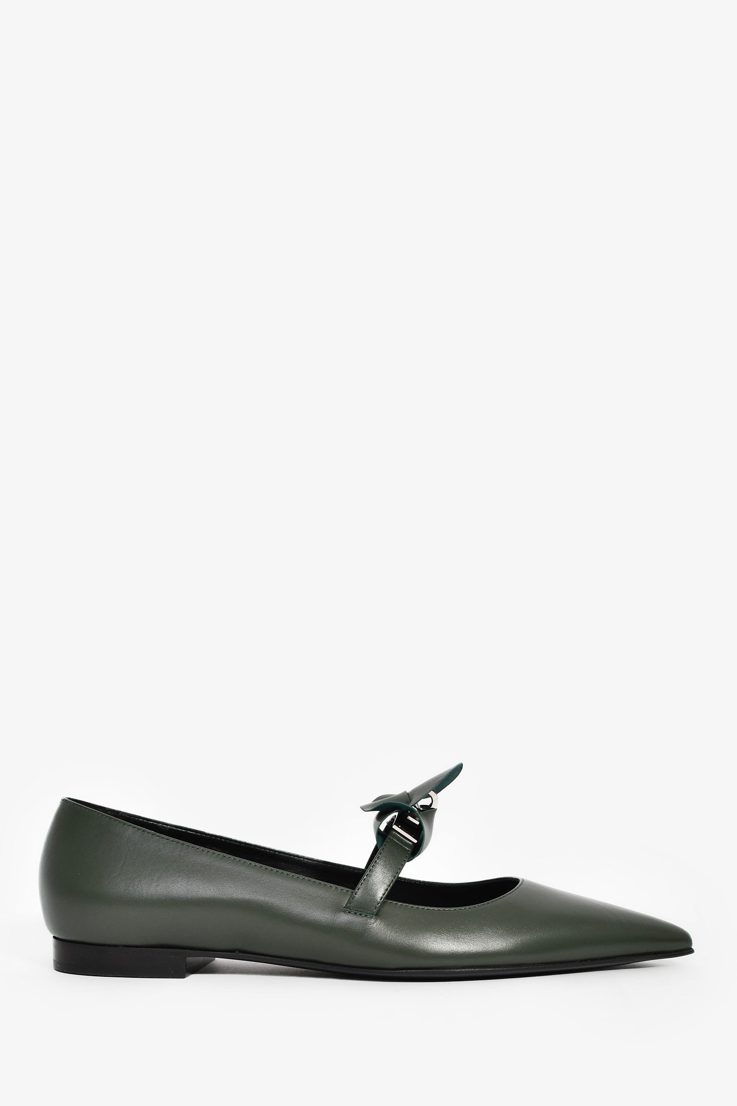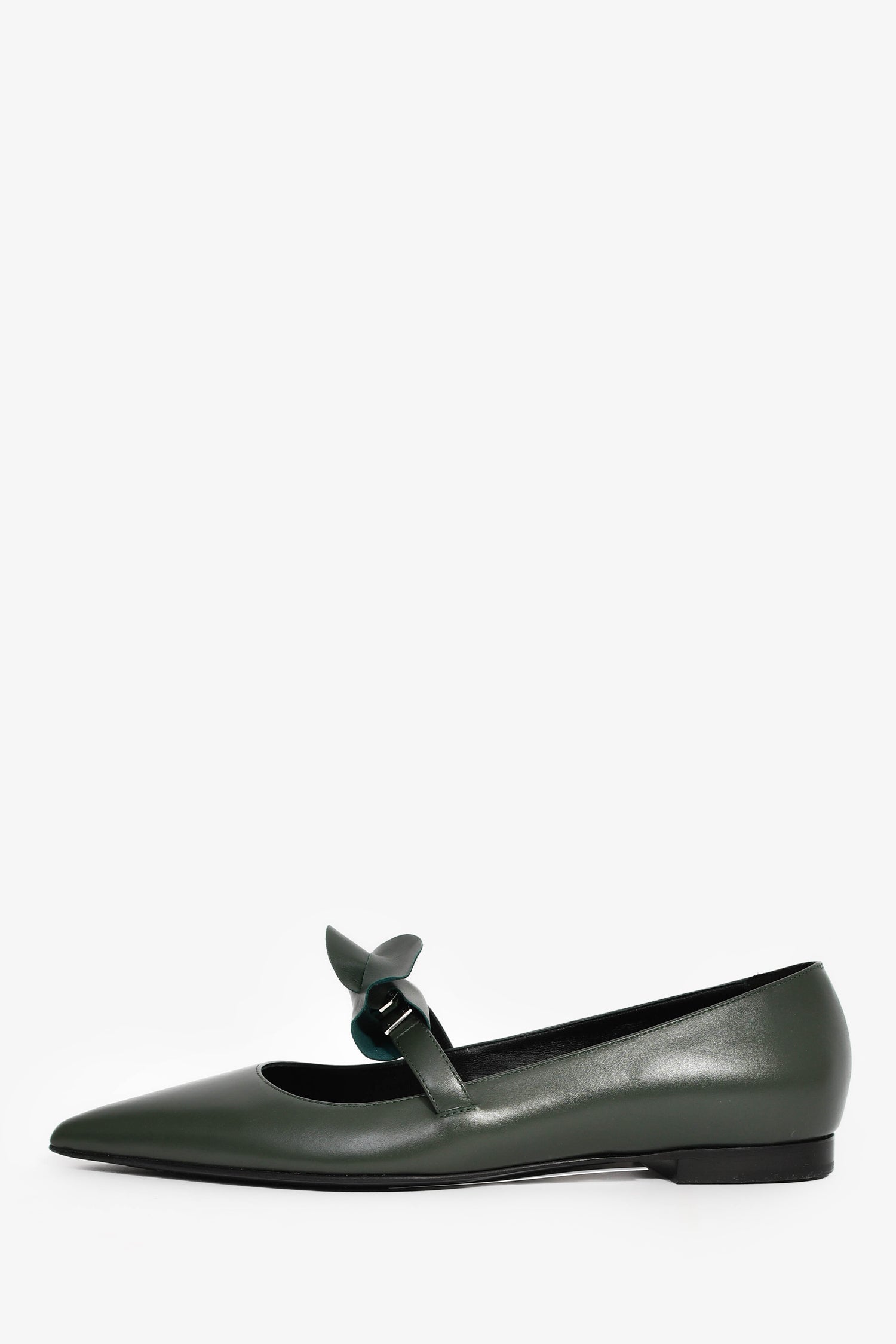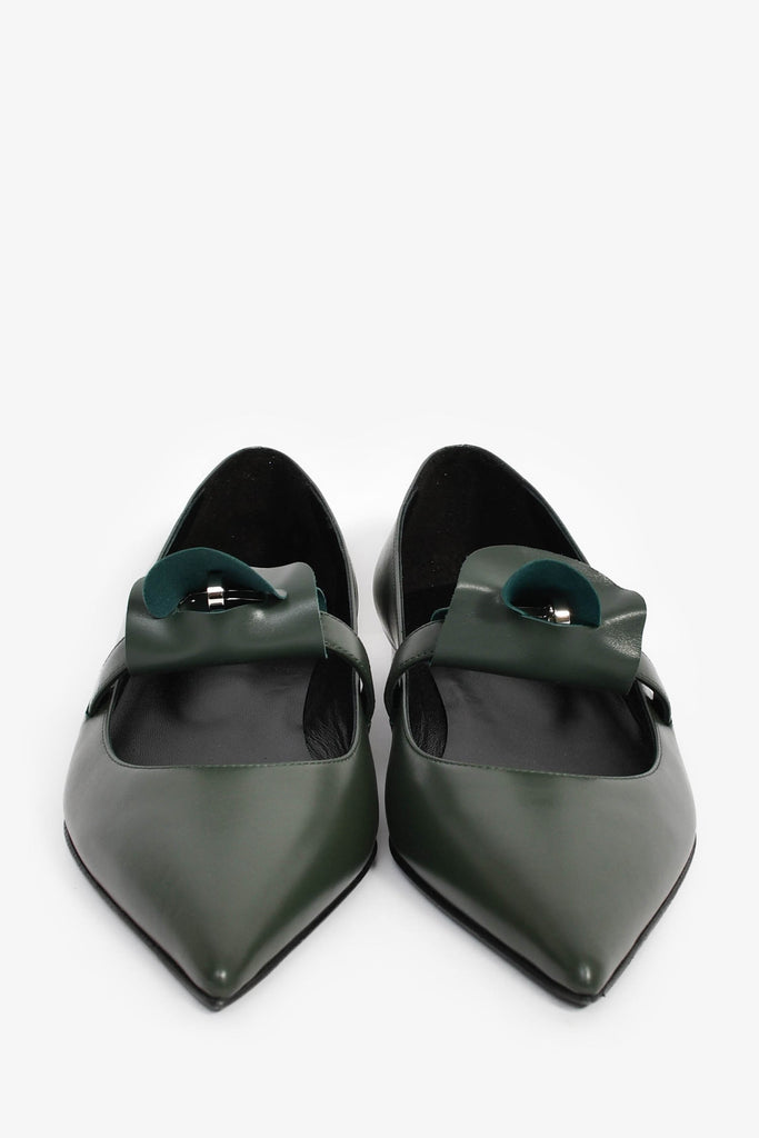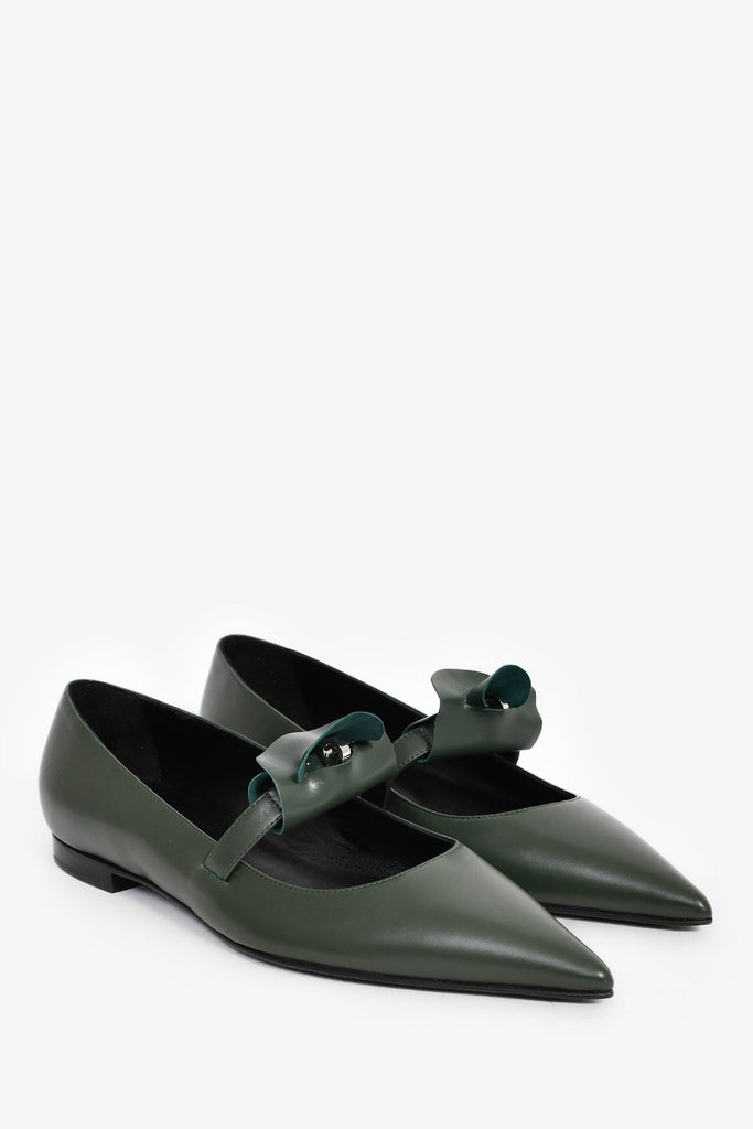 Hermes Green Leather Kelly Mary Jane Flats. Slip-on. Pointed toe. Leather interior. Tonal stitching.