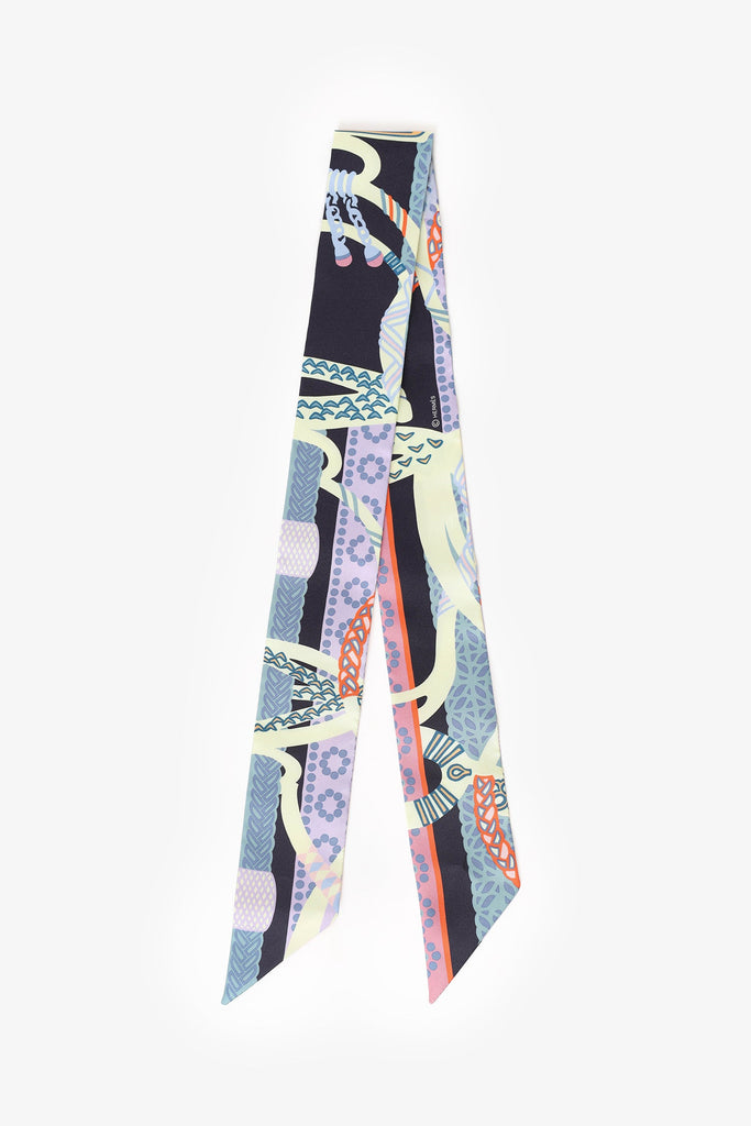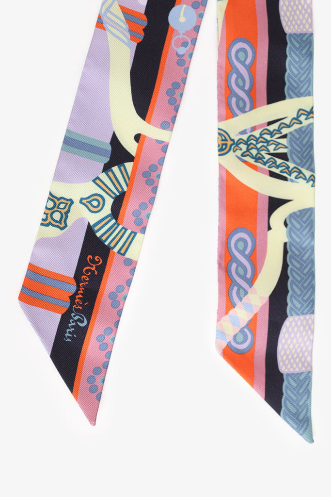Hermès Multicolour Fantaisie d'Etriers Twilly Scarf. Tonal stitching.