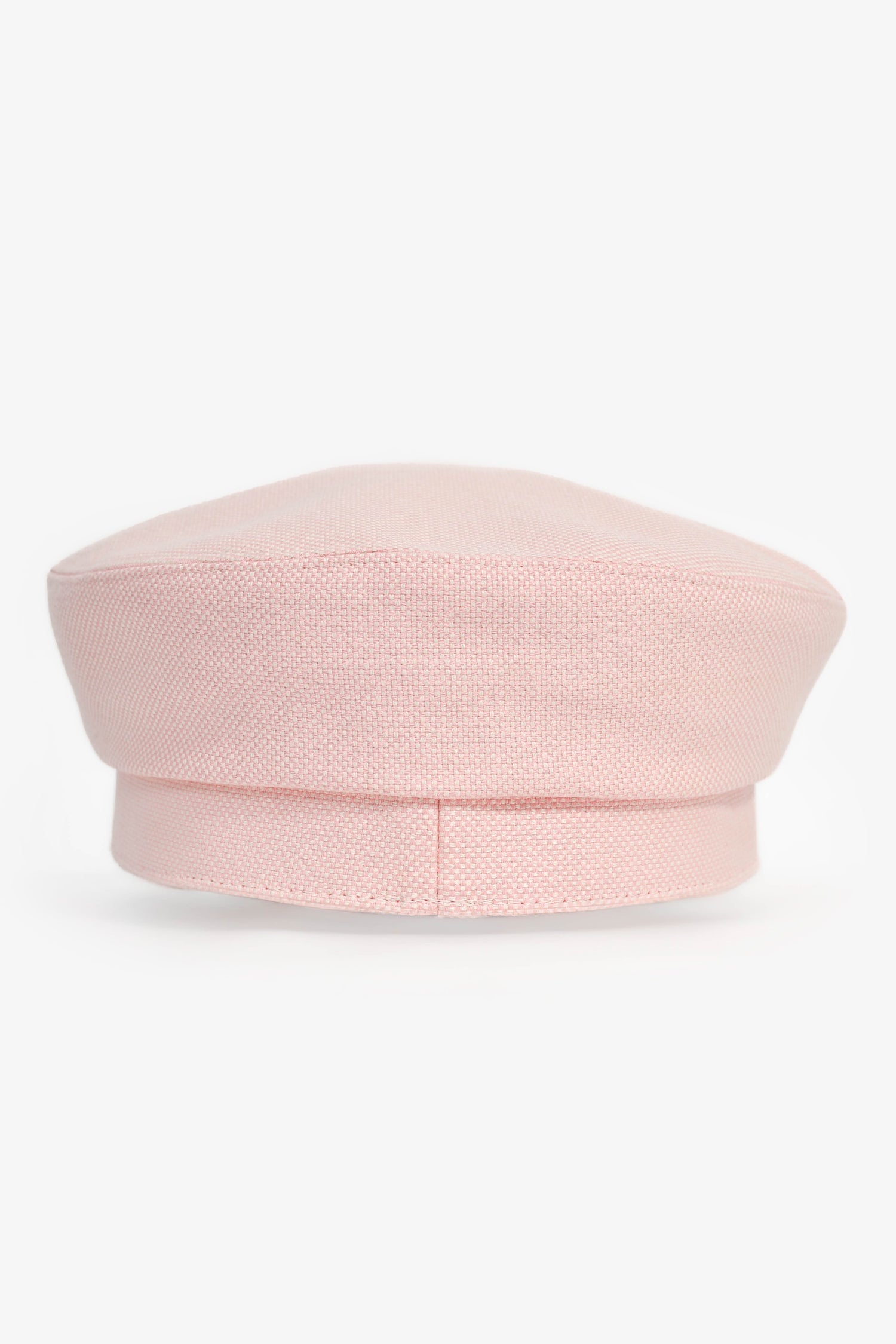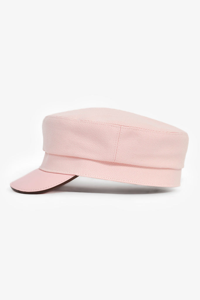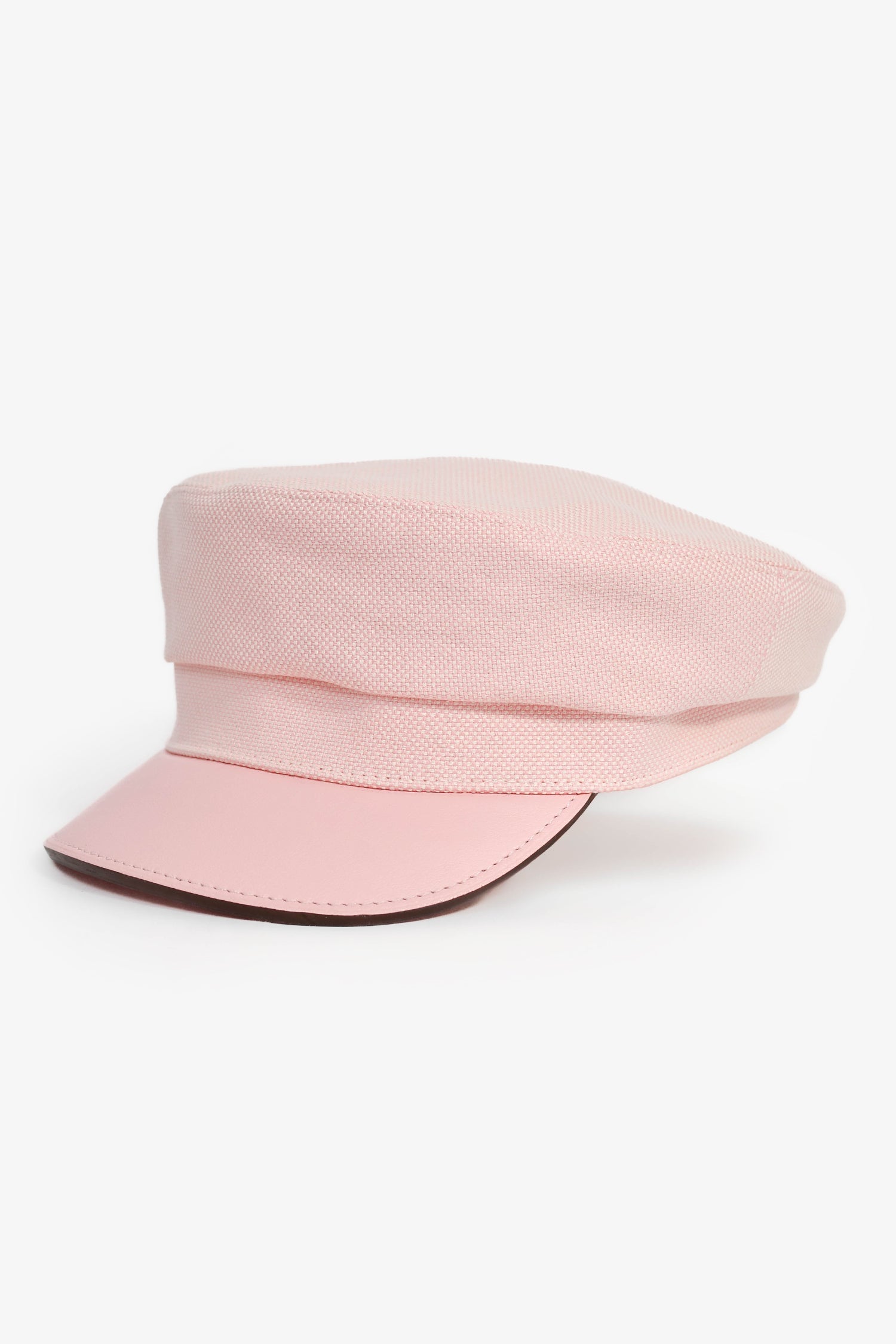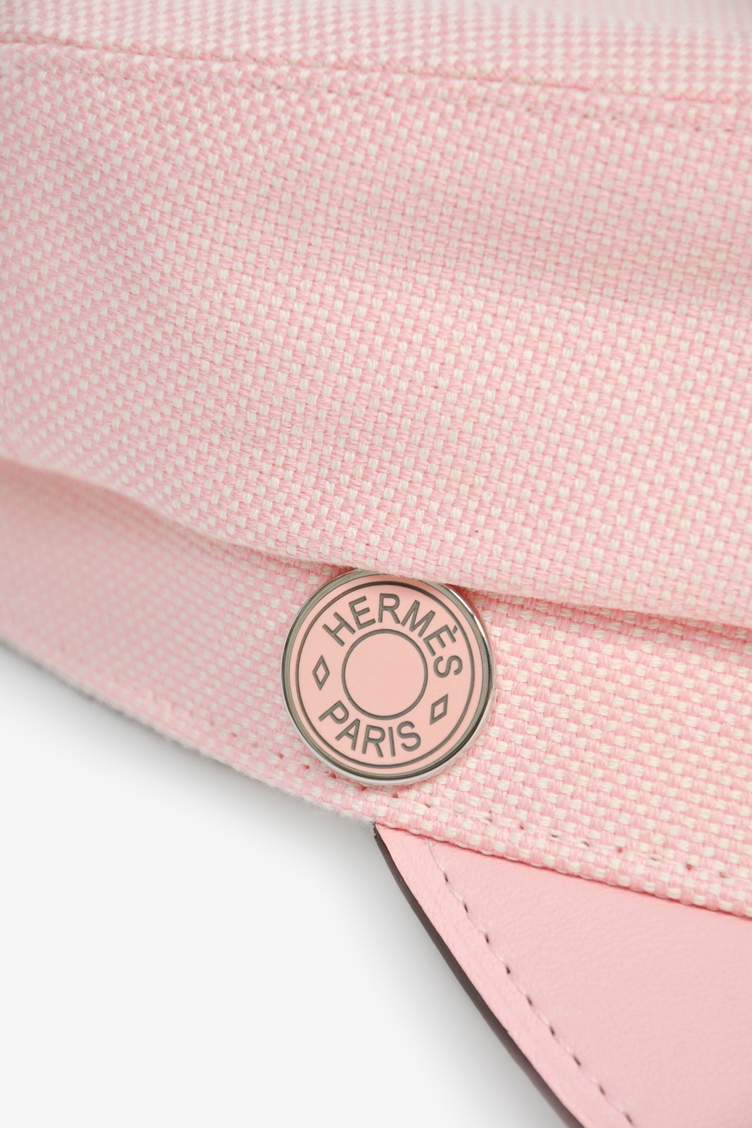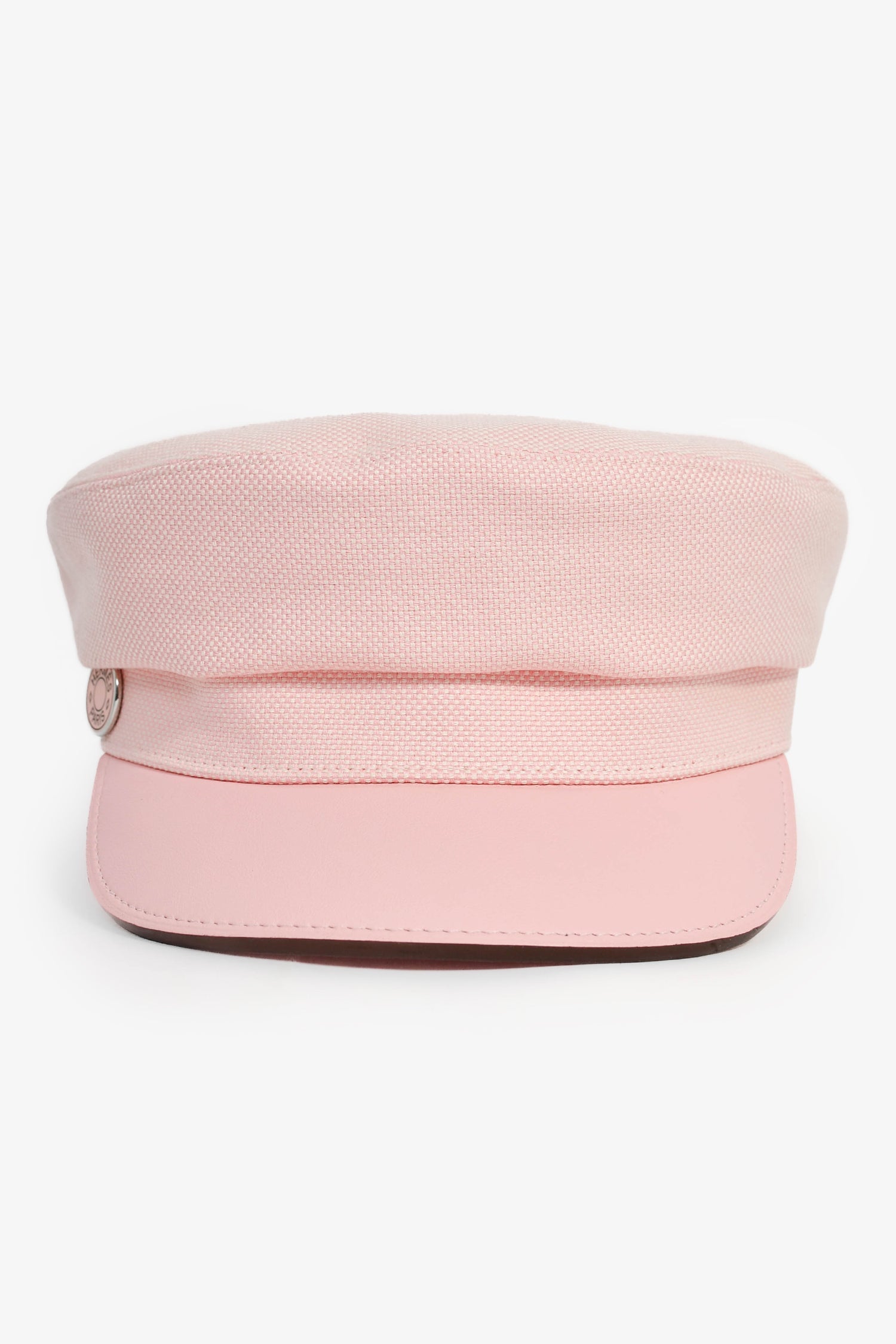 Hermes Pink Cotton Blend Newsboy Hat. Grosgrain band. Lined interior. Leather visor. Silver and pink-tone logo detail. Tonal stitching.