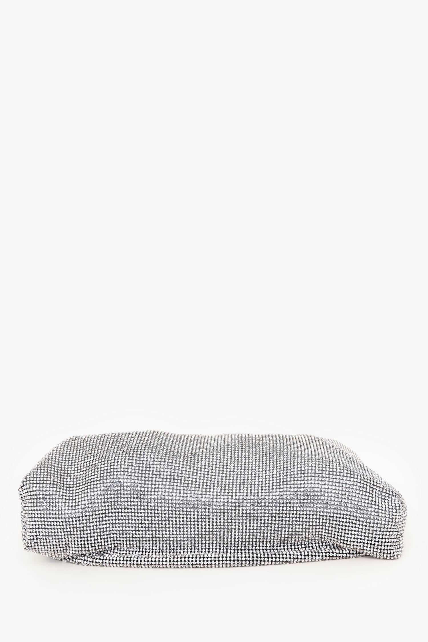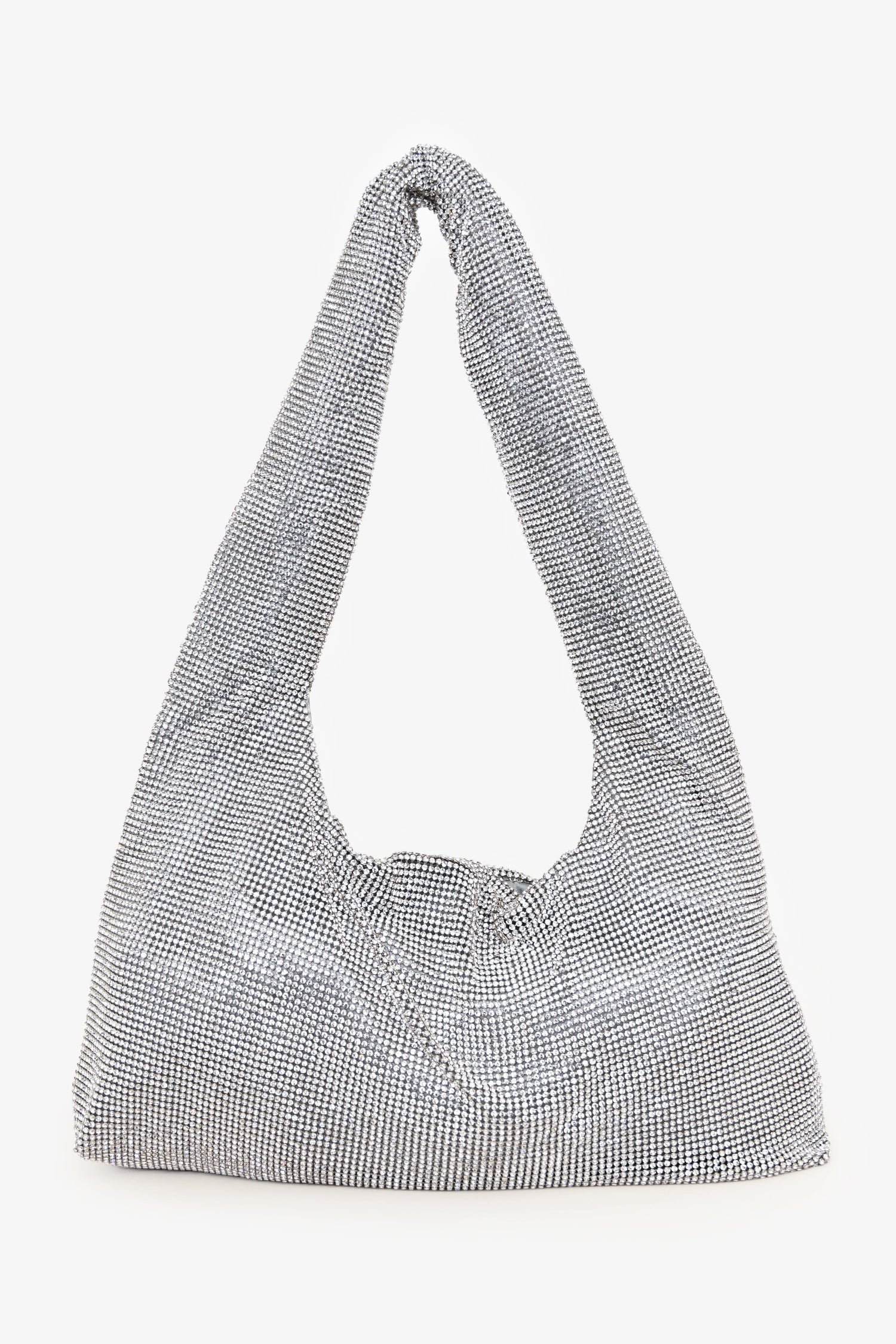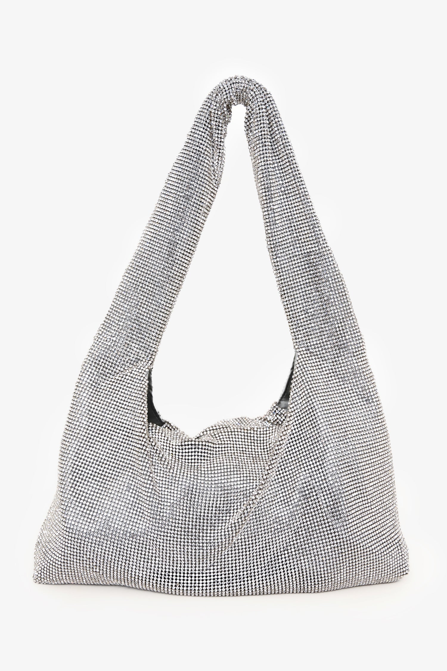 Kara Crystal Mesh Armpit Shoulder Bag. Top magnetic closure. Single interior compartment. Textile-lined interior. Tonal stitching.