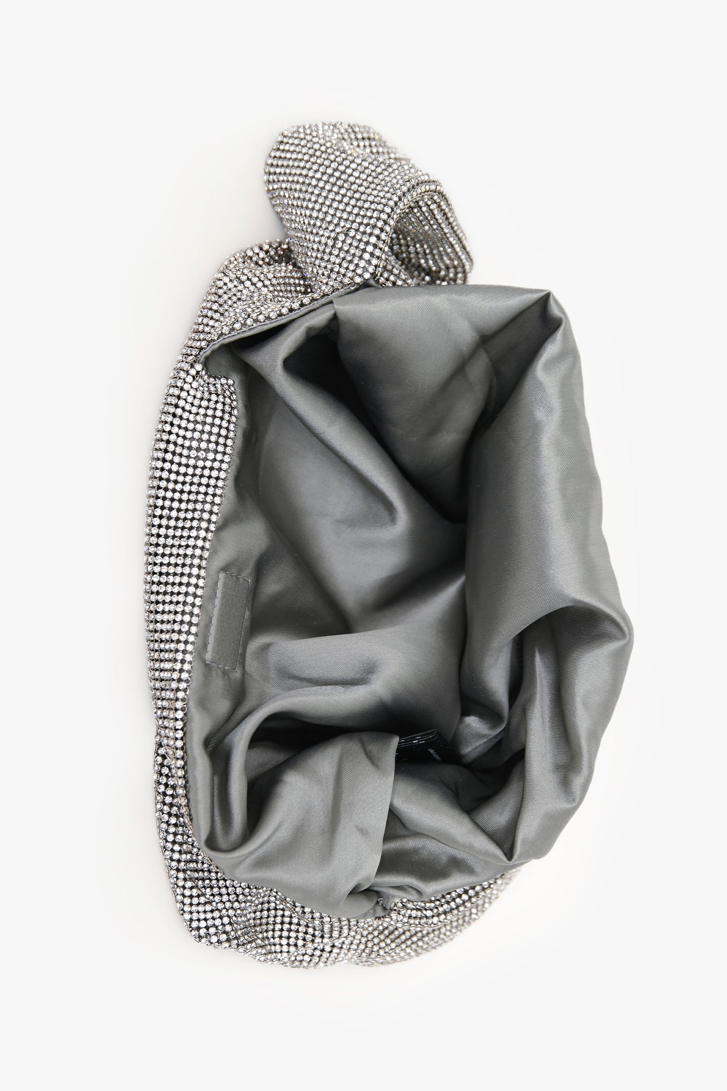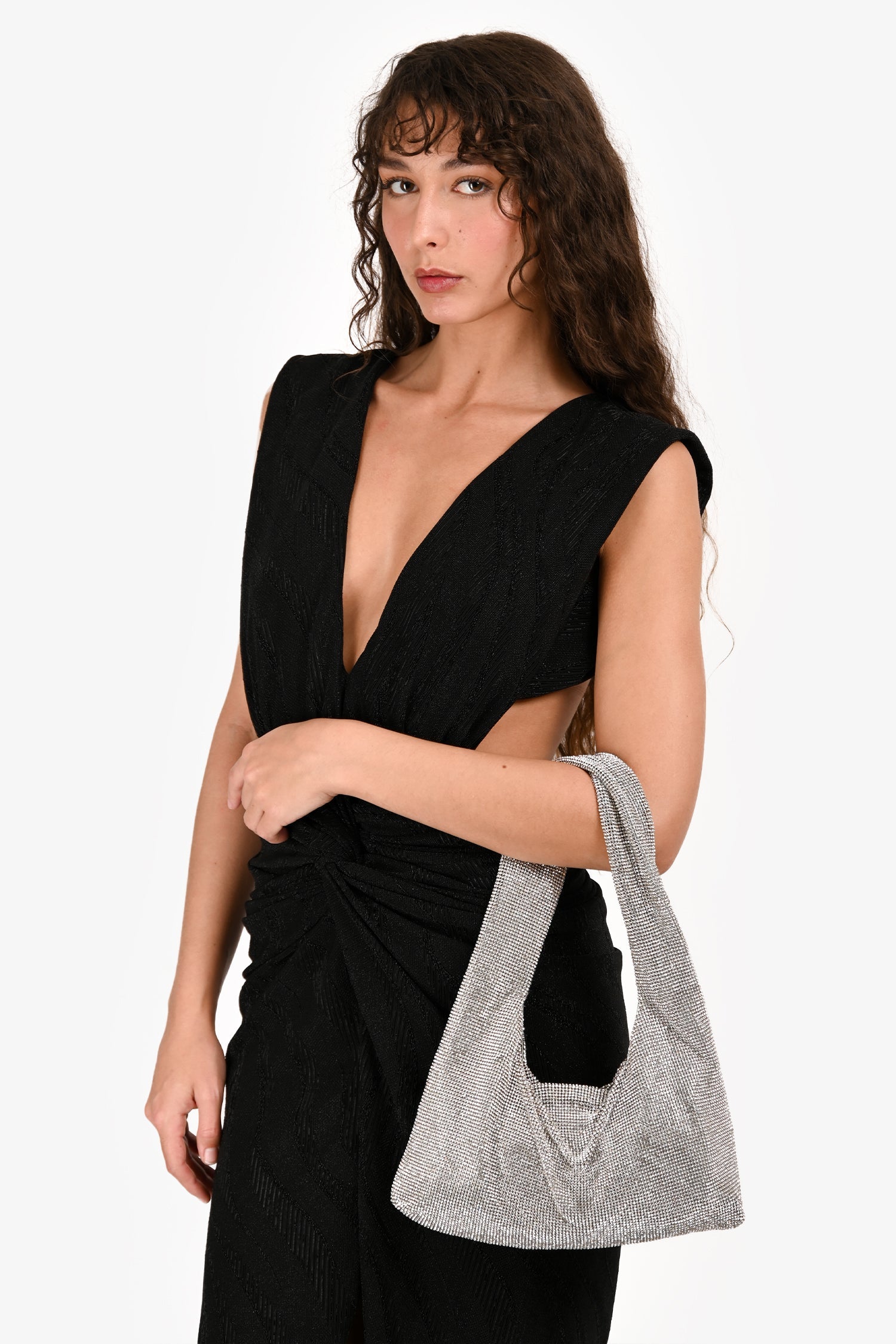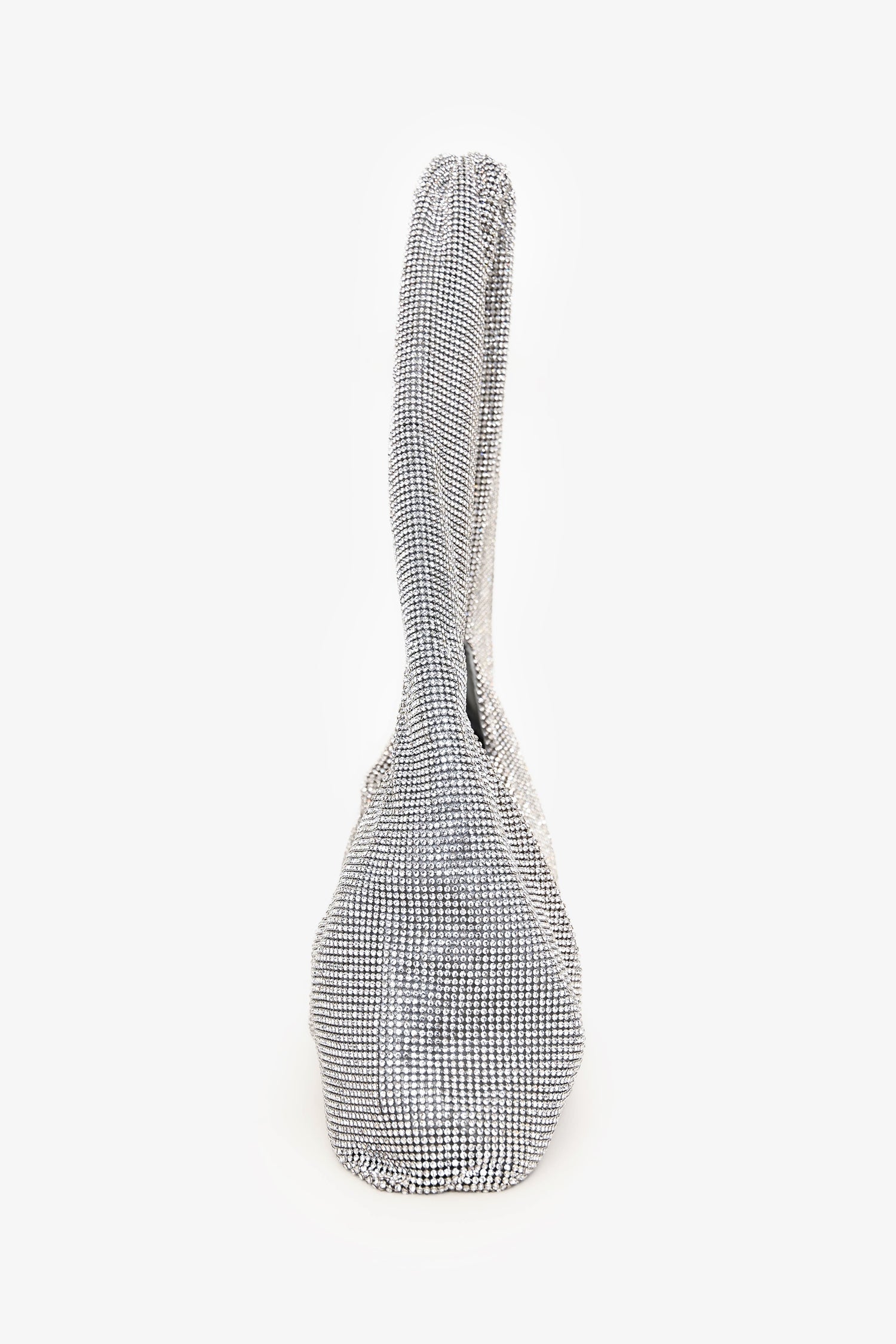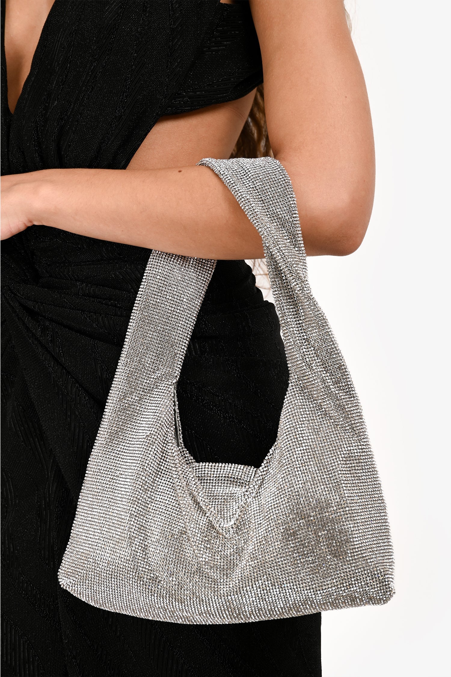 Kara Crystal Mesh Armpit Shoulder Bag. Top magnetic closure. Single interior compartment. Textile-lined interior. Tonal stitching.