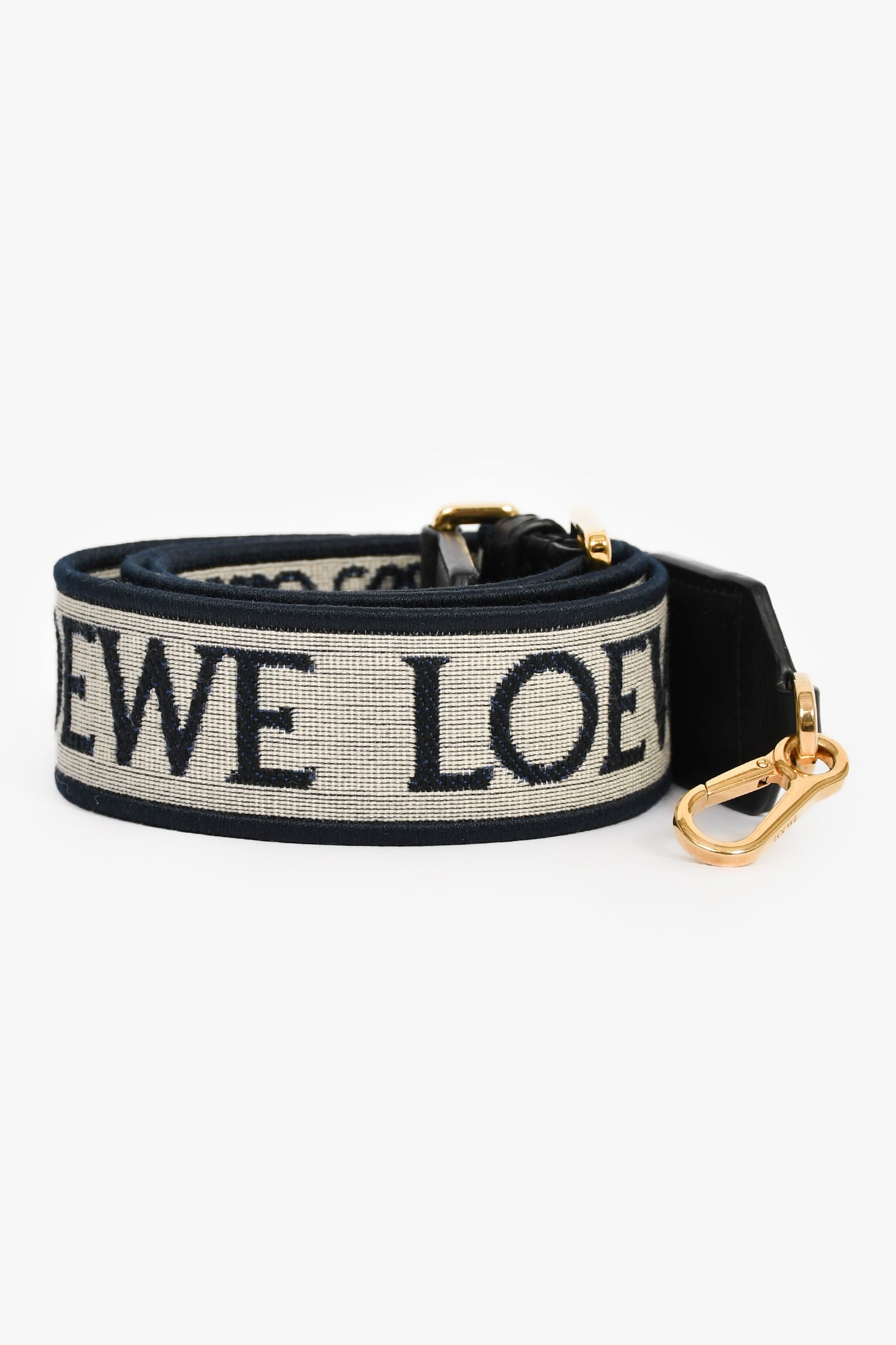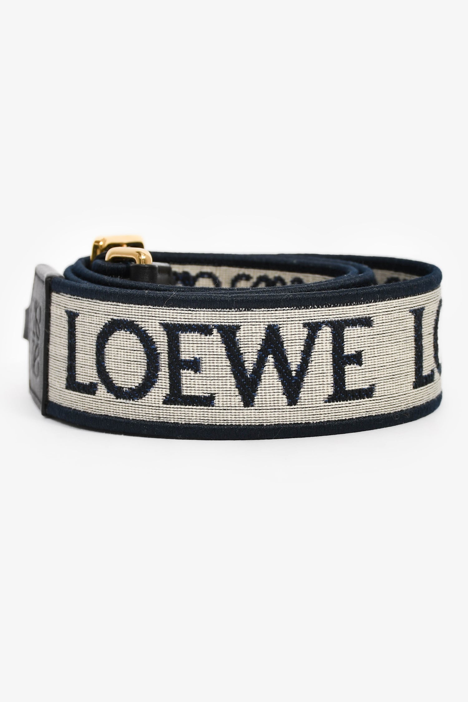 Loewe Navy Leather/Jacquard Anagram Bag Strap. Lobster clasp closure on either end. Gold-tone hardware. Tonal stitching.