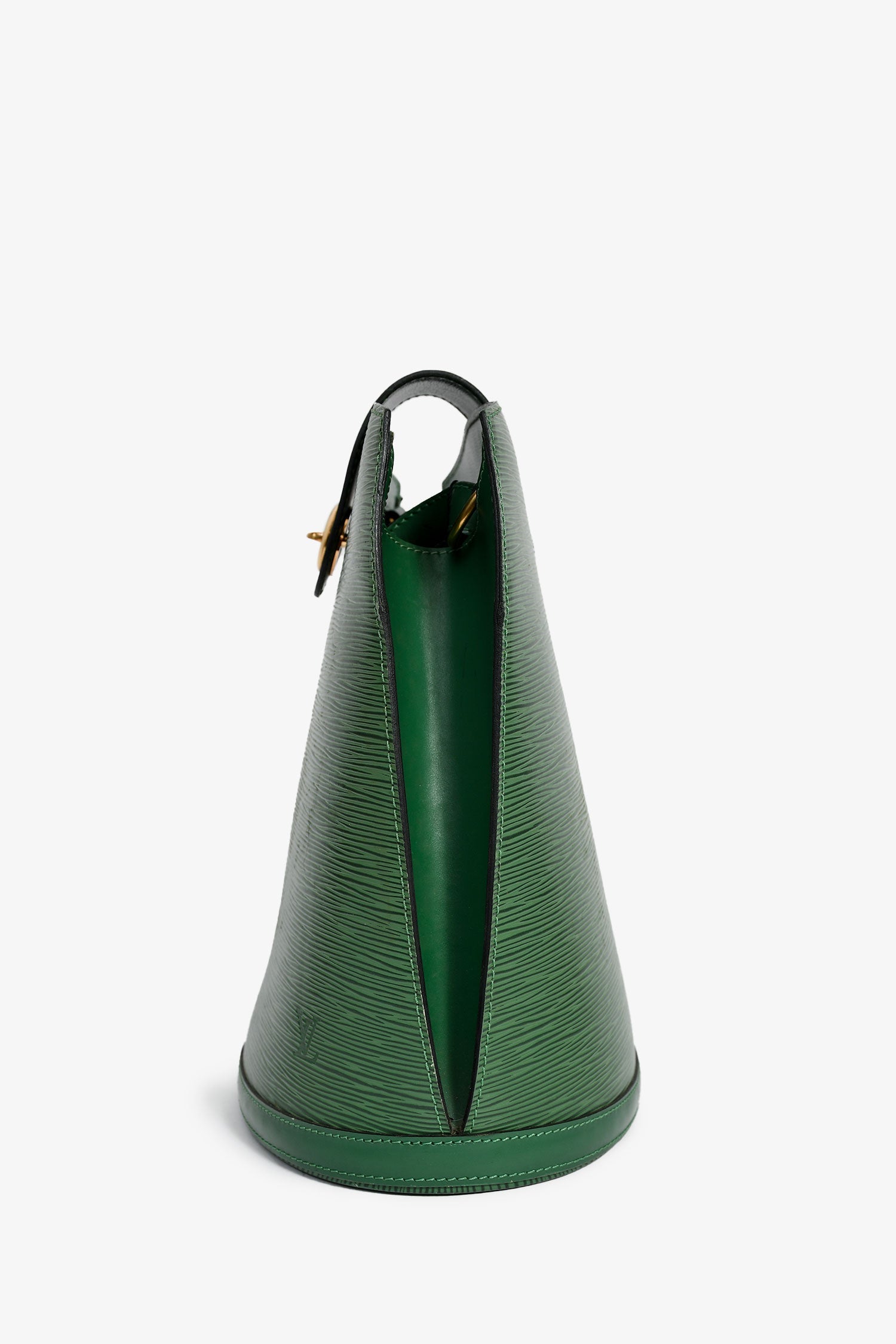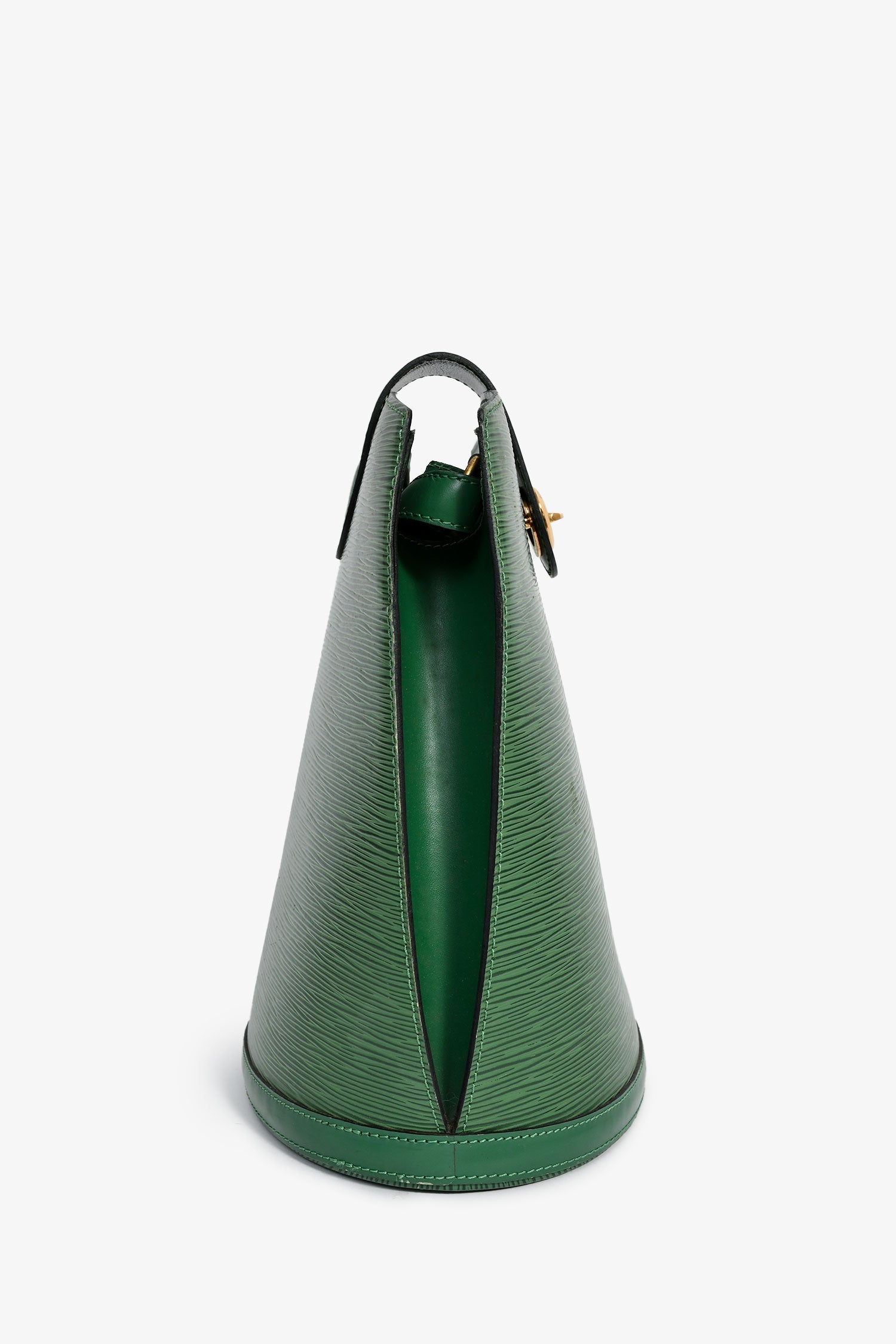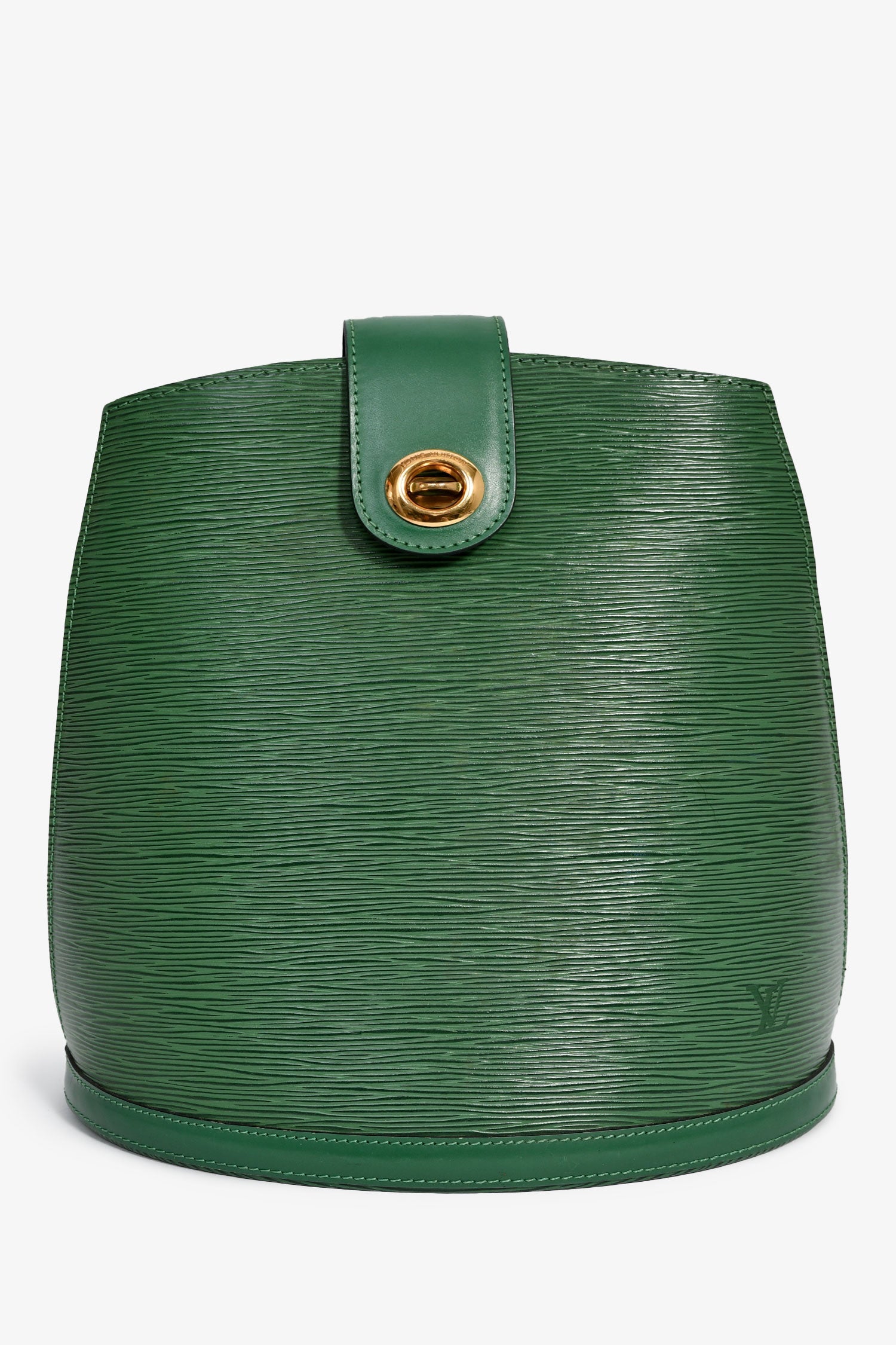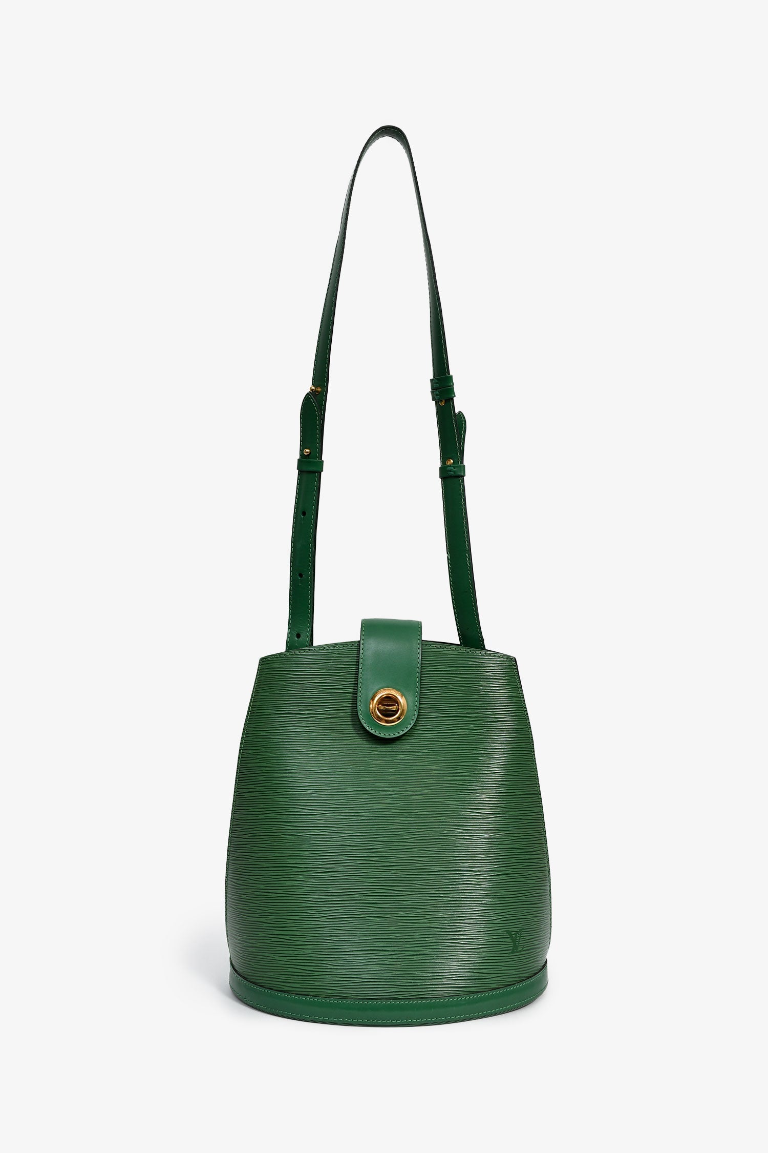 Louis Vuitton 1995 Green Epi Leather 'Cluny' Shoulder Bag. Fold-over strap with a turn-lock closure. Adjustable shoulder strap. Suede-lined interior with a slip compartment. Gold-tone hardware. Tonal stitching.