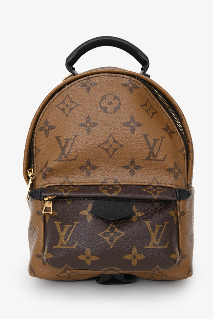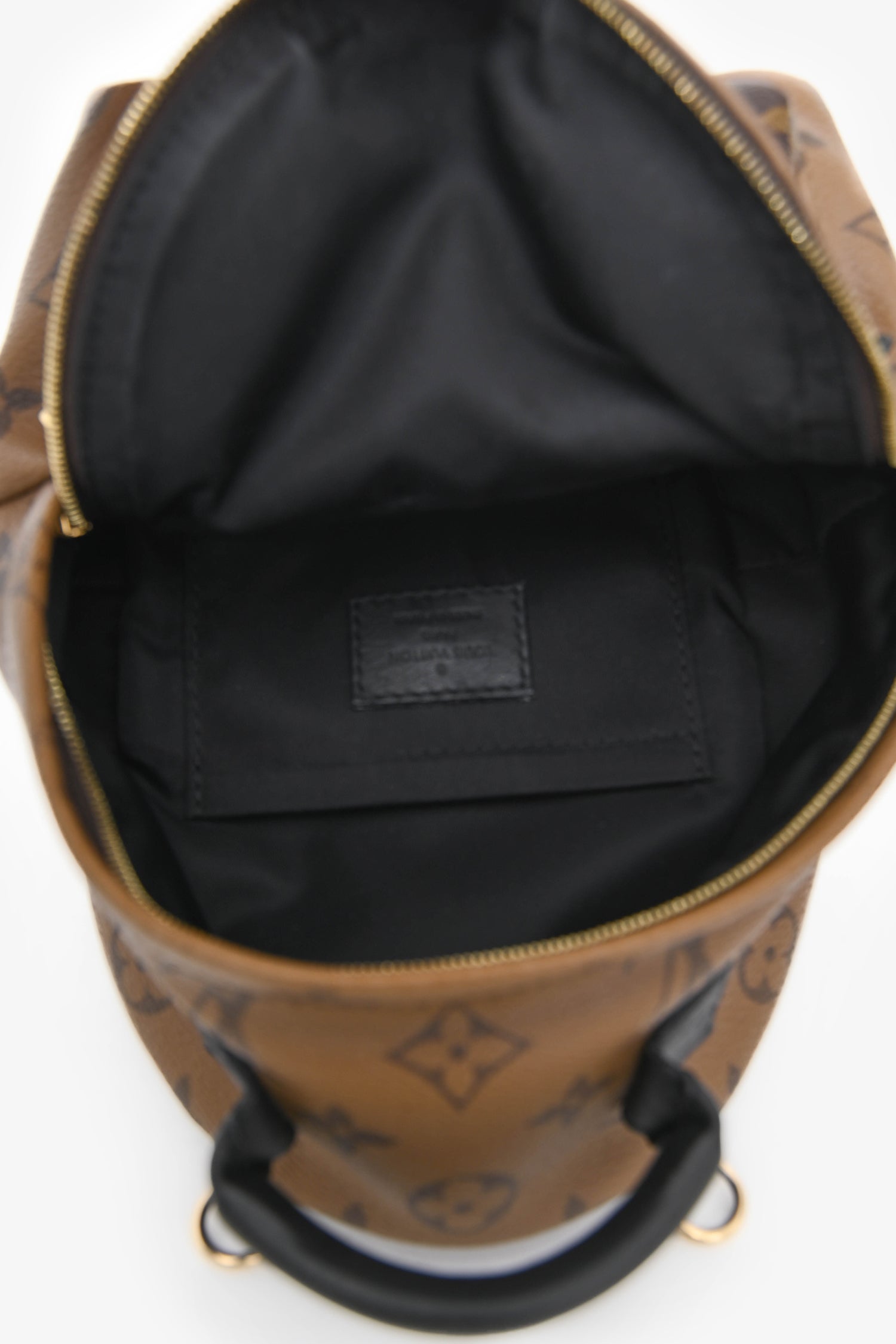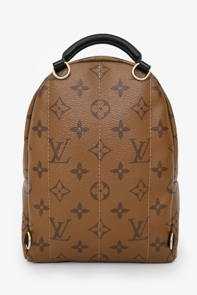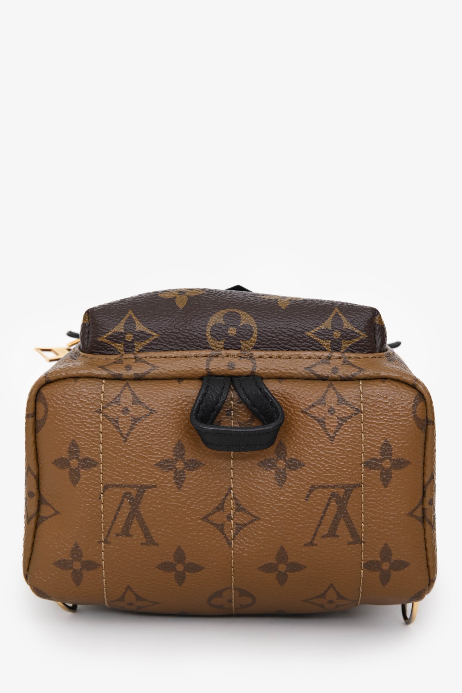 Louis Vuitton 2017 Reverse Monogram Mini Palm Spring. Zip opening. Flat top handle and 2 shoulder straps. Exterior zip pocket. Lined interior with 1 pocket. Gold-tone hardware. Tonal stitching.