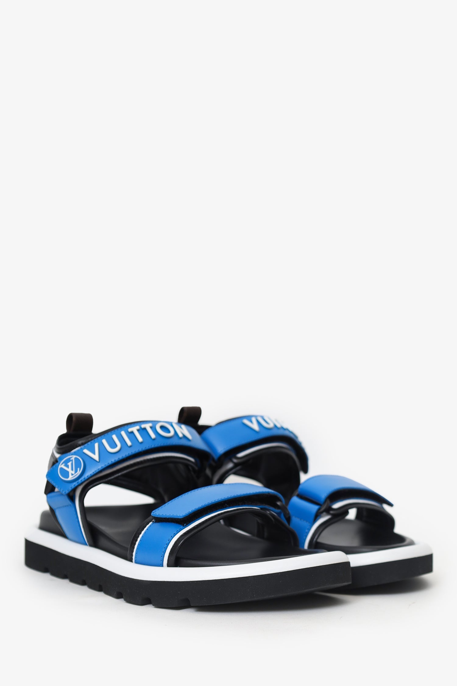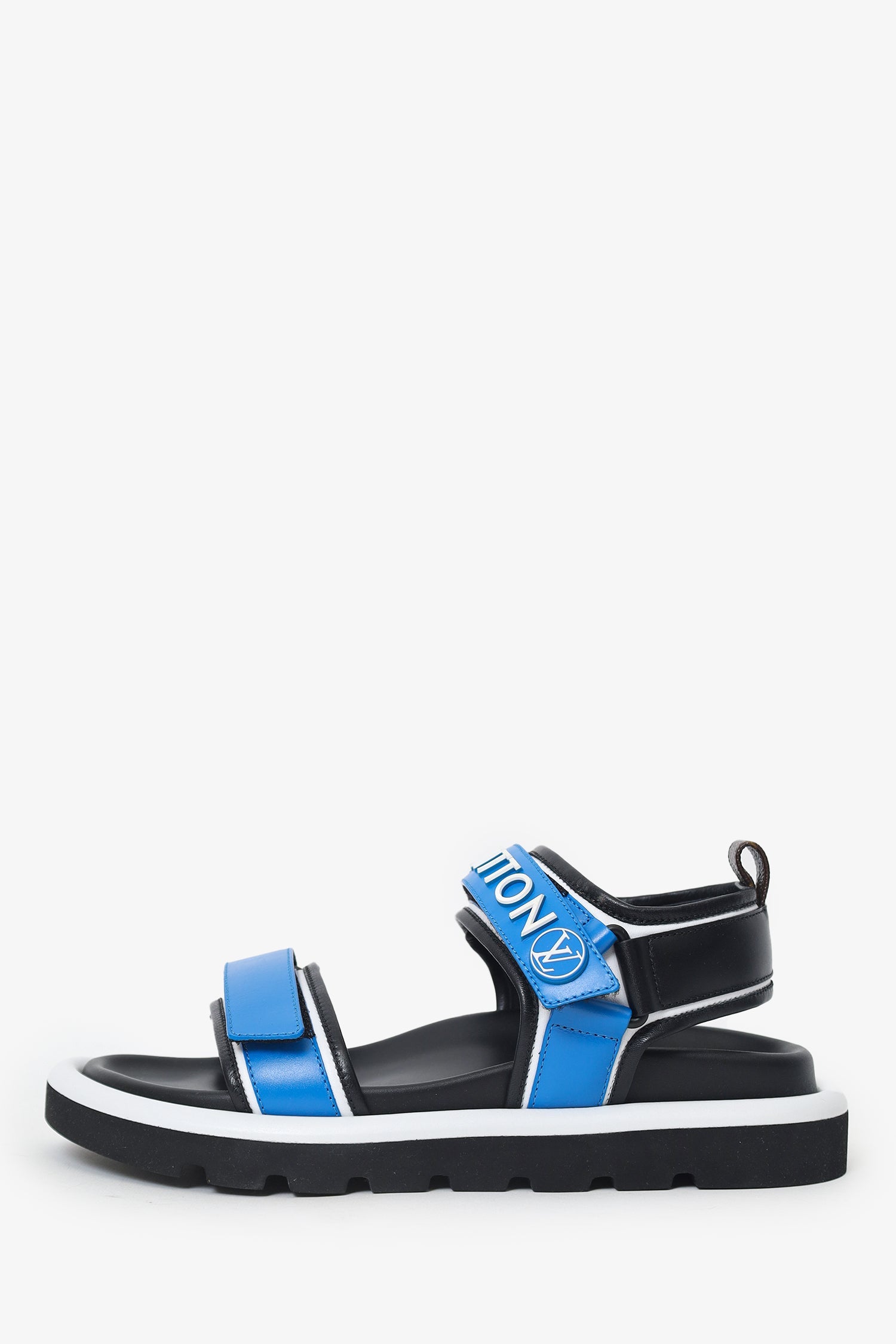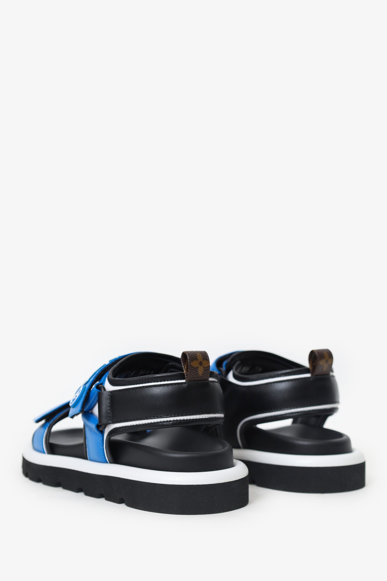 Louis Vuitton Black/Blue Pool Pillow Flat Comfort Sandals. Slip-on. Round open-toe. 2 adjustable velcro strap closure. Rear pull tab. Tonal stitching.