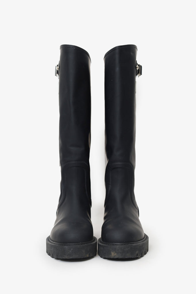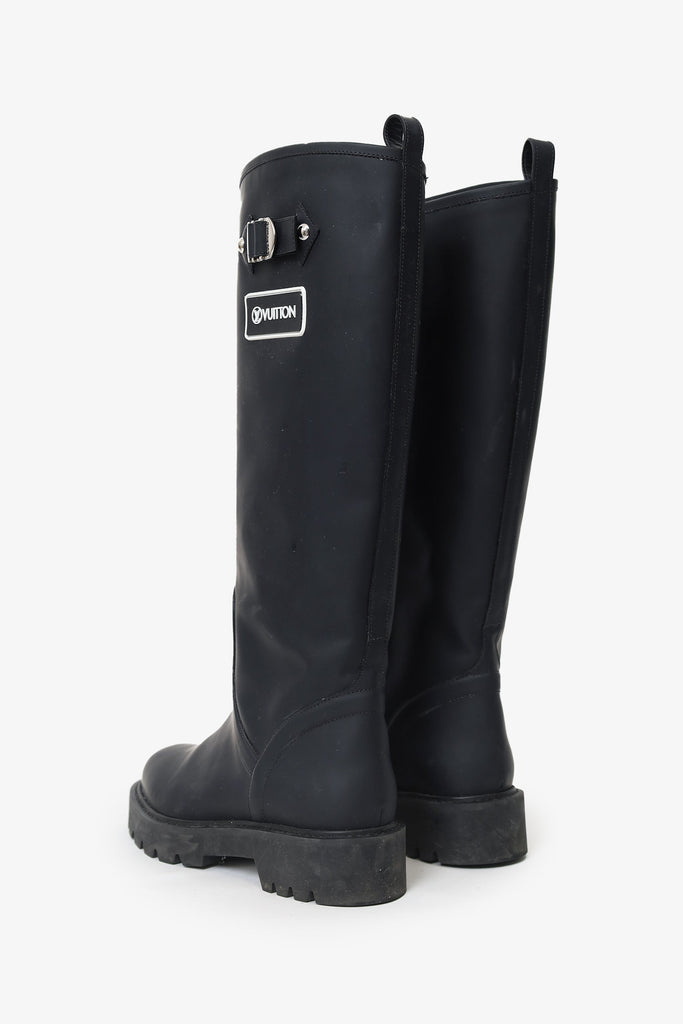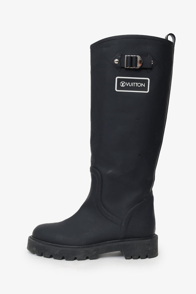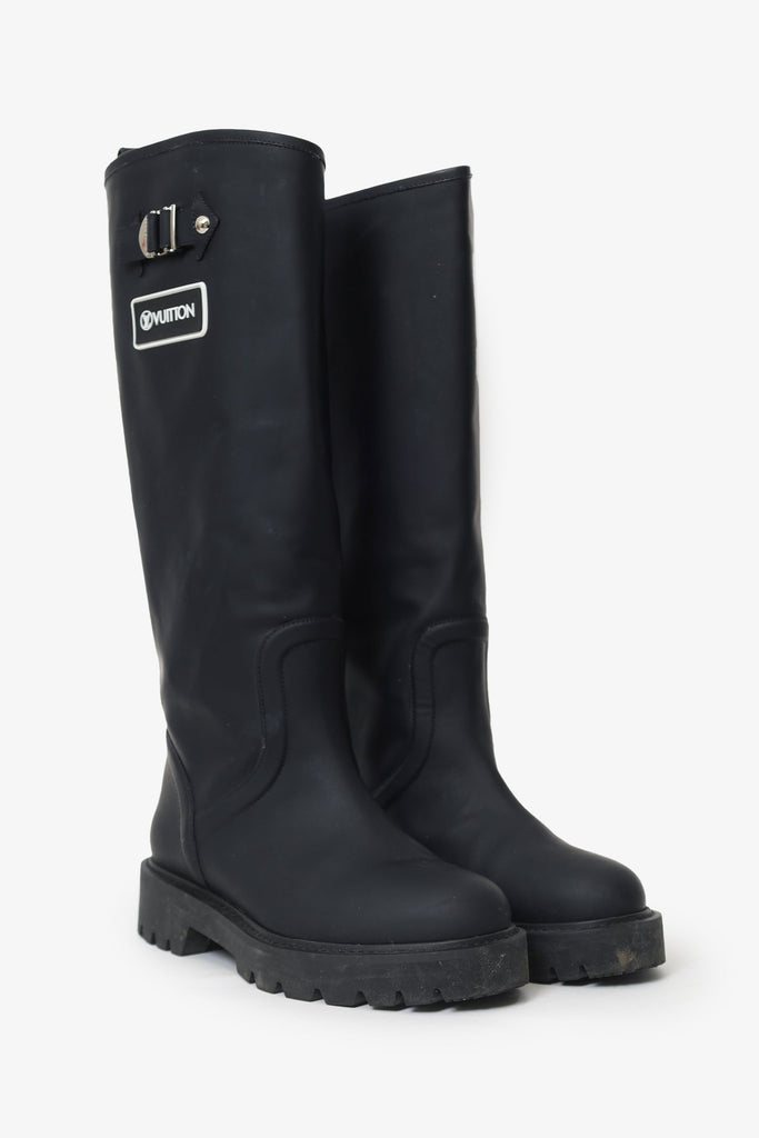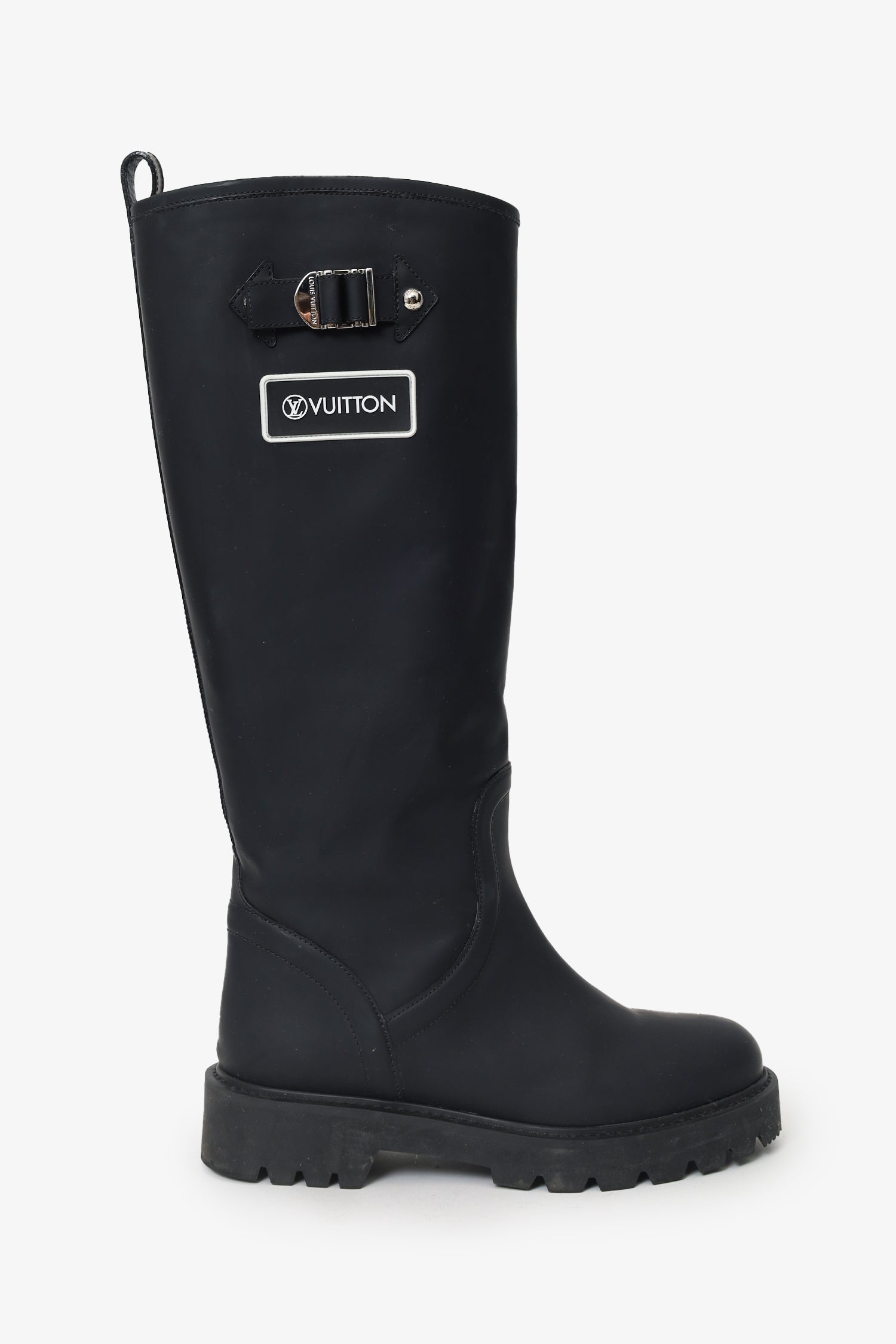 Louis Vuitton Black Rubber Calfskin Territory Flat Boots. Pull-on. Round toe. Side buckle detail. Rear pull tab. Lined interior. Silver-tone hardware. Tonal stitching.