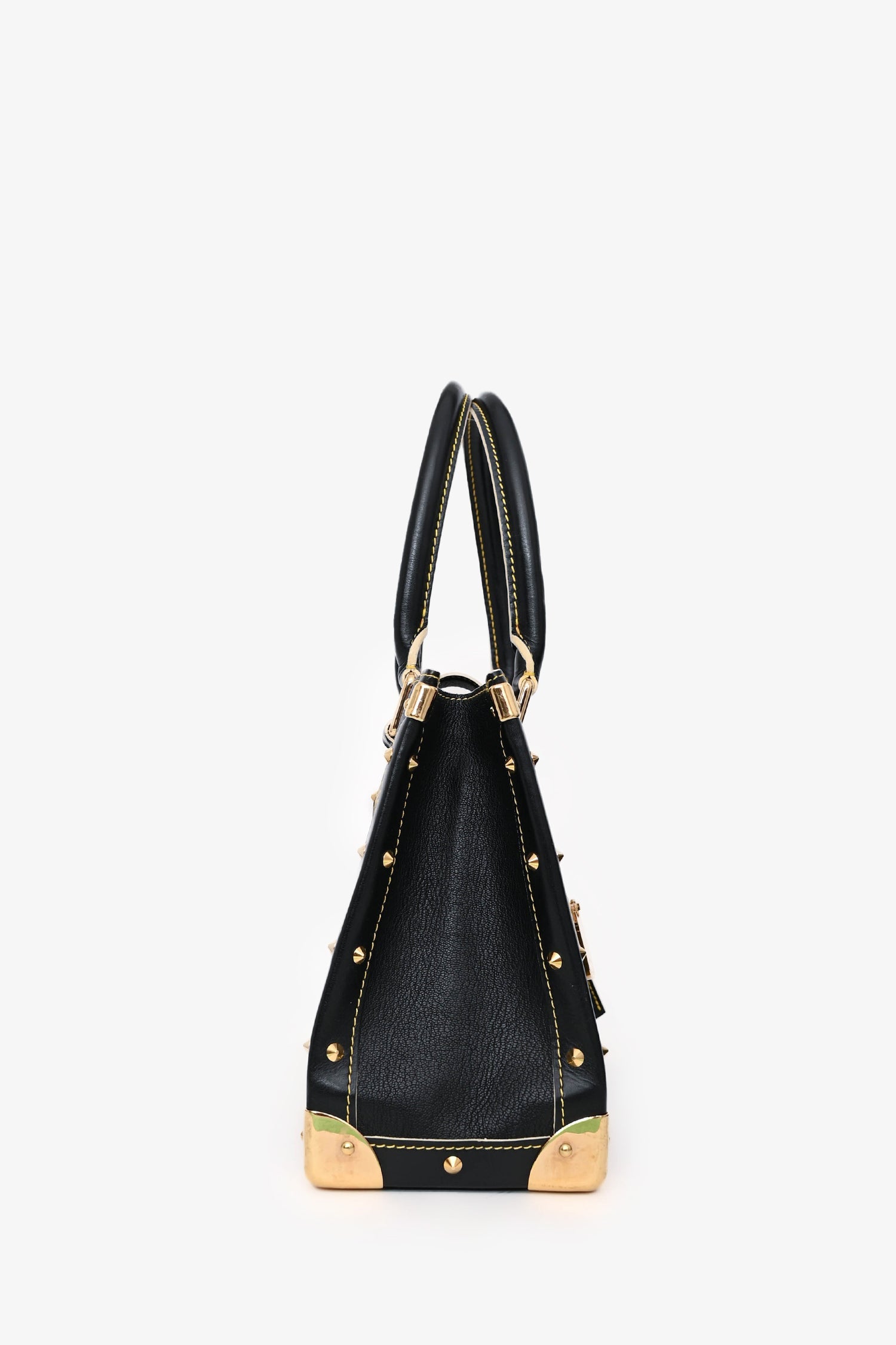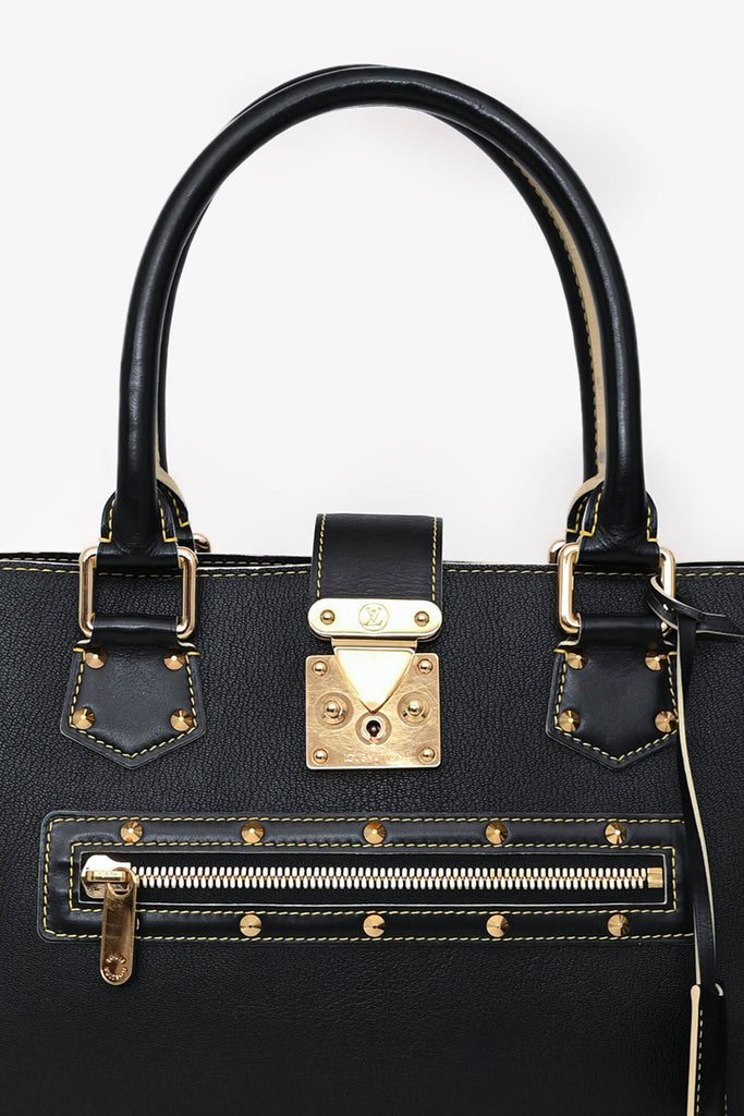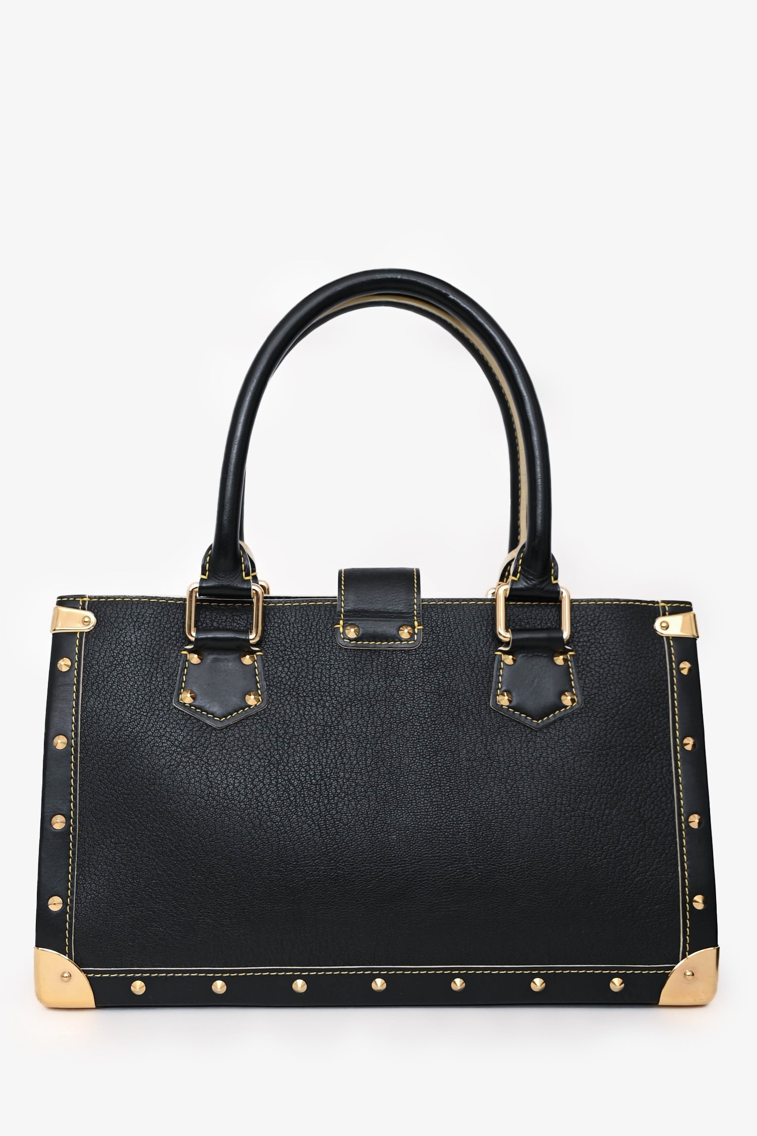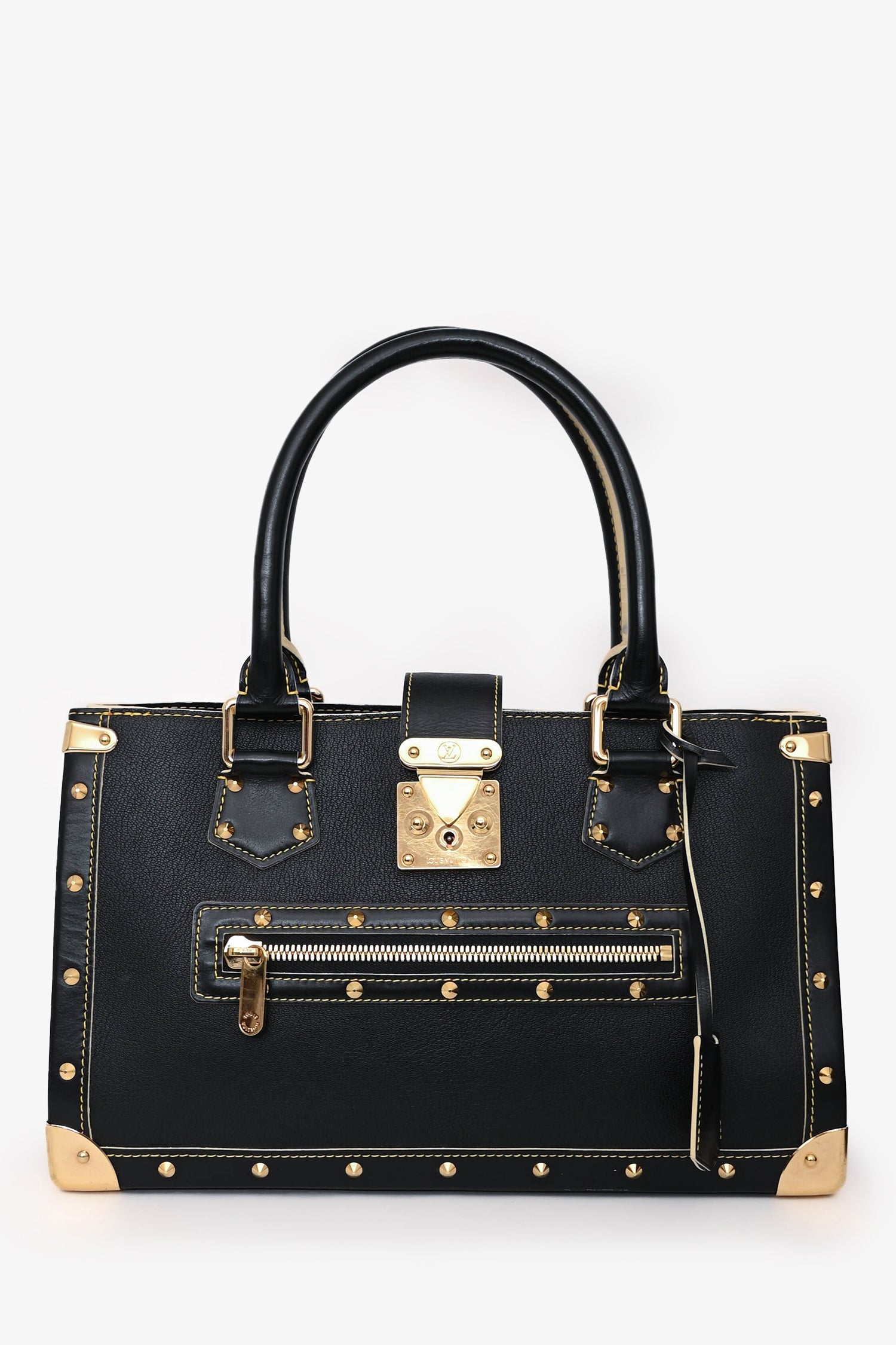 Louis Vuitton Black Suhali Leather Le Fabuleux Tote. Dual handles. Top fold-over strap with pinch-lock closure. Detachable clochette. Front zip pocket. Textile-lined interior. 3 interior compartments; 2 open, 1 with zip closure. 2 interior wall slip pockets. Gold-tone hardware. Tonal stitching.