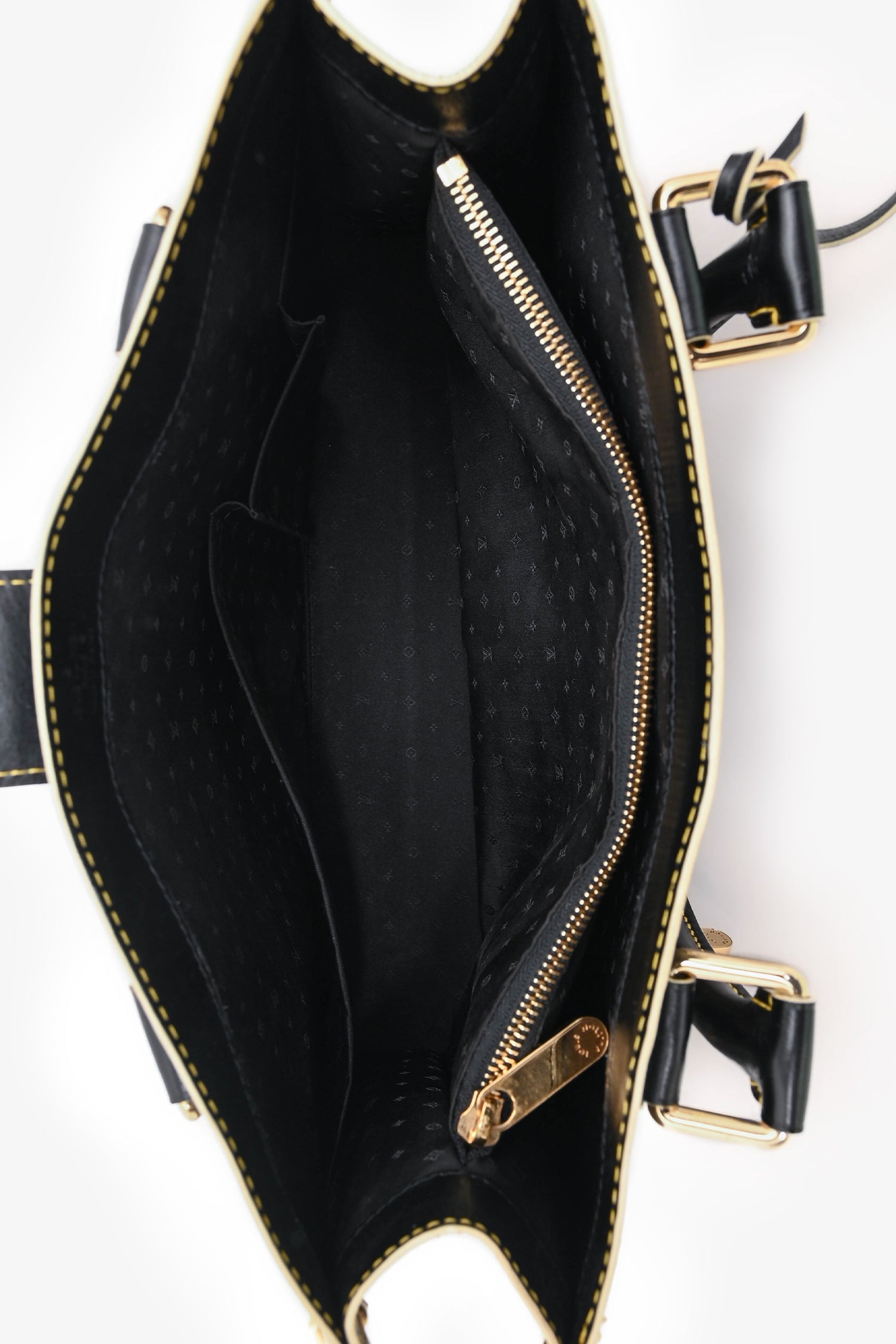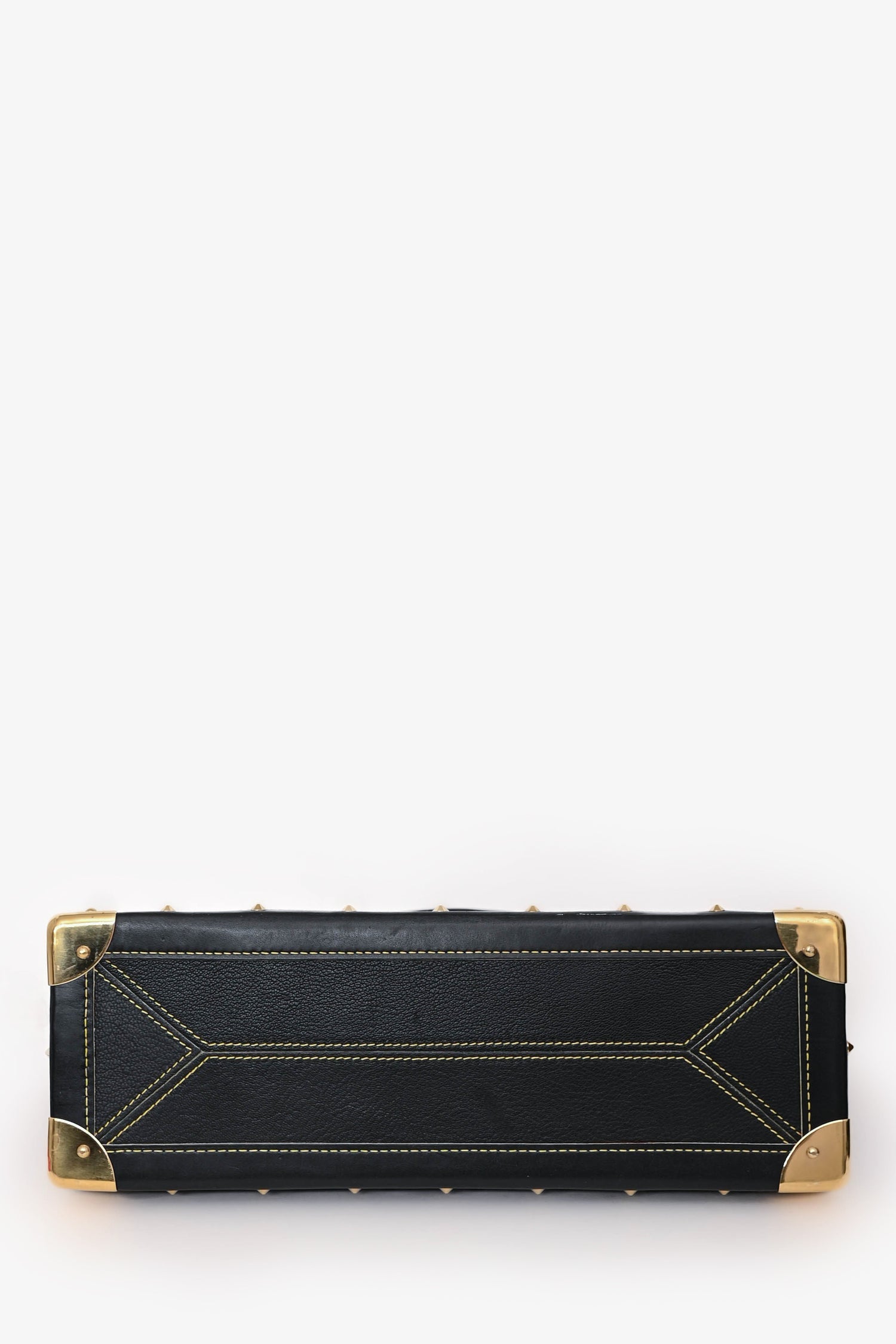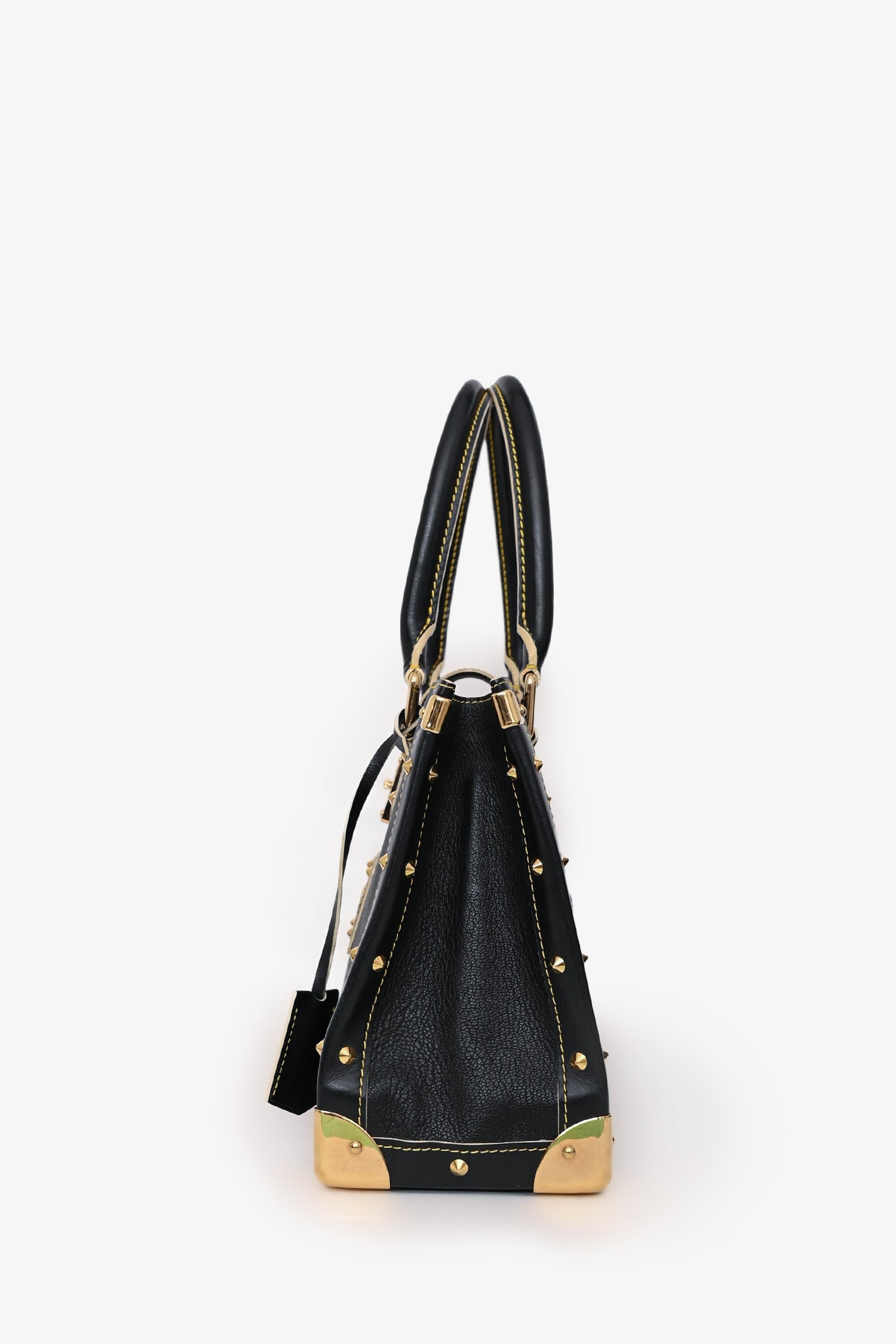 Louis Vuitton Black Suhali Leather Le Fabuleux Tote. Dual handles. Top fold-over strap with pinch-lock closure. Detachable clochette. Front zip pocket. Textile-lined interior. 3 interior compartments; 2 open, 1 with zip closure. 2 interior wall slip pockets. Gold-tone hardware. Tonal stitching.