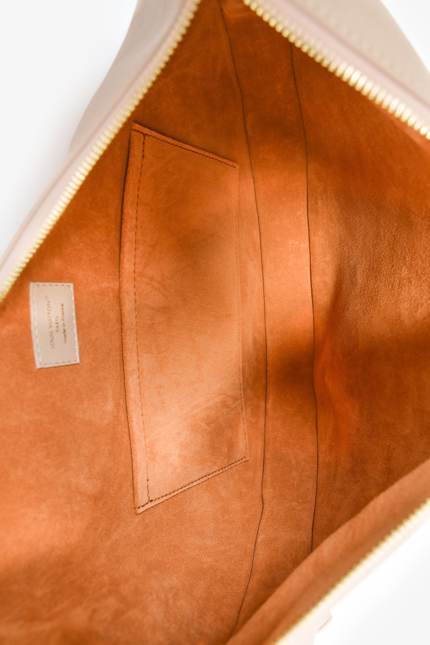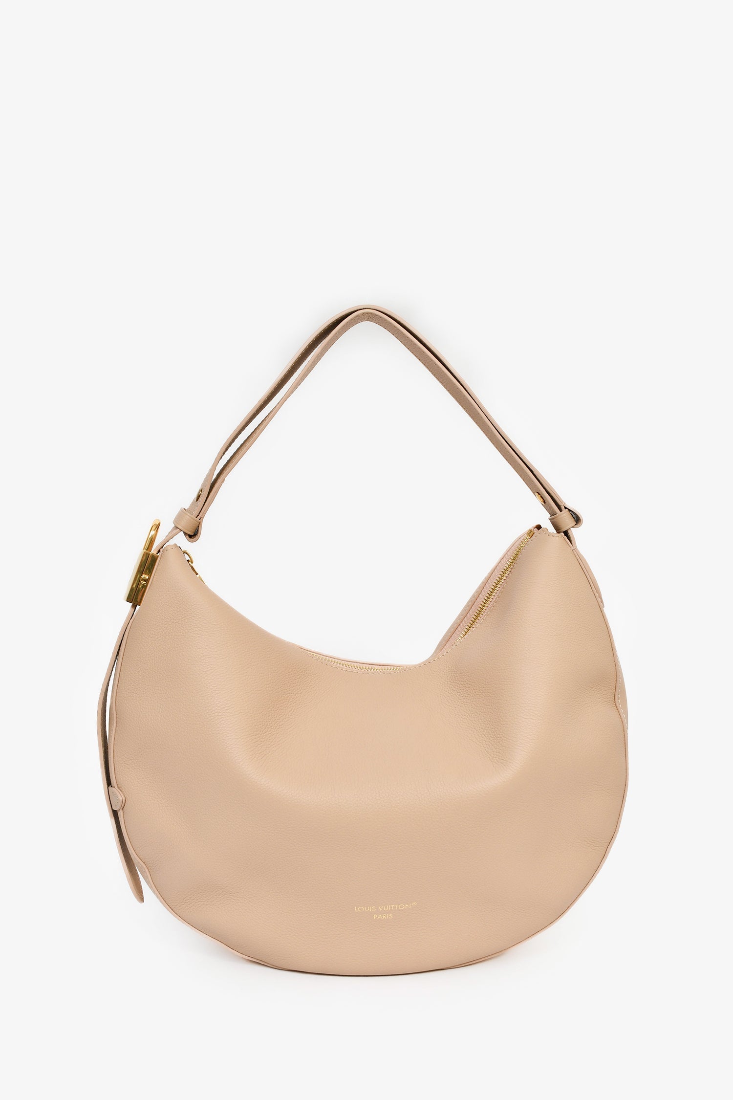 Louis Vuitton Blush Pink Leather 'Low Key Cookie' MM Shoulder Bag. Top zip closure. Adjustable shoulder strap. Suede-lined interior. Single interior wall slip pocket. Detachable monogram zip pouch. Gold-tone hardware. Tonal stitching.