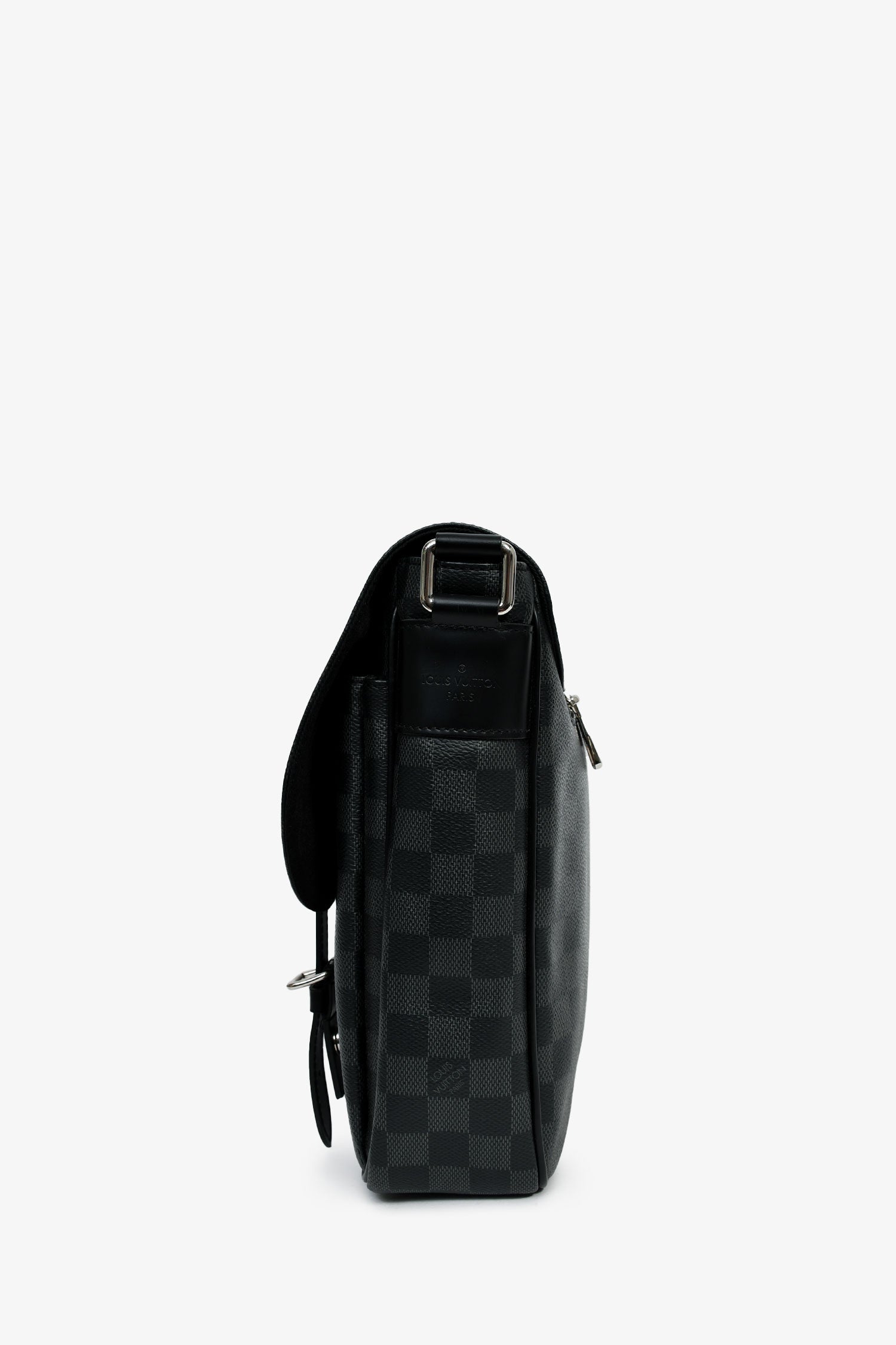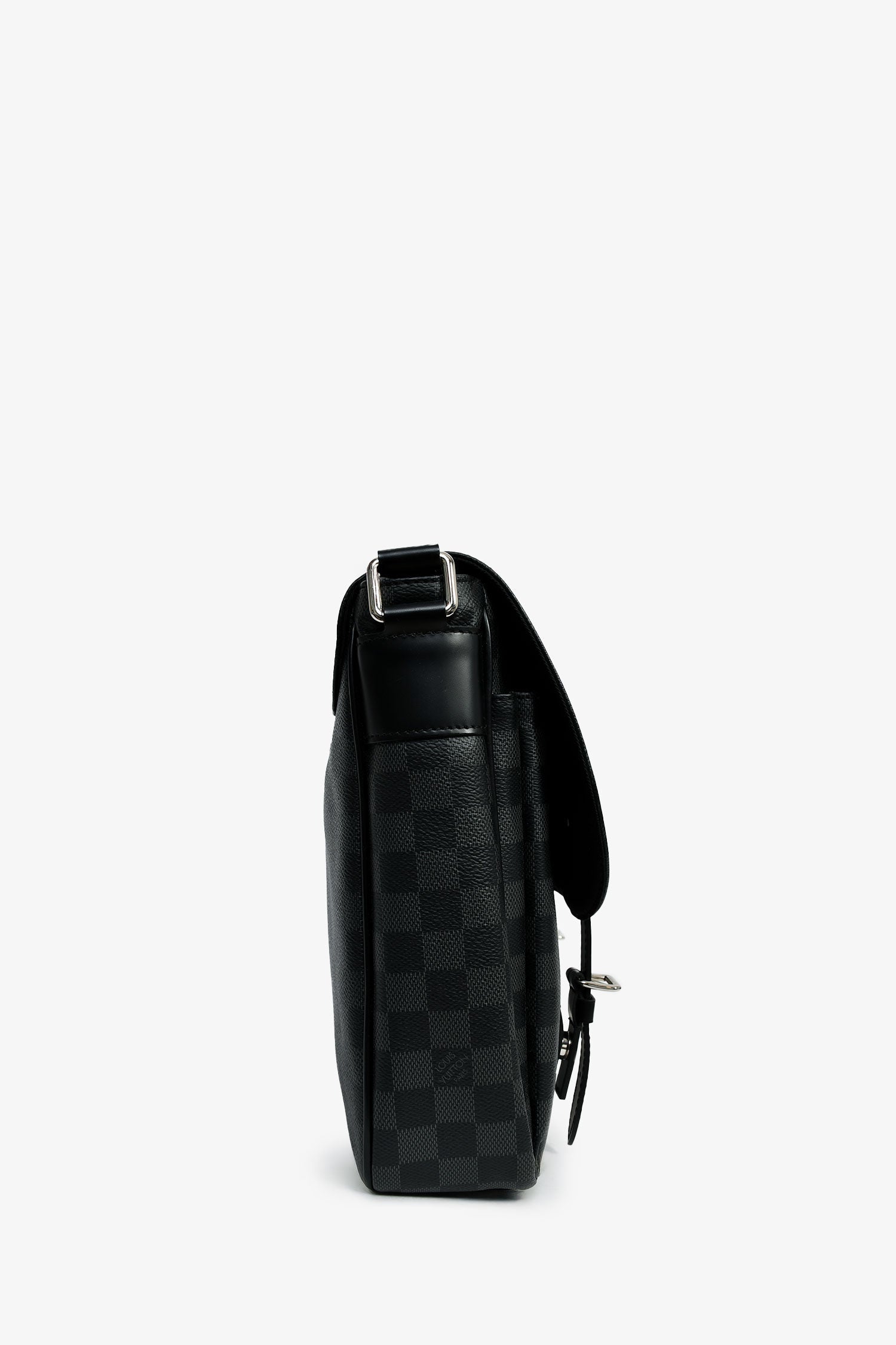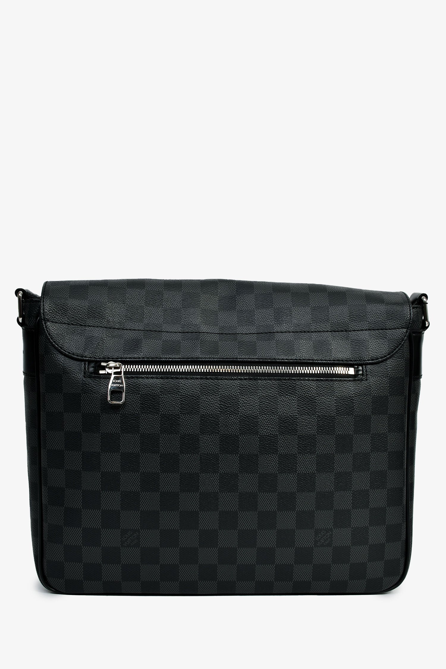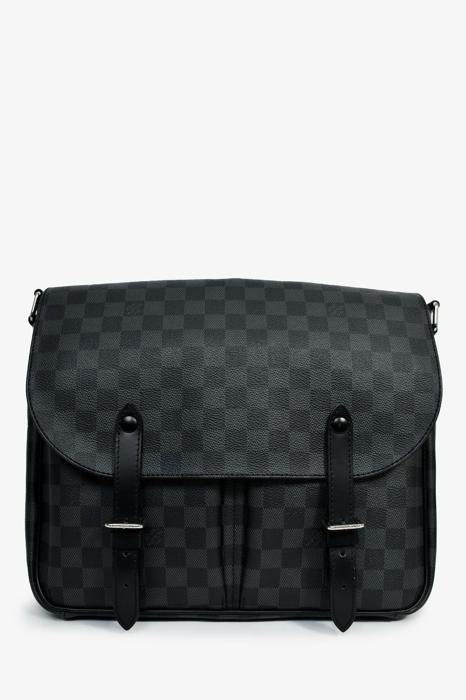 Louis Vuitton Damier Graphite Messenger Bag. Front fold-over flap with two strap and magnetic button closures. Two exterior front slip pockets. Tonal textile interior lining. Five interior wall slip pockets. Two pen slots. Adjustable strap. Exterior rear zip pocket. Silver-tone hardware.
