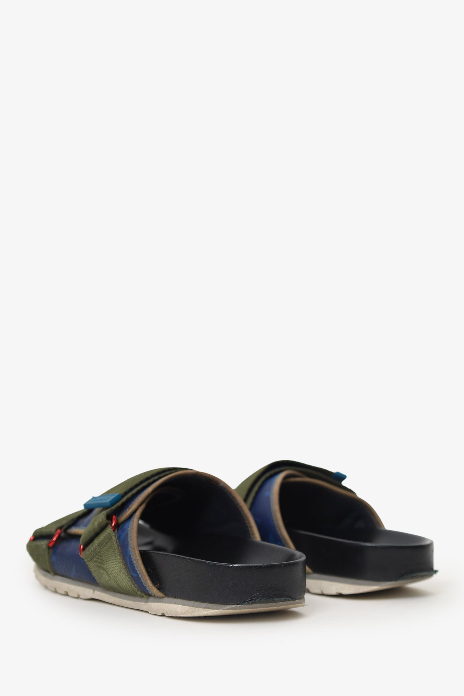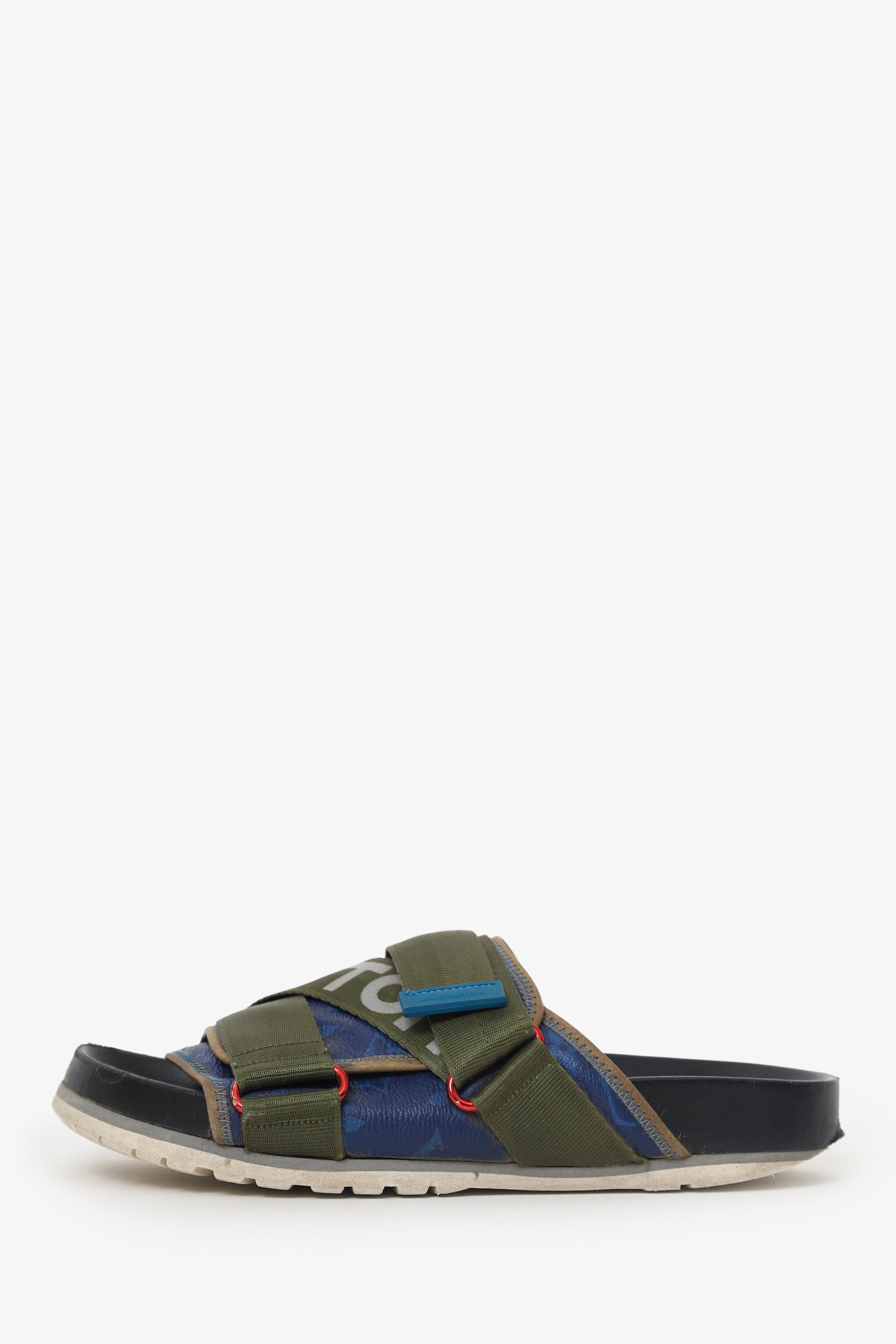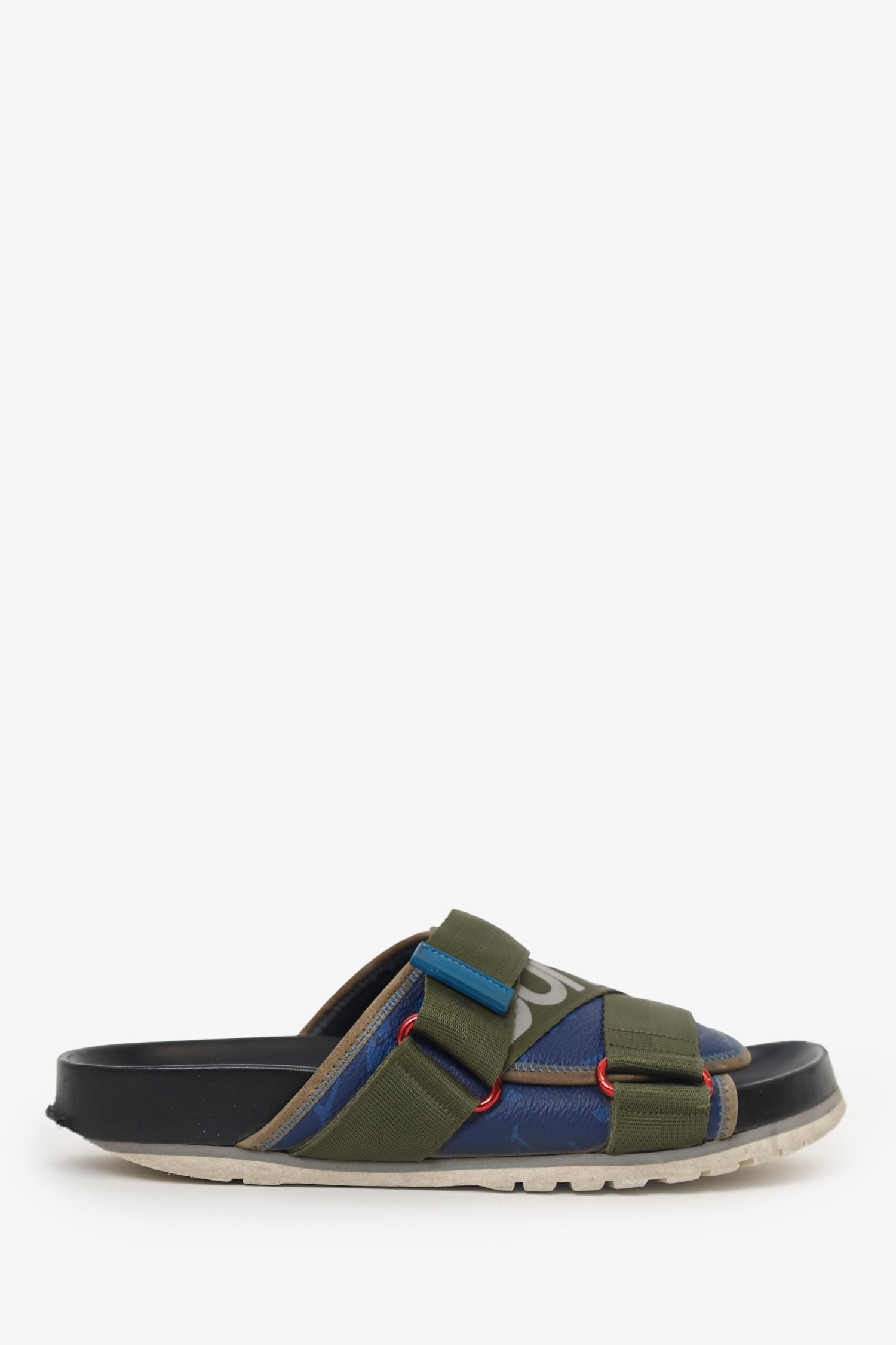 Louis Vuitton Green/Black Leather/Canvas Slides. Slip-on. Round toe. 2 exterior adjustable top velcro straps. Contrast and tonal stitching.