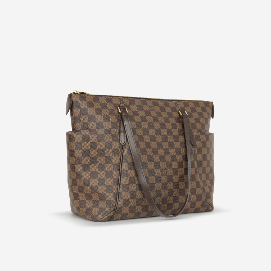 The bag features dual handles for shoulder or hand carry, a zipped closure, and a roomy interior suitable for daily essentials. The classic Damier Ebene pattern ensures timeless appeal, making the Totally MM a staple in Louis Vuitton’s collection.