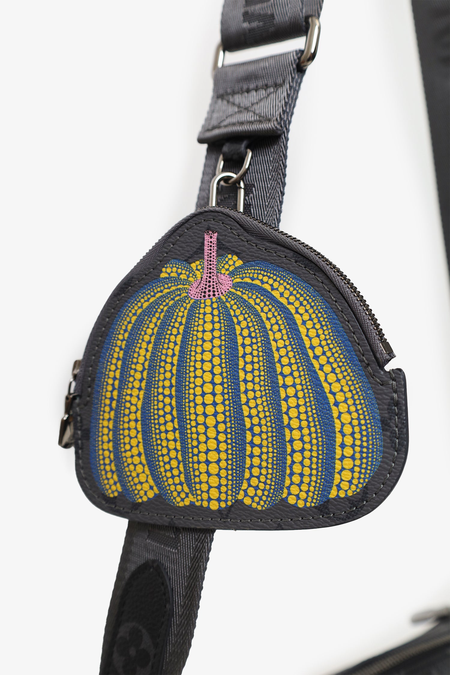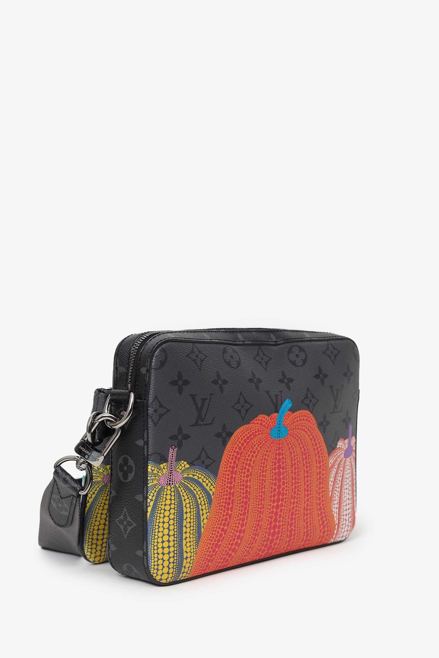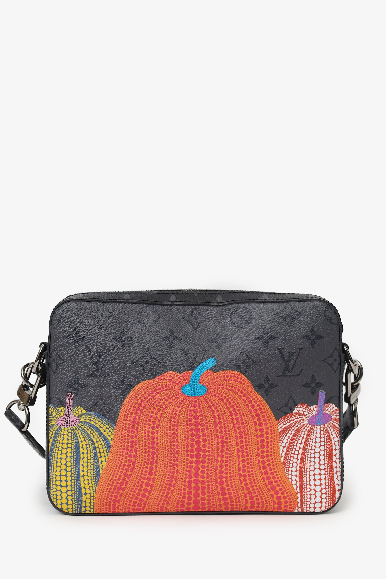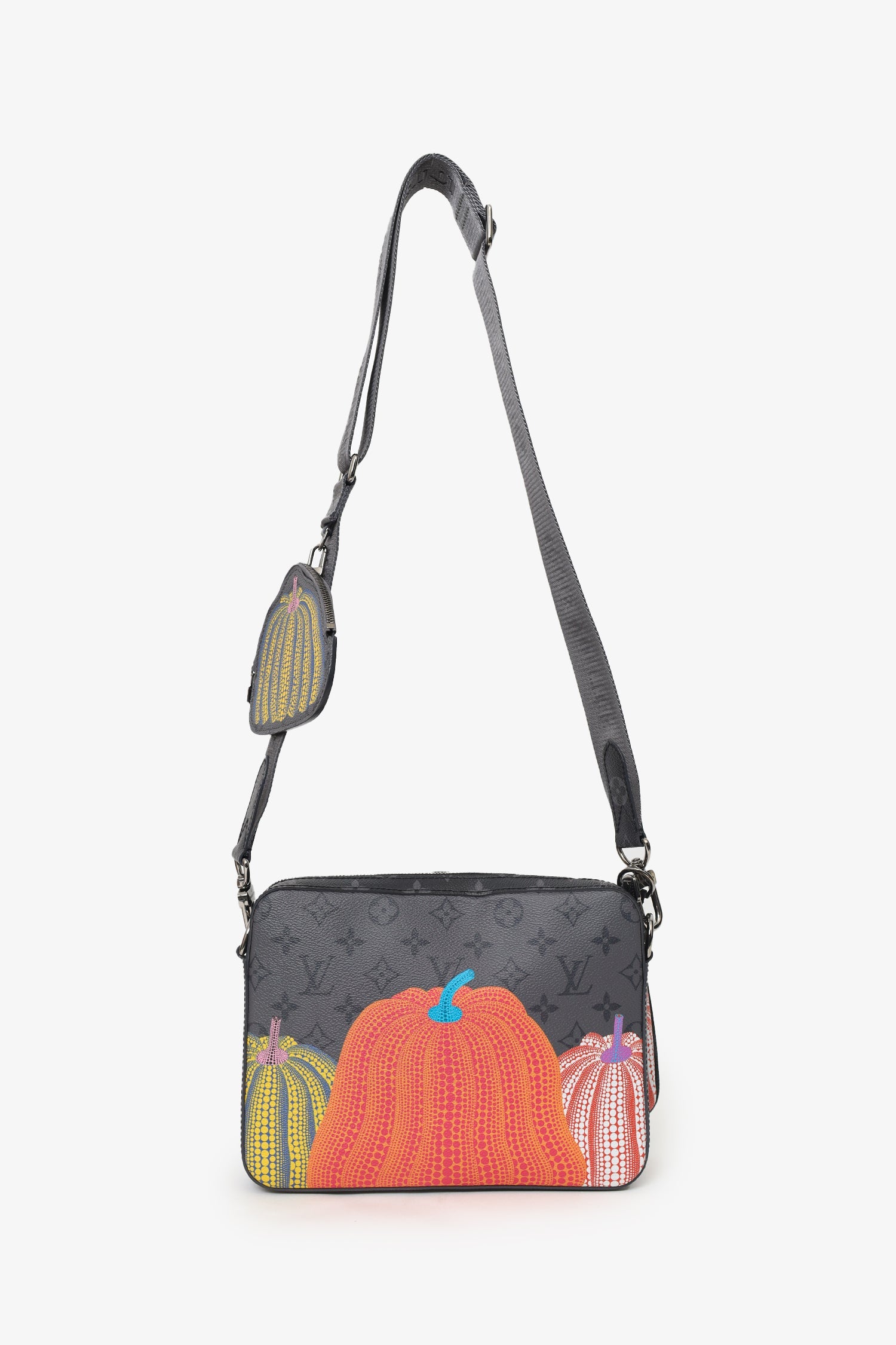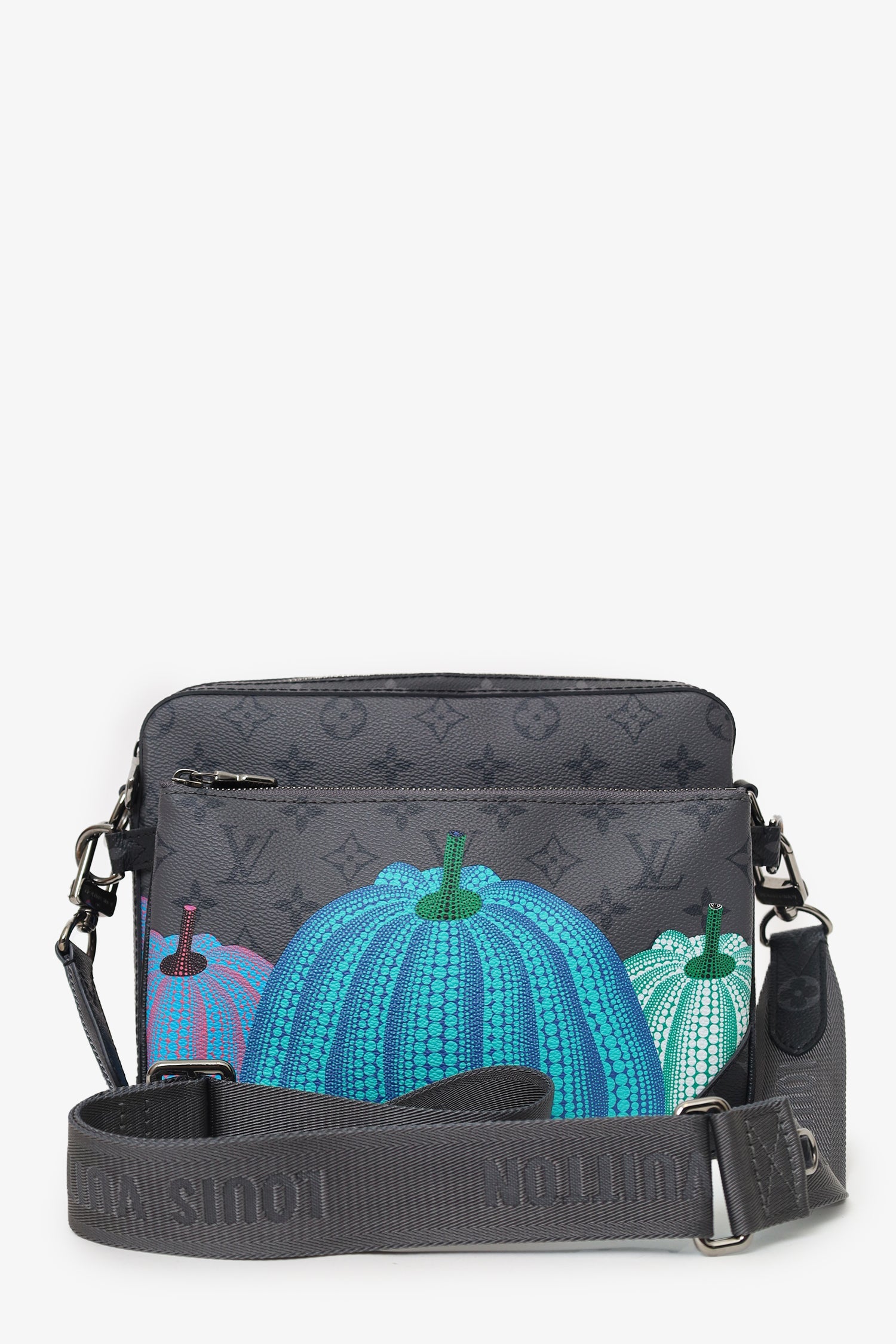 Louis Vuitton x Yayoi Kusama 2023 Reverse Monogram Eclipse Trio Messenger Bag. Top zip closure. Adjustable and removable crossbody strap with clasp closure. Lined interior with single slip pocket. 2 additional removable zip-up pouches with lined interiors. Gunmetal-tone hardware. Tonal stitching.