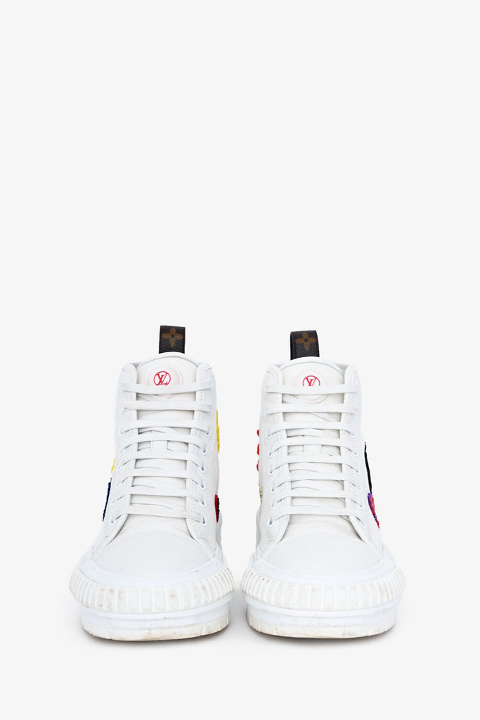 Louis Vuitton x Yayoi Kusama White/Multicolour 'Squad' Sneakers. Round toe with canvas exterior. Felt motifs. Rubber soles. Coated canvas shoe loop. Tonal stitching.