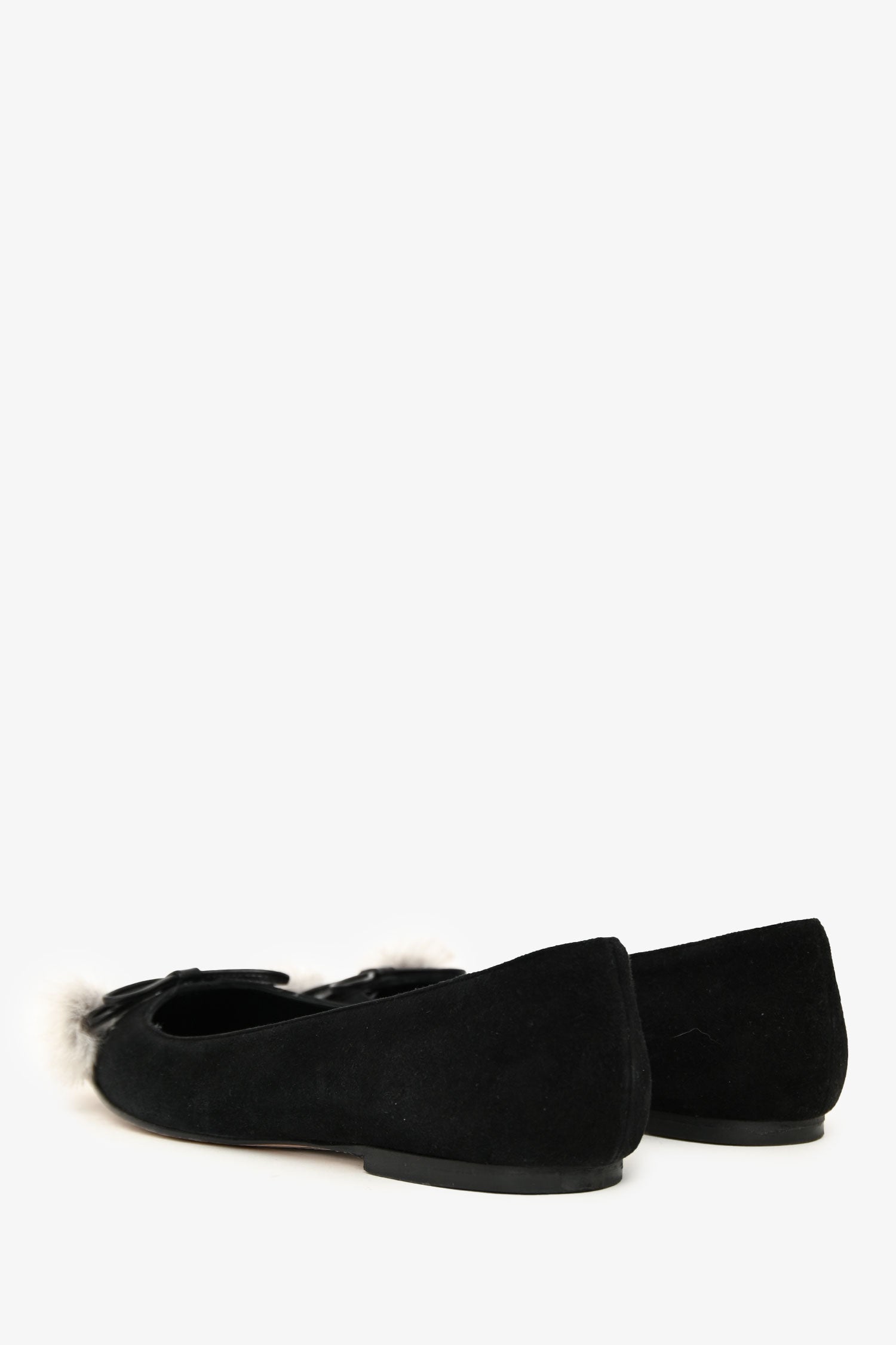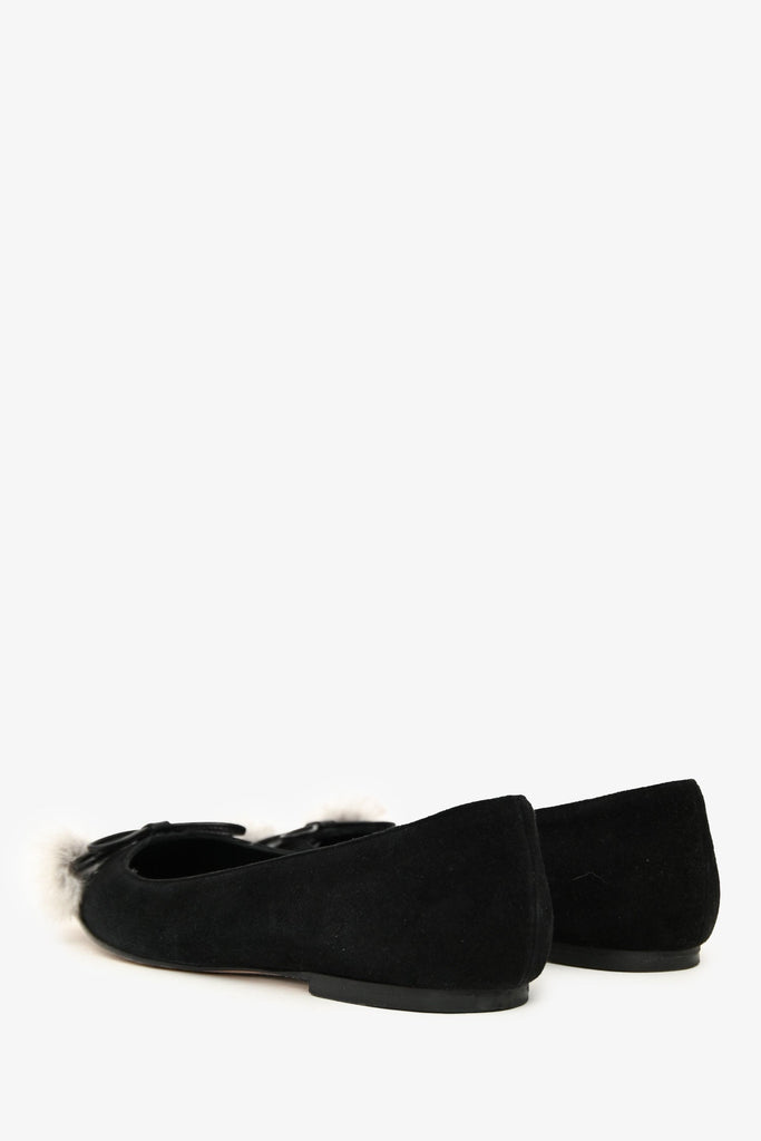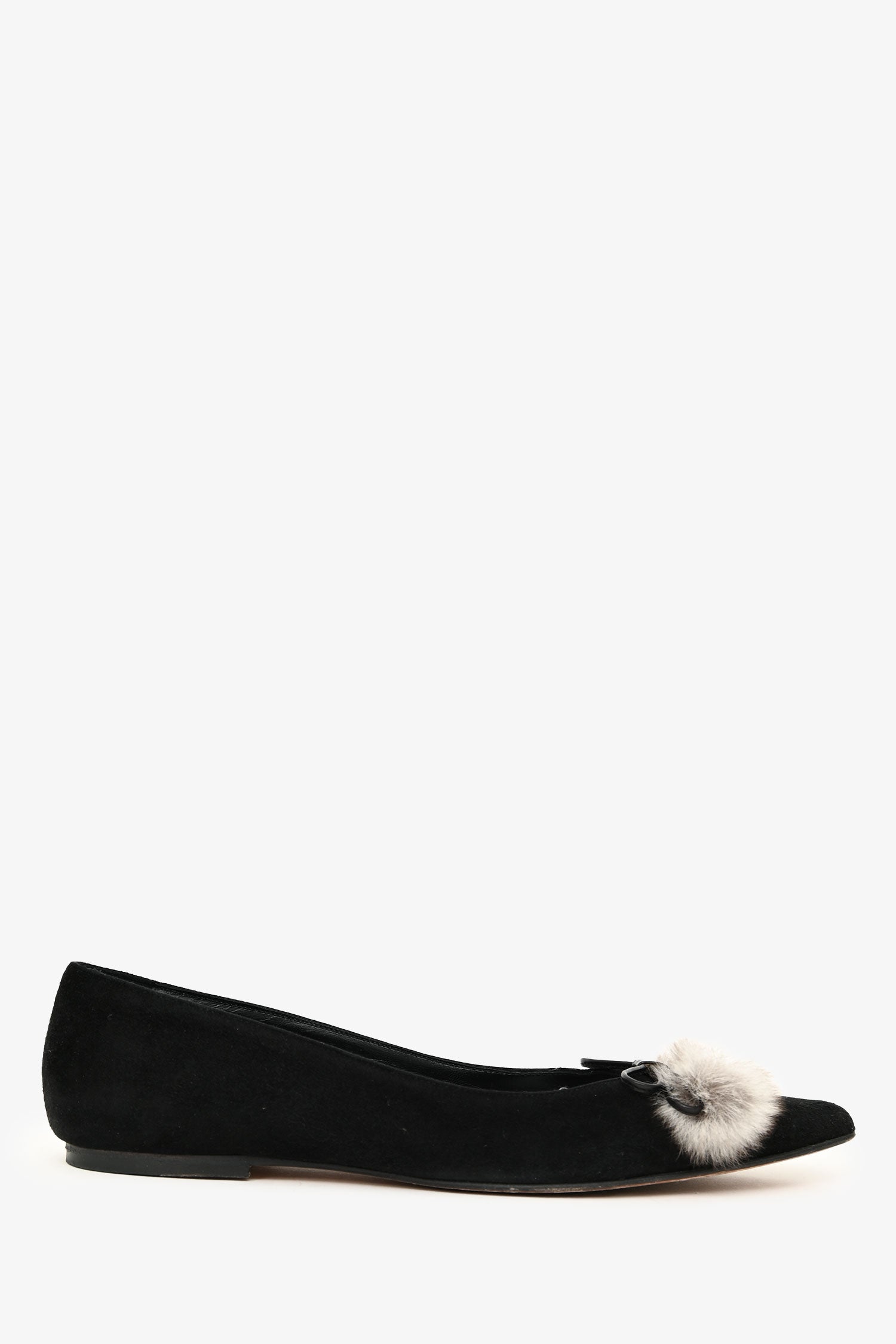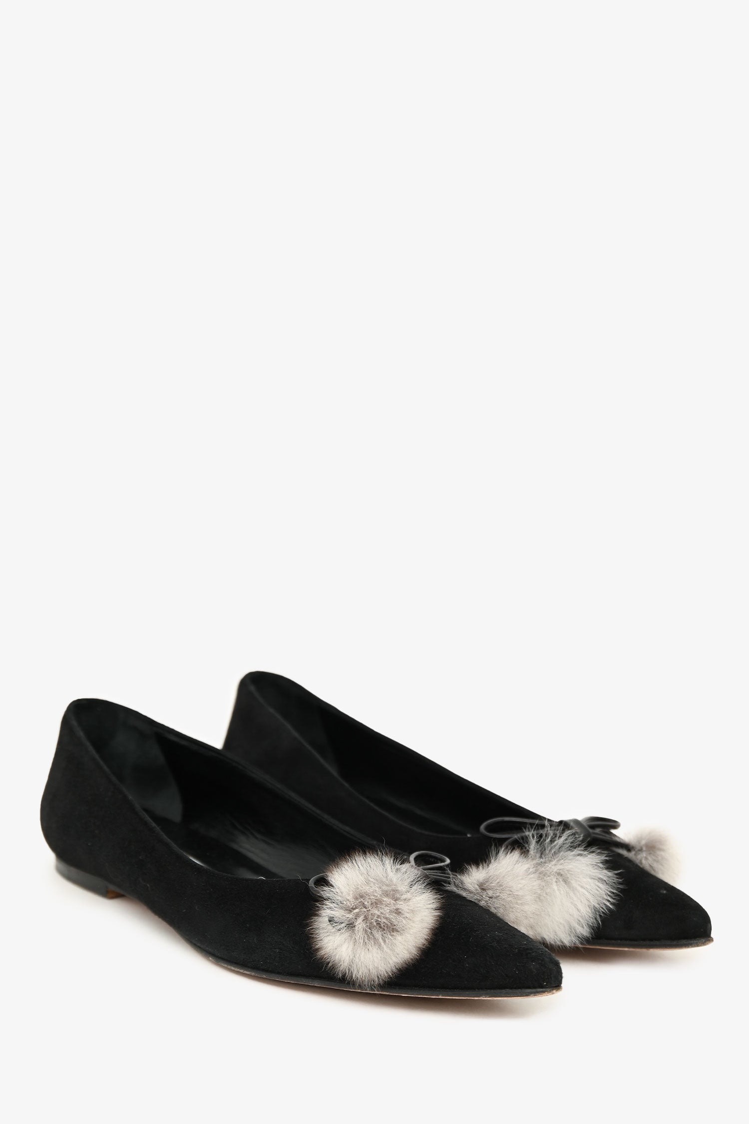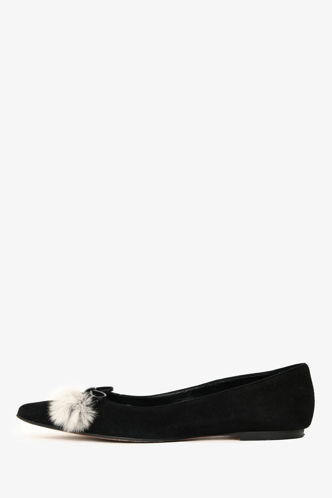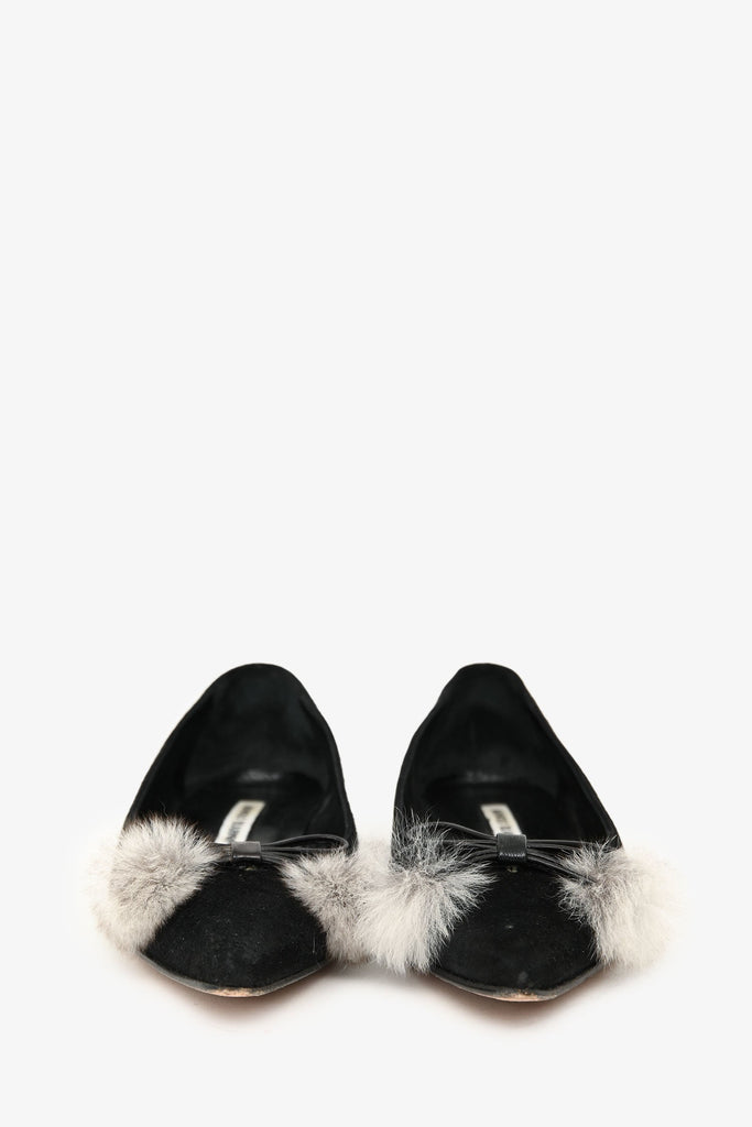 Manolo Blahnik Black Suede Pom Pom Pointed Flats. Slip-on. Pointed toe. Leather insoles. Tonal stitching.