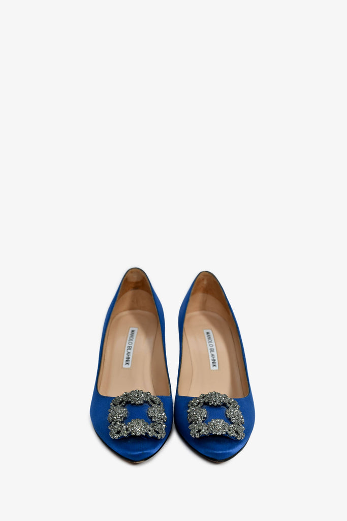 Manolo Blahnik Blue Satin Hangisi 70 Heels. Pointed toe front with a crystal buckle. Leather insoles. Stiletto heels. Tonal stitching.