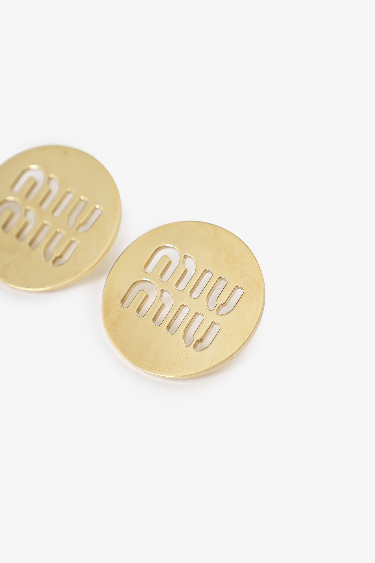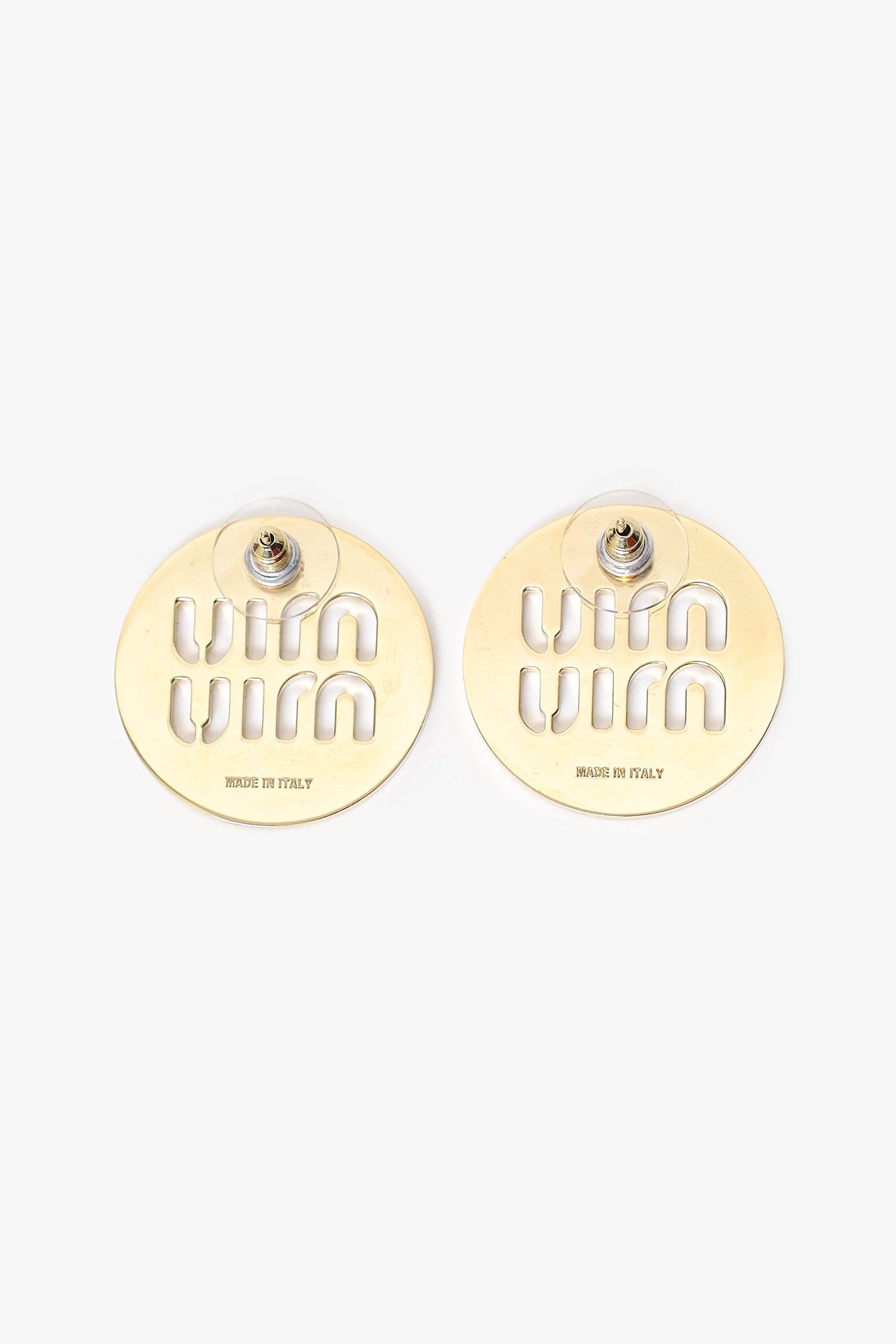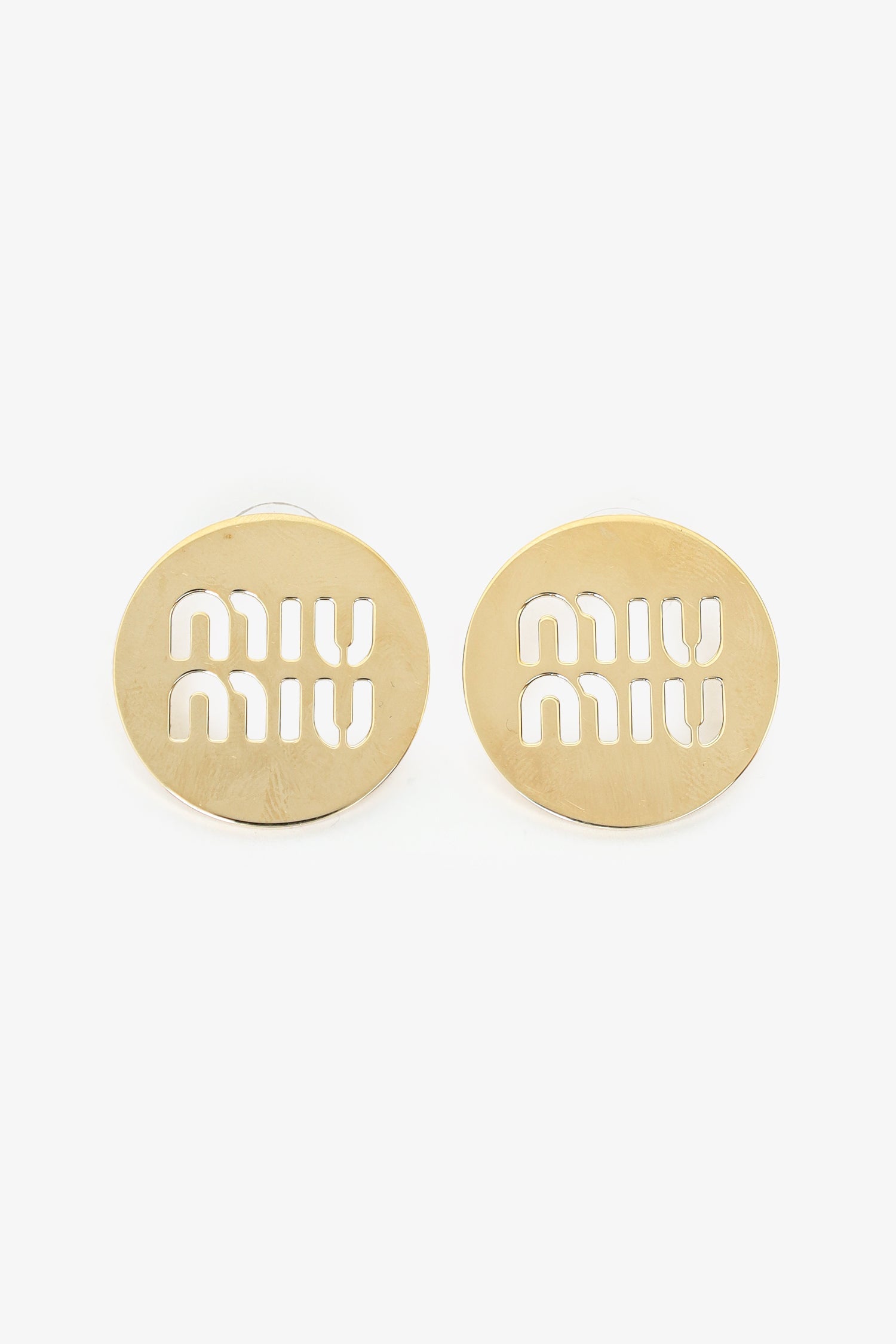 Miu Miu Gold Tone Circle 'Miu Miu' Earrings. Rear push-pin backing. Gold-tone hardware.