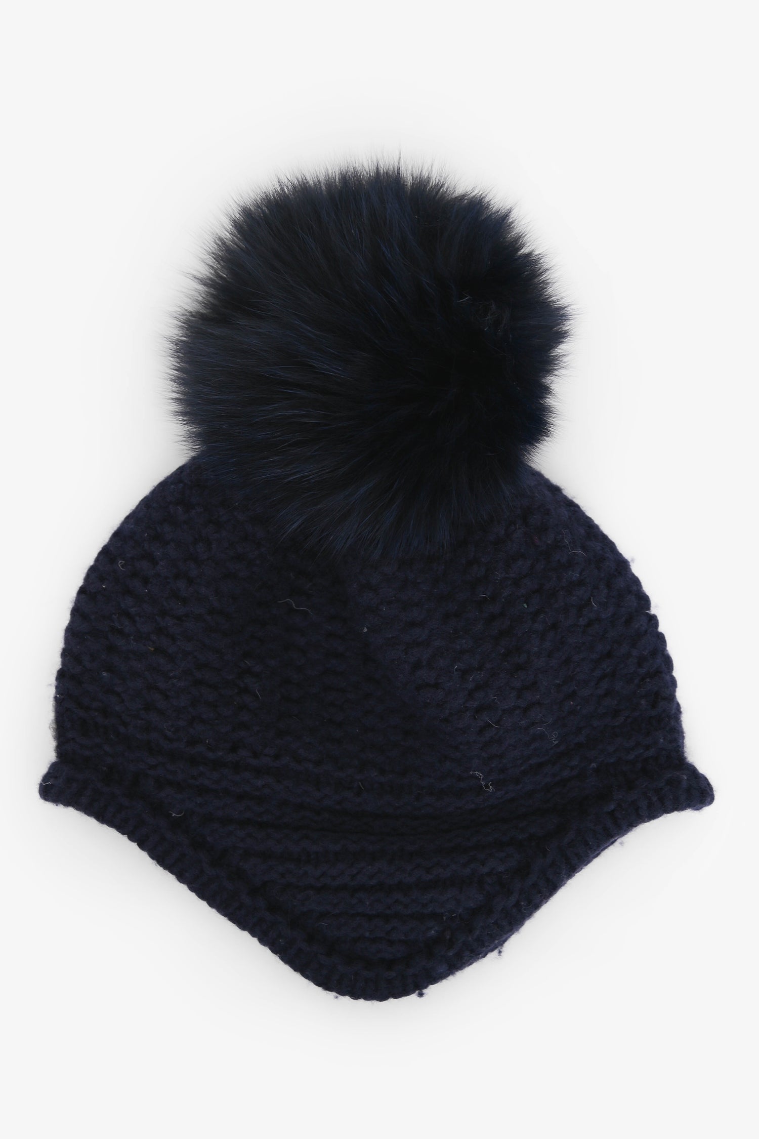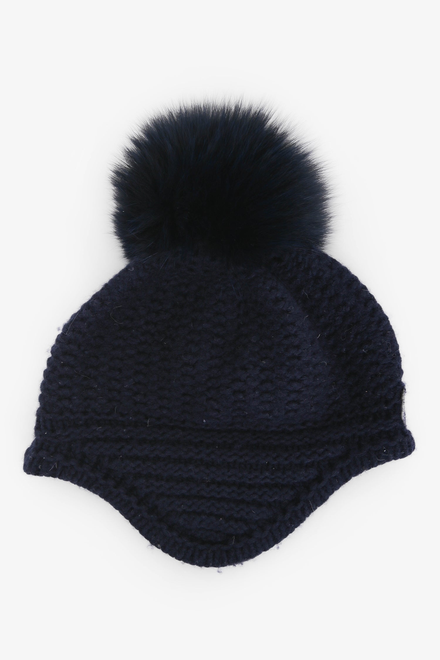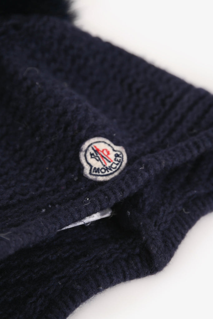 Moncler Navy Wool/Fur Beanie. Pom detail at the top. Tonal stitching.