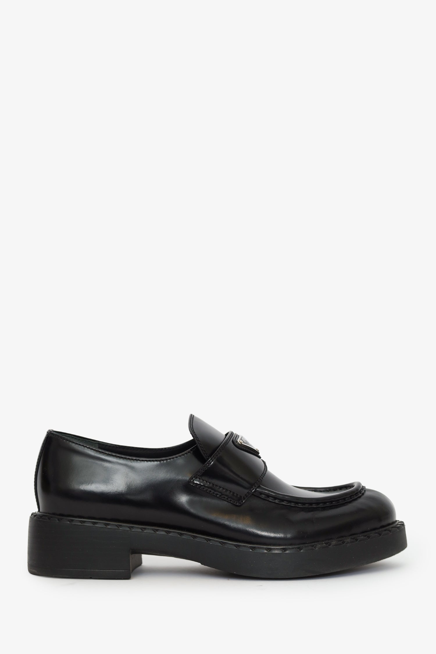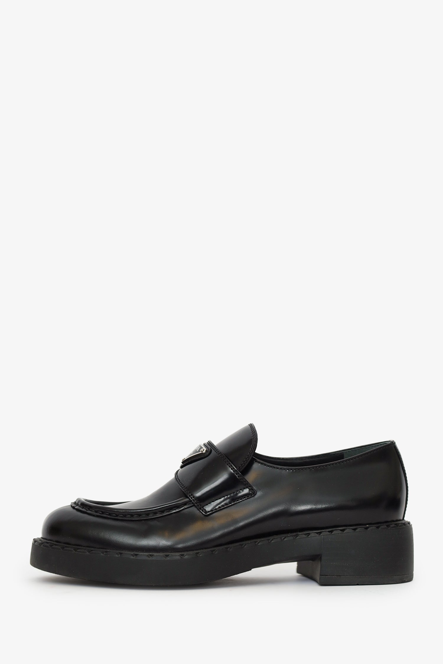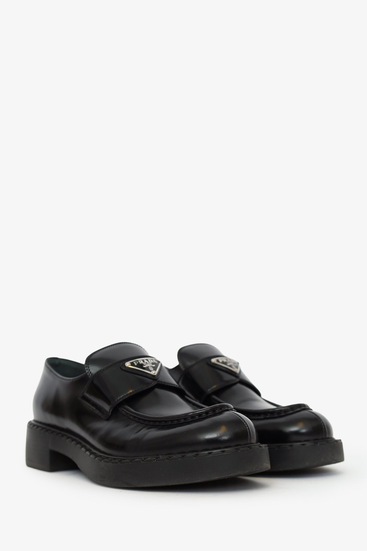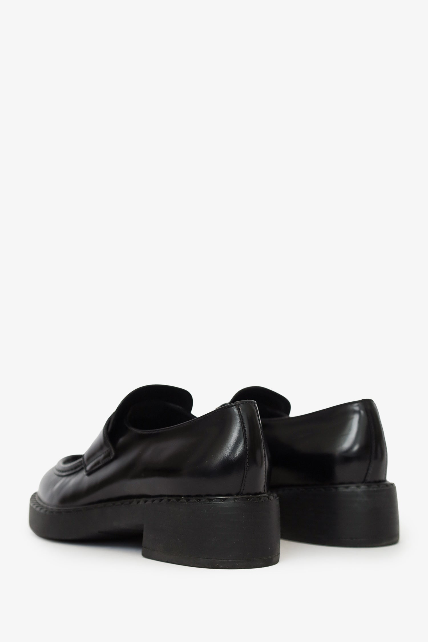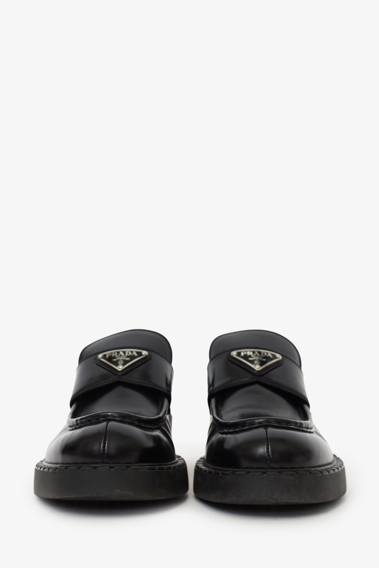 Prada Black Brushed Leather Loafers. Round toe. Block heel. Lined interior. Silver-tone hardware. Tonal stitching.