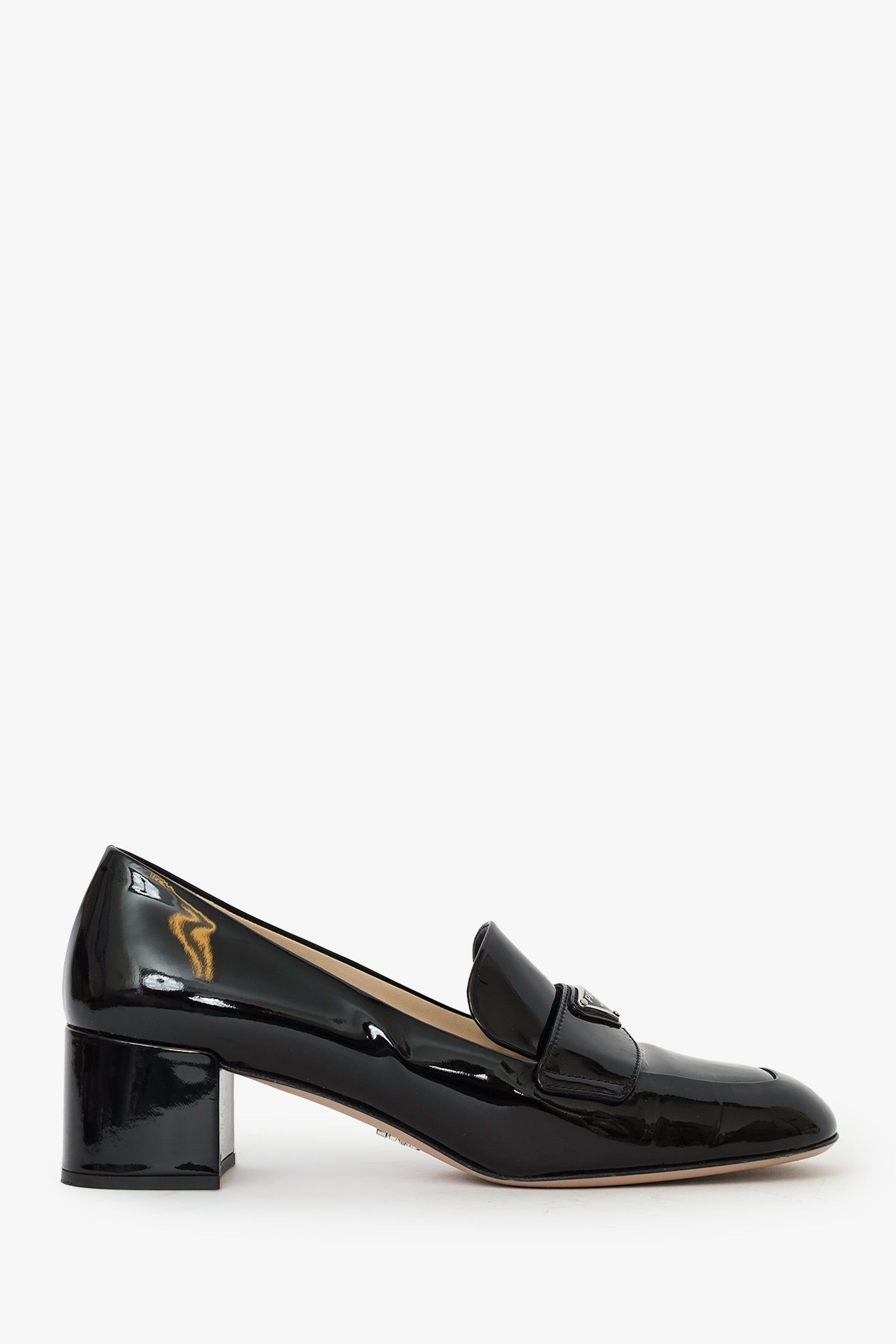 Prada Black Patent Leather Loafers. Square toe. Block heel. Lined interior. Silver-tone hardware. Tonal stitching.