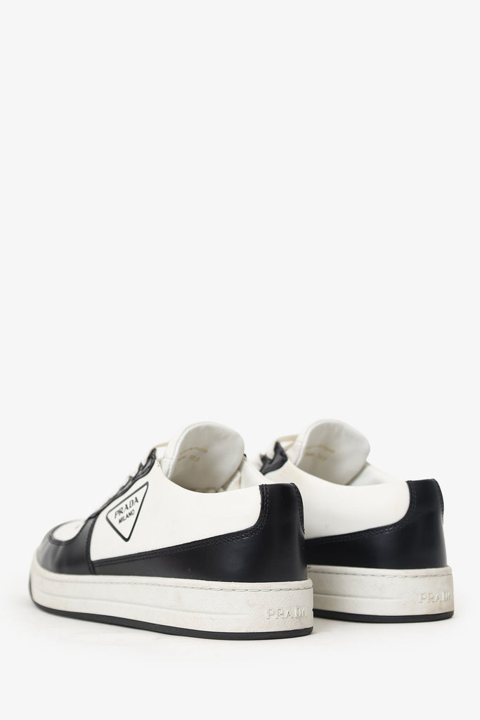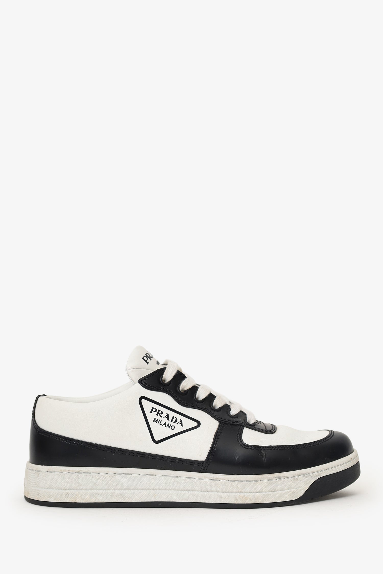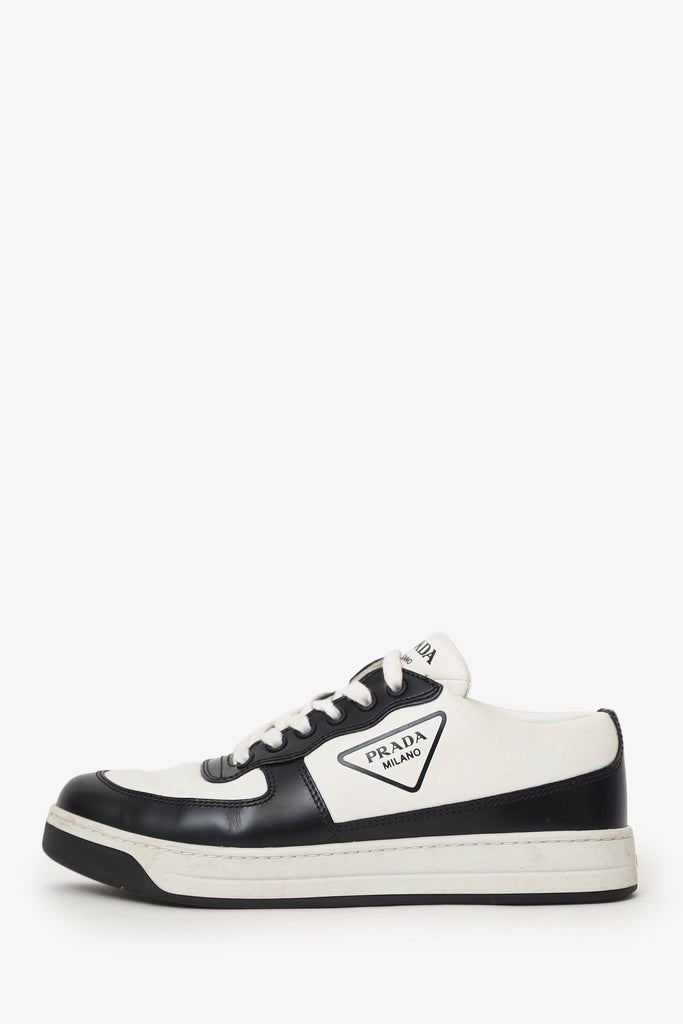 Prada Black/White Leather Logo Sneakers. Slip-on. Round toe. Front lace-up closure. Padded tongue. Tonal stitching.