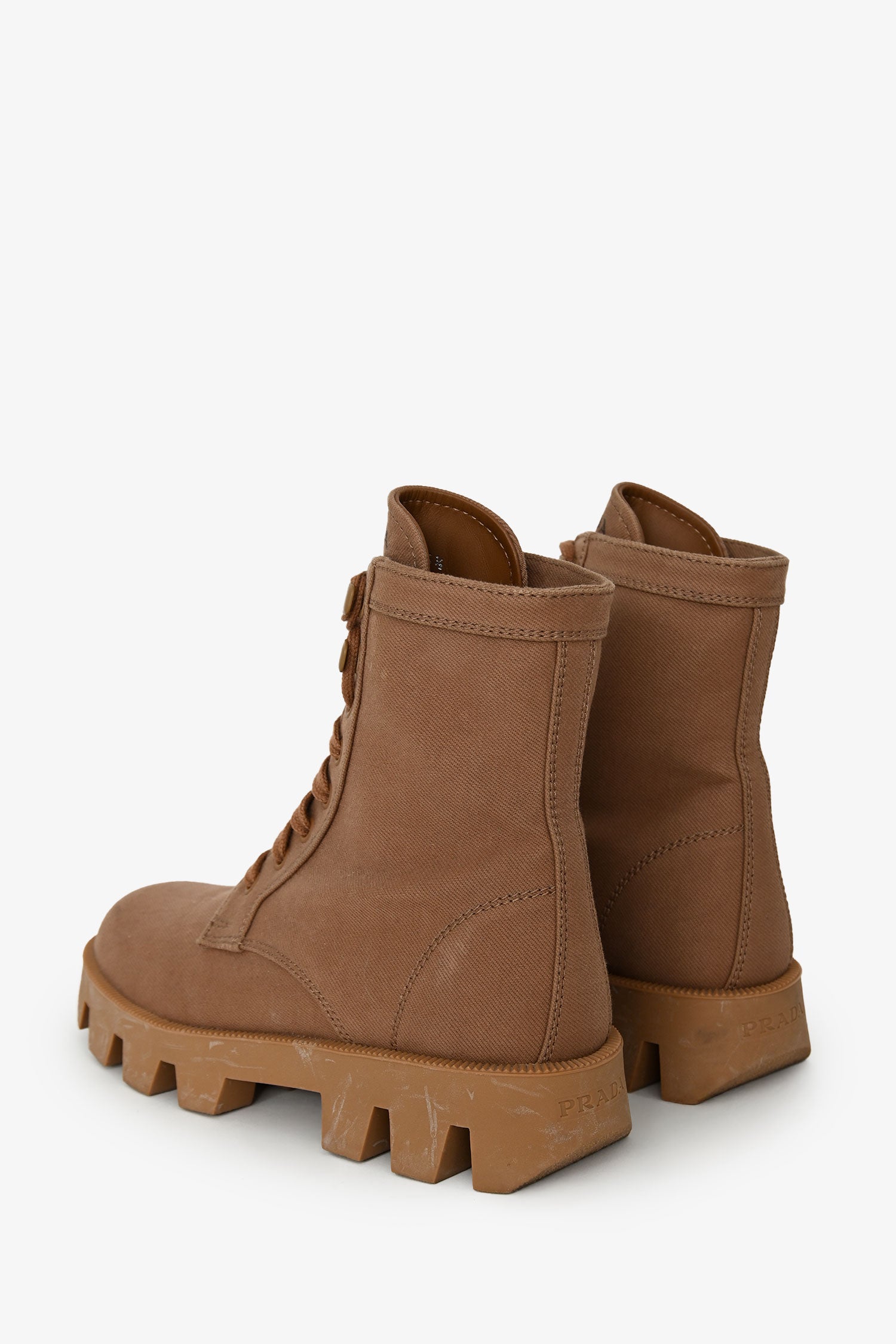 Prada Brown Canvas Combat Boots. Round toe. Front lace-up closure. Tonal hardware and stitching.