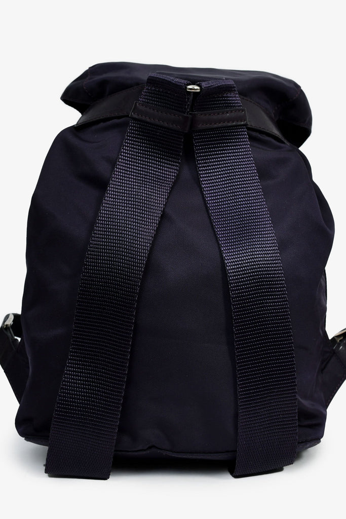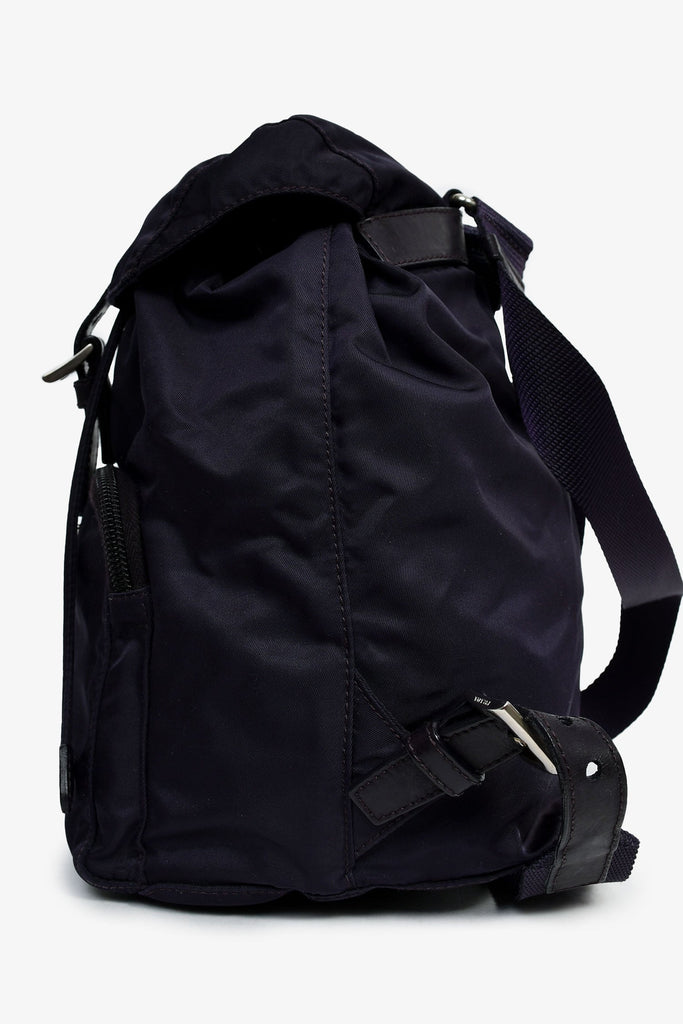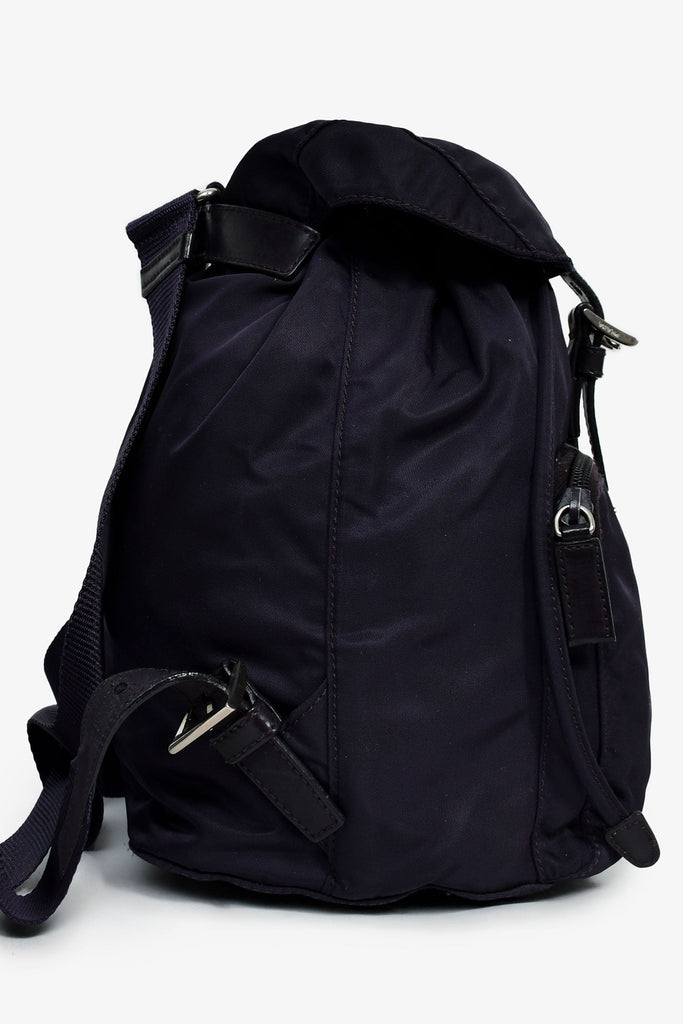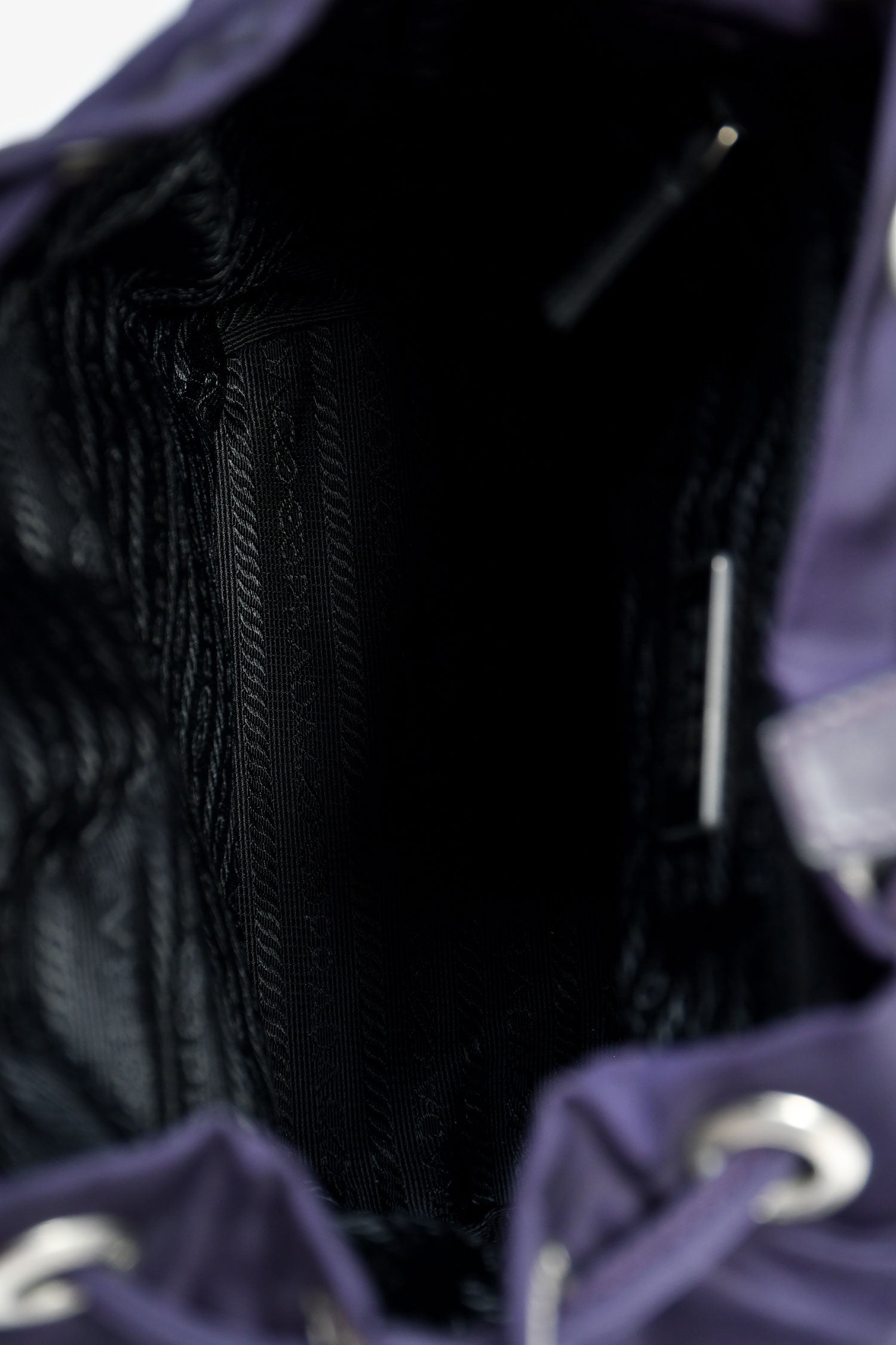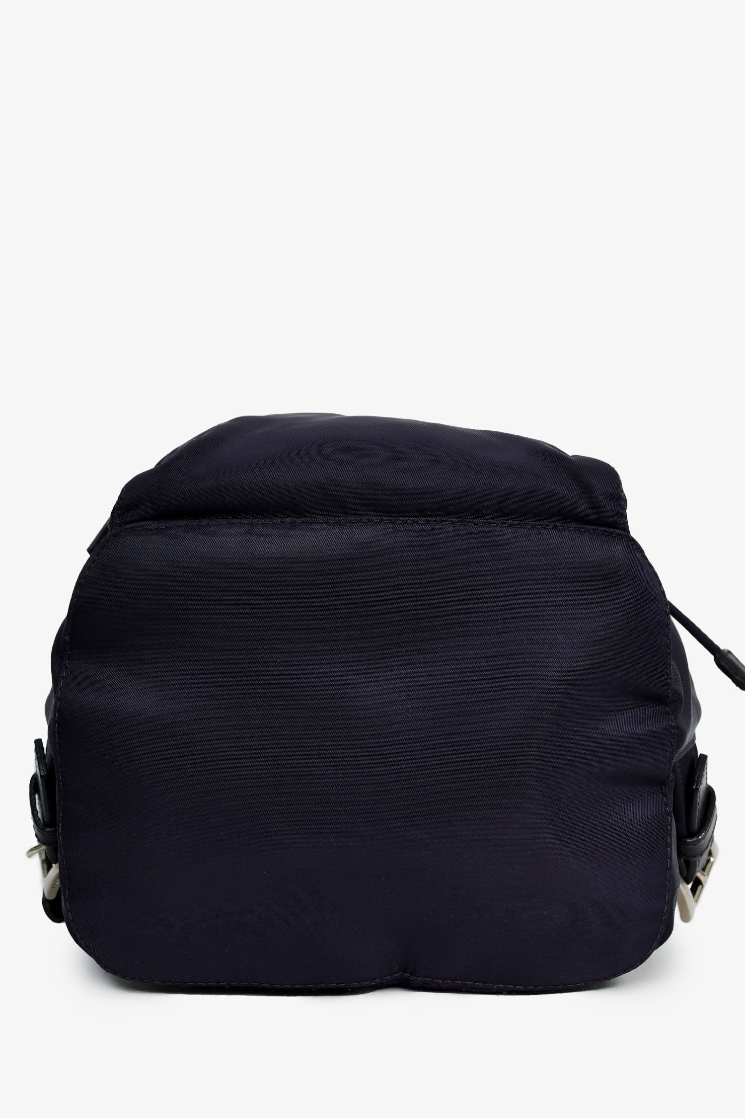 Prada Purple Nylon Single Buckle Backpack. Front zip pocket. Front fold-over flap with magnetic and strap with buckle closure. Front drawstring closure. Black logo'd textile interior lining. Single interior wall zip pocket. Adjustable straps. Silver-tone hardware.