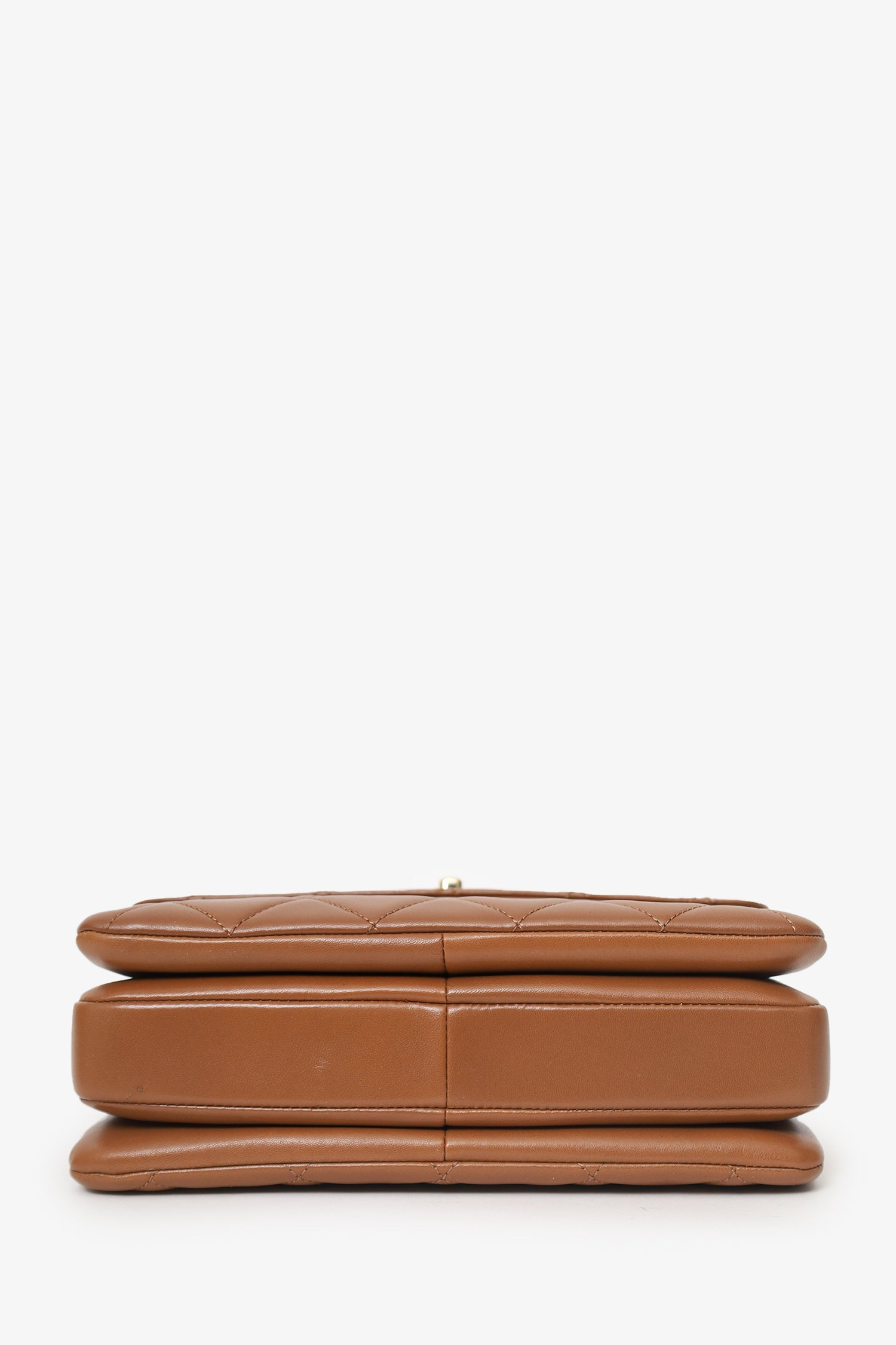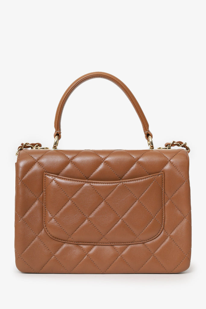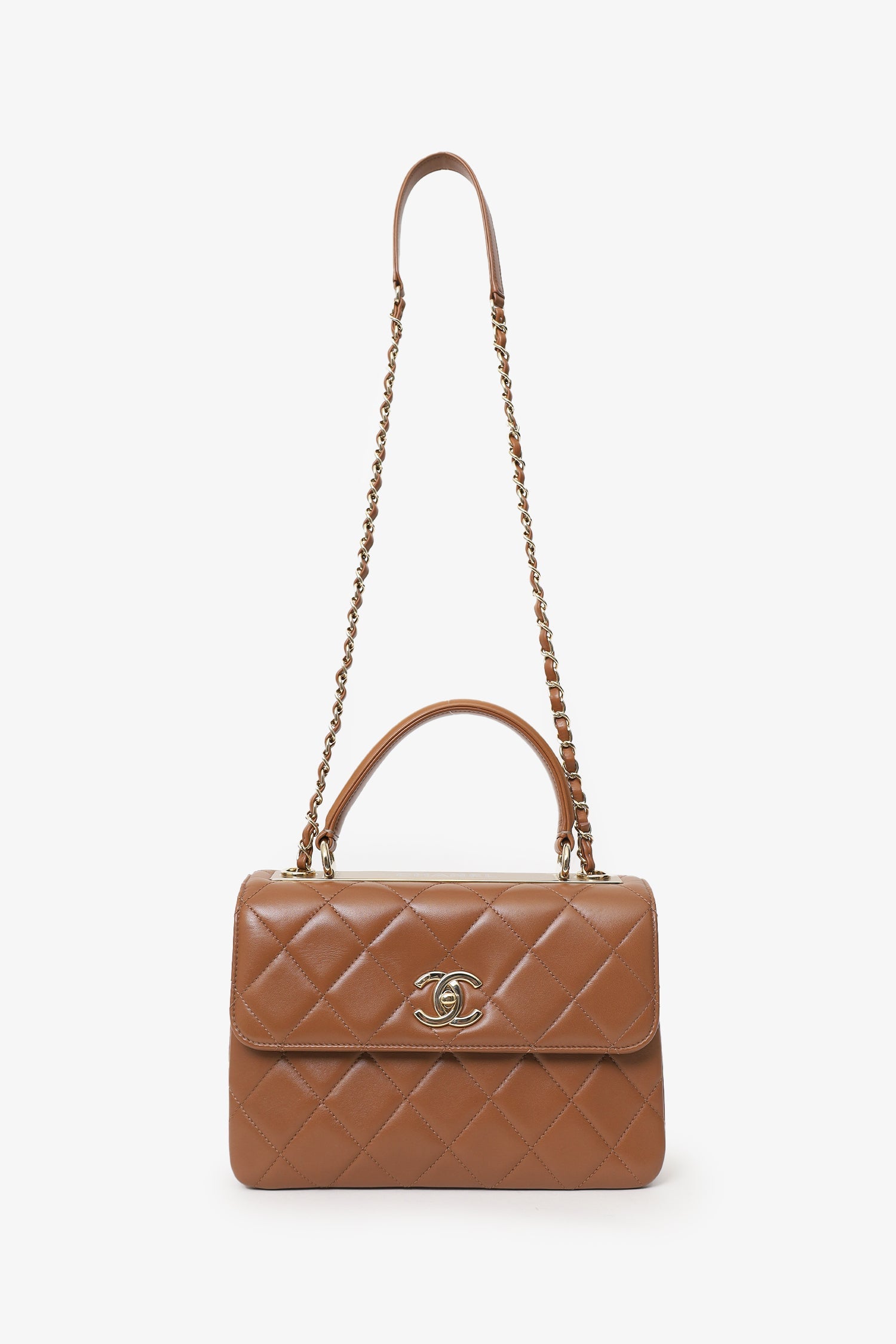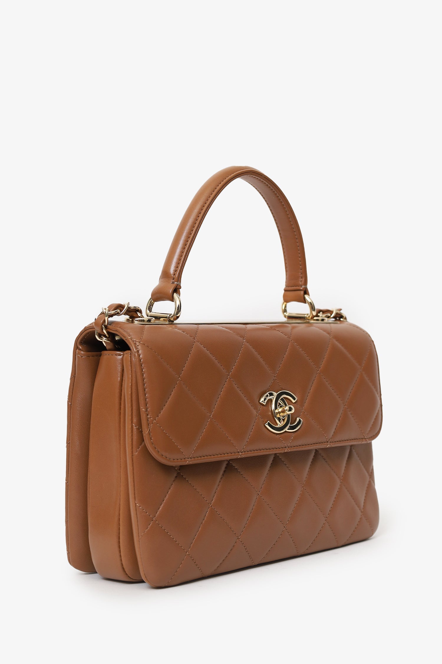 Pre-Loved Chanel™ 2016/17 Light Brown Leather Quilted Trendy Top Handle. Front fold-over flap with turn-lock closure. Top handle. Removable chainlink shoulder strap. Single rear slip pocket. Lined interior with 5 pockets; 4 slip, and 1 lipstick. Gold-tone hardware. Tonal stitching.