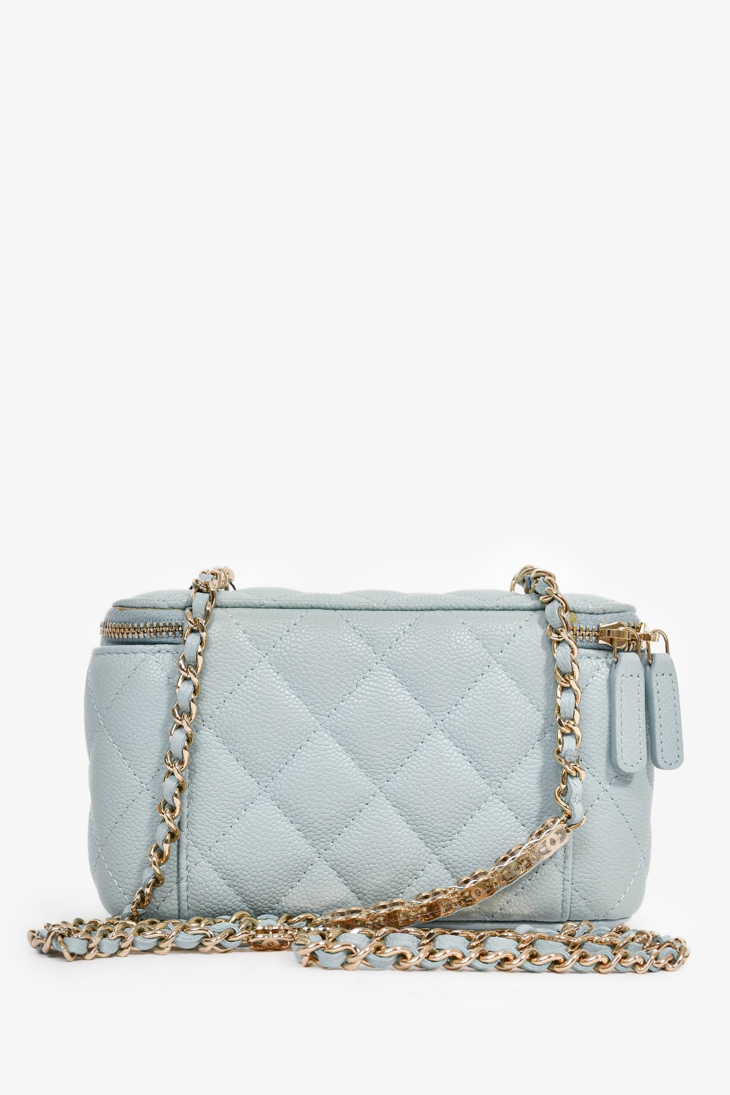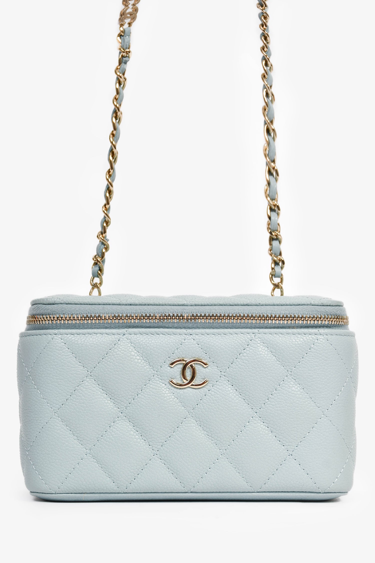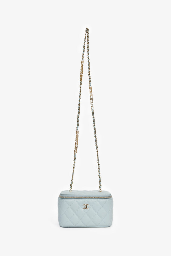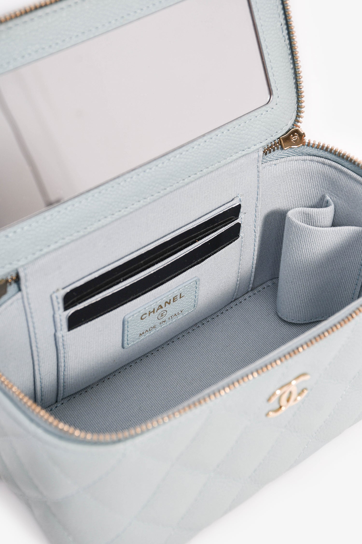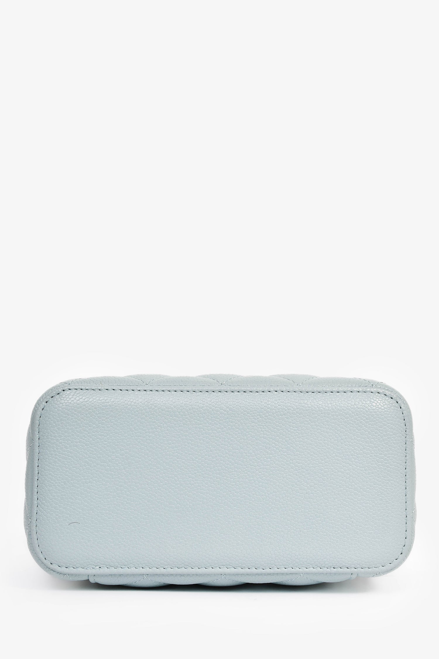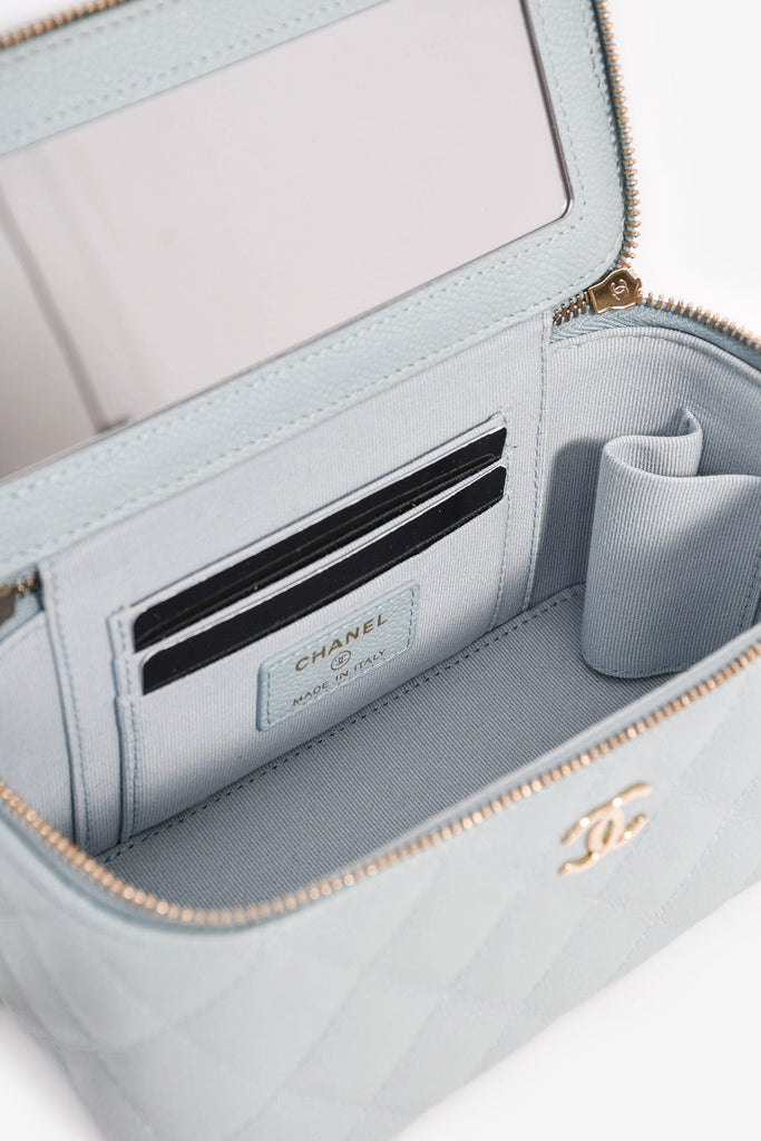 Pre-Loved Chanel™ 2021 Blue Caviar Leather Quilted CC Vanity Top Handle Bag. Front two-way zip closure. Tonal textile interior lining. Built-in mirror at the interior. Three card slots. Gold-tone hardware.