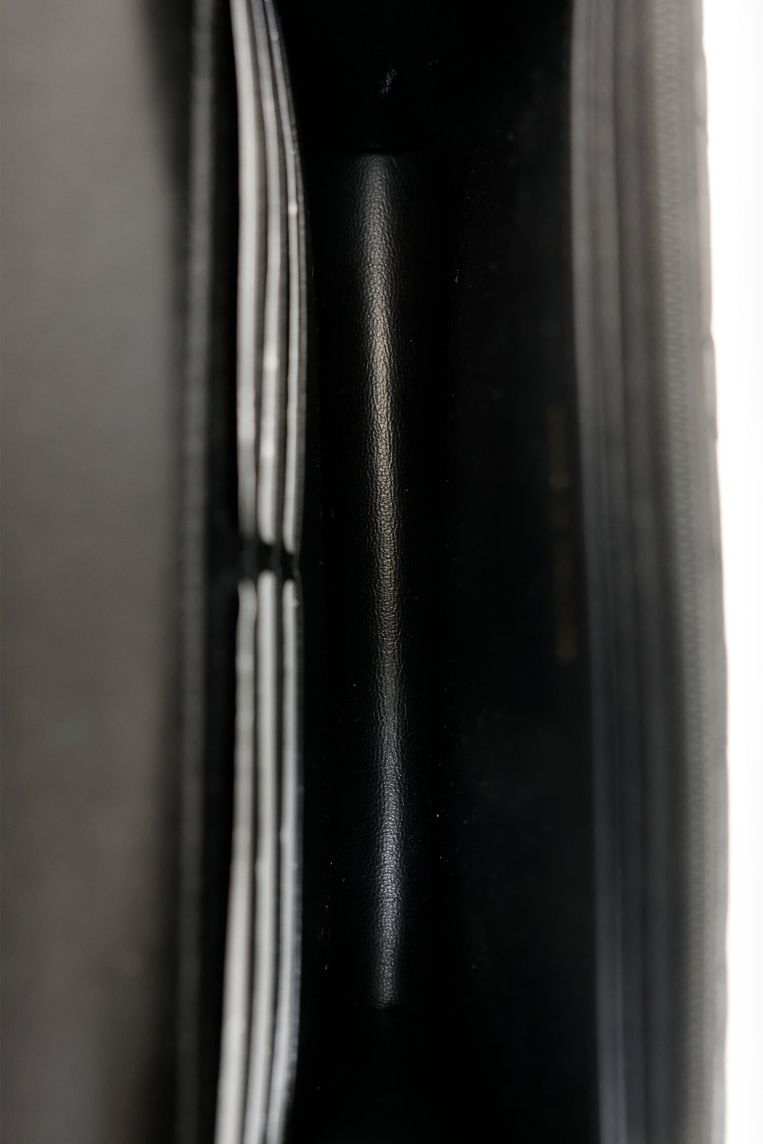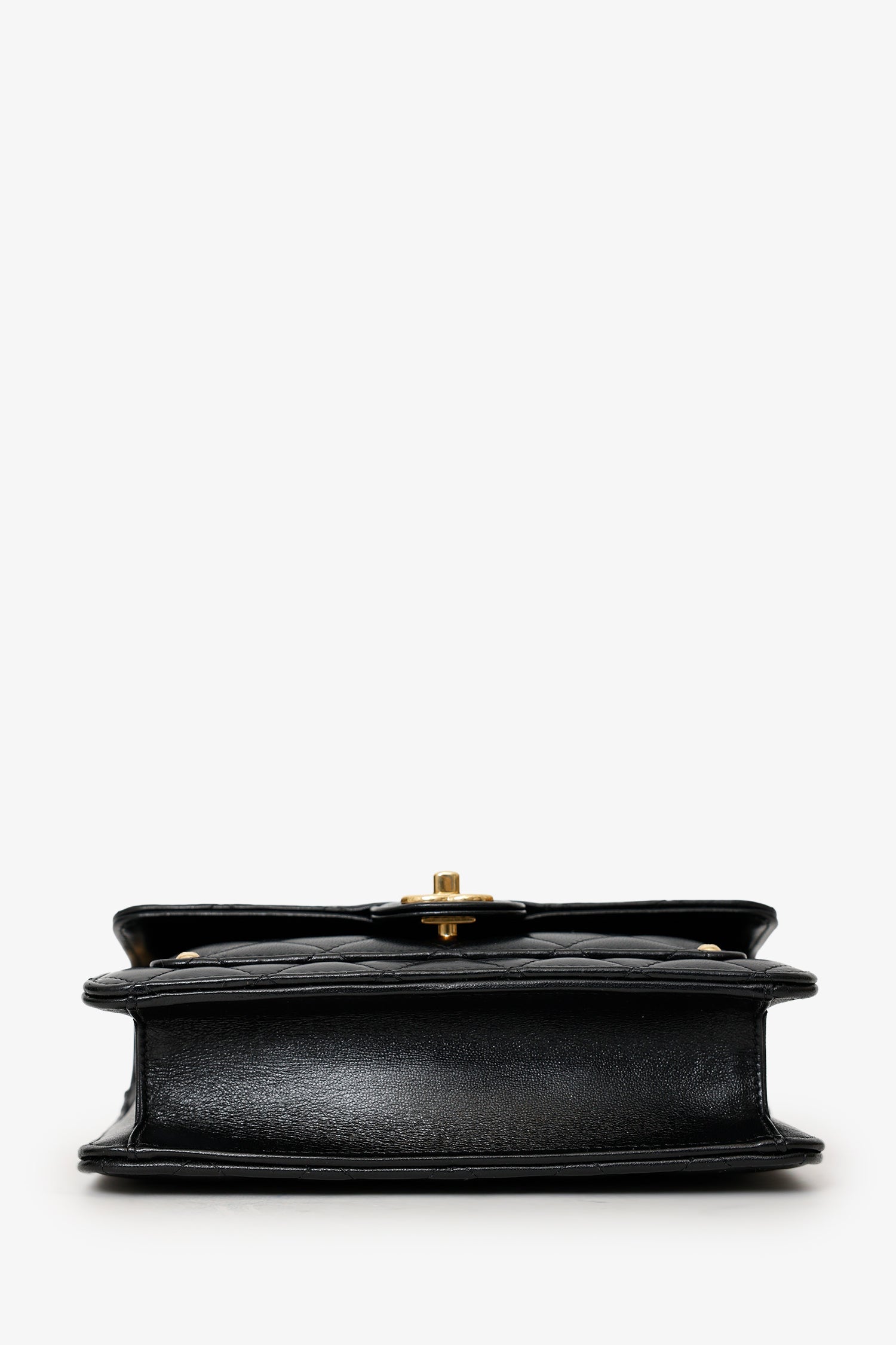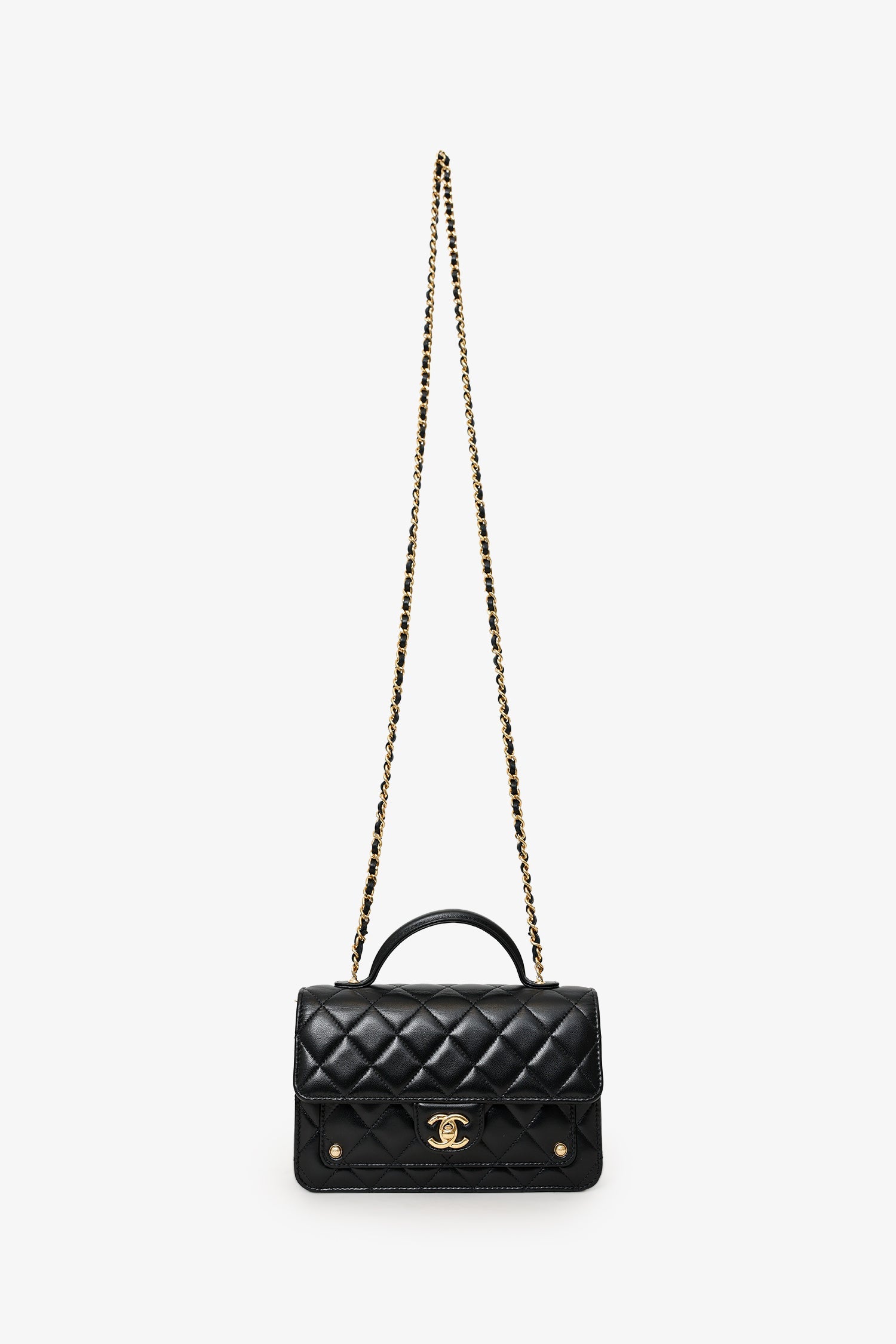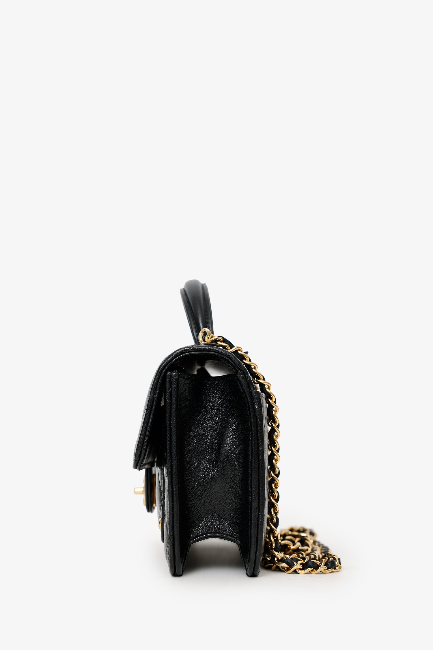 Pre-Loved Chanel™ 25B Black Lambskin Quilted Top Handle Wallet On Chain. Front fold-over flap with snap-button-up closure. Top handle with chain link and leather crossbody strap. Single rear exterior slip pocket. Lined interior with 10 pockets; 2 front slip, 1 front zip-up, 1 middle open compartment, and 6 rear card slots. Gold-tone hardware. Tonal stitching.