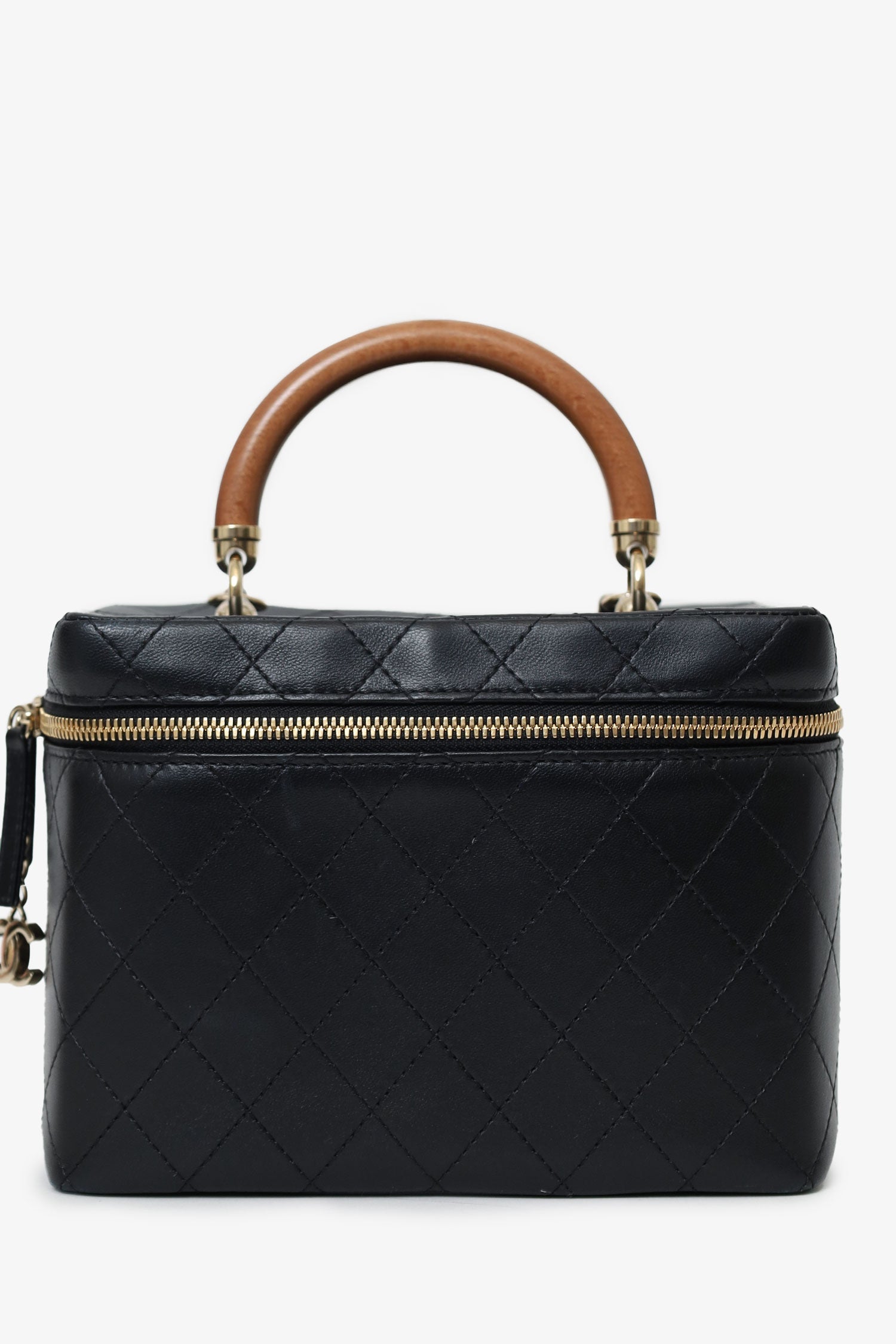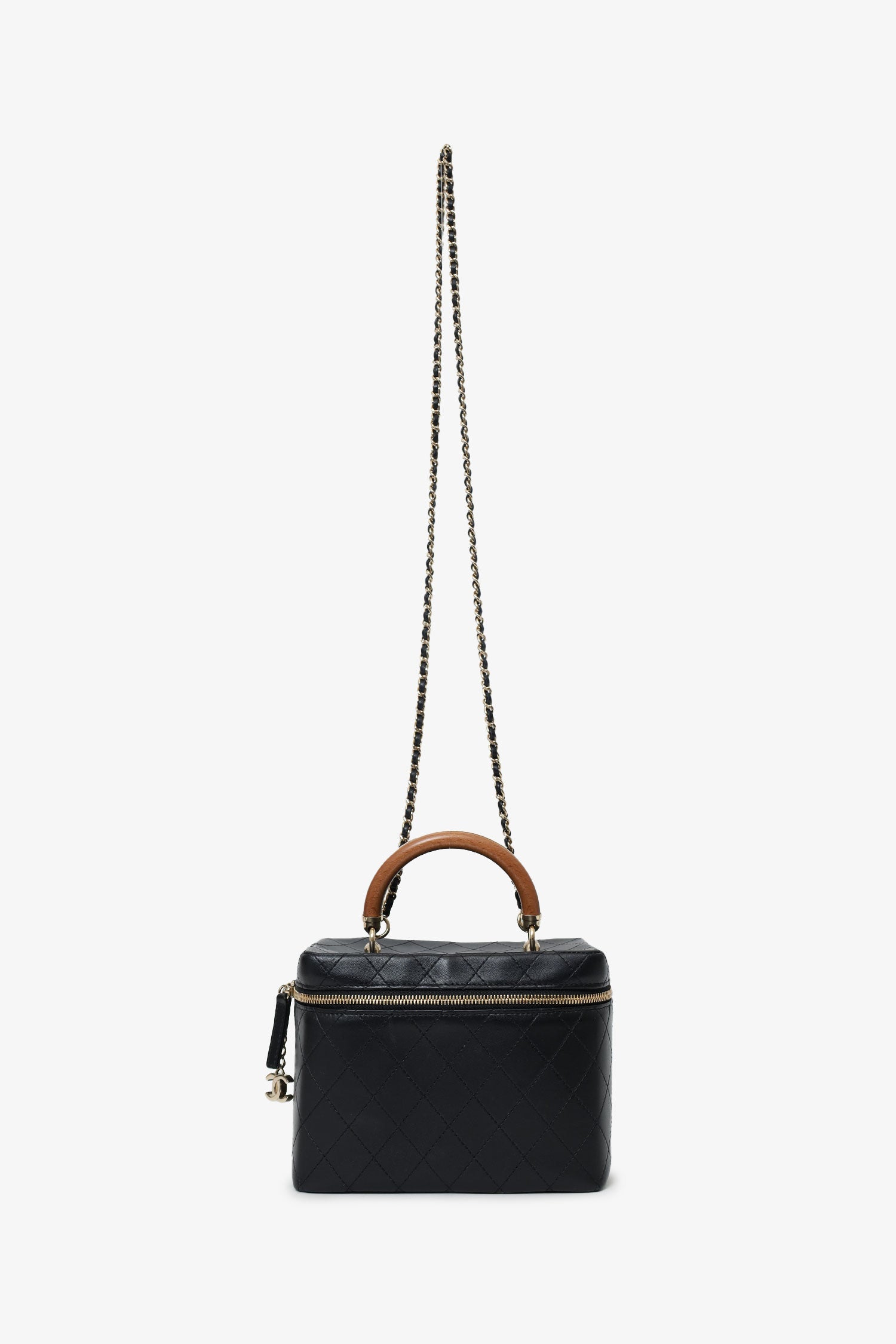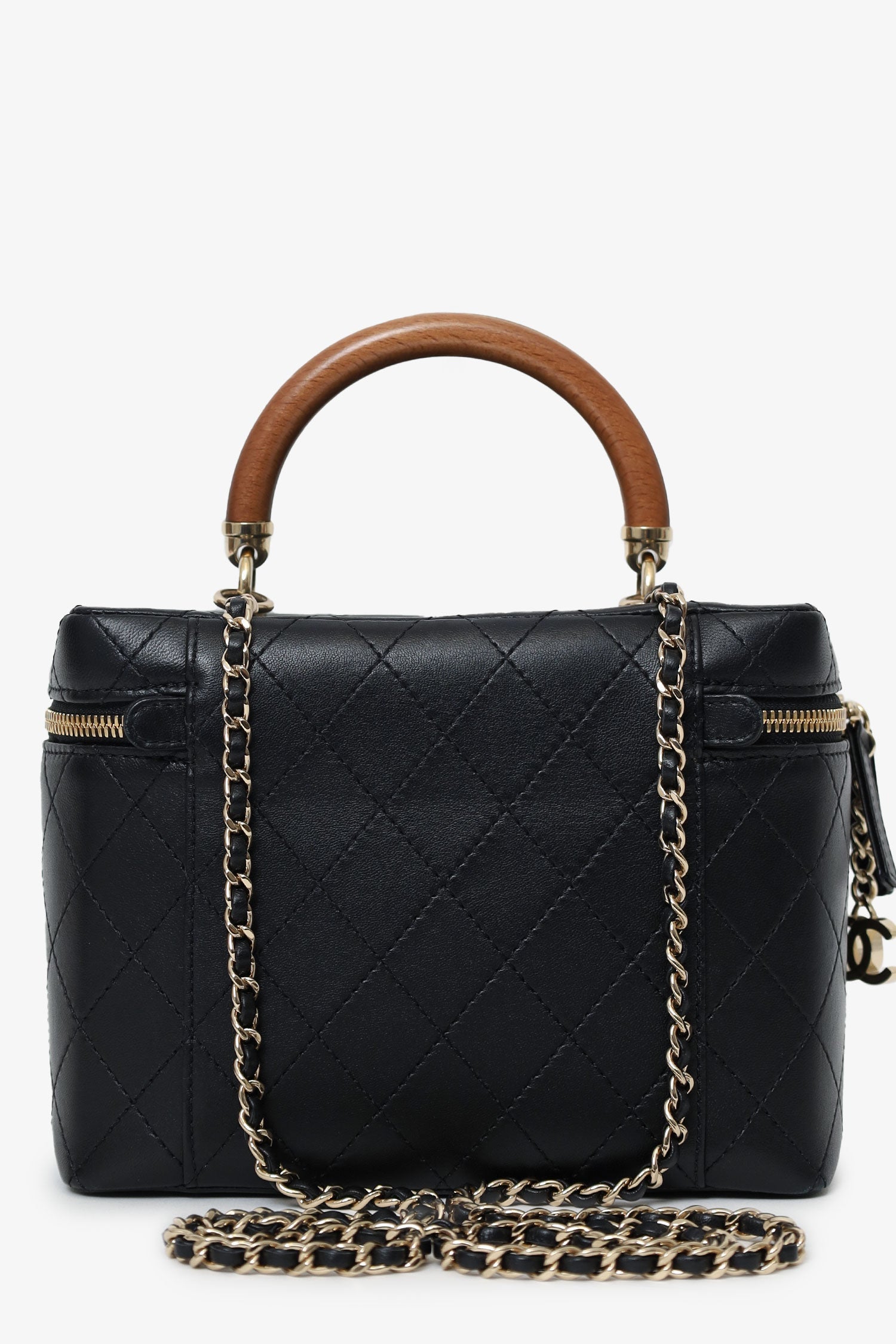 Pre-Loved Chanel™ Black Quilted Lambskin Knock On Wood Vanity Case. Front zip closure. Top handle. Chainlink crossbody strap. Protective base studs. Leather-lined interior. Single interior slip compartment. Gold-tone hardware. Tonal stitching.