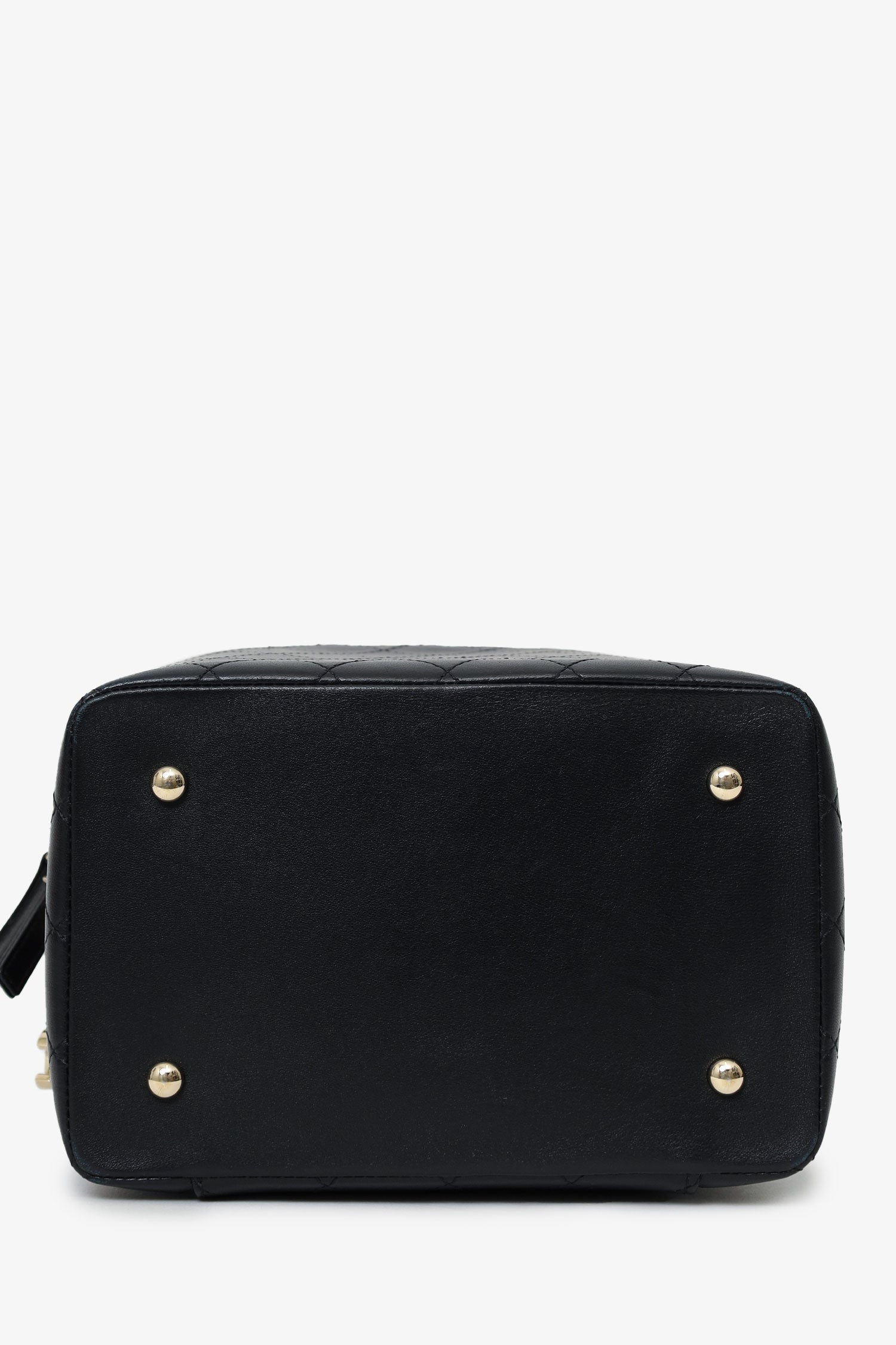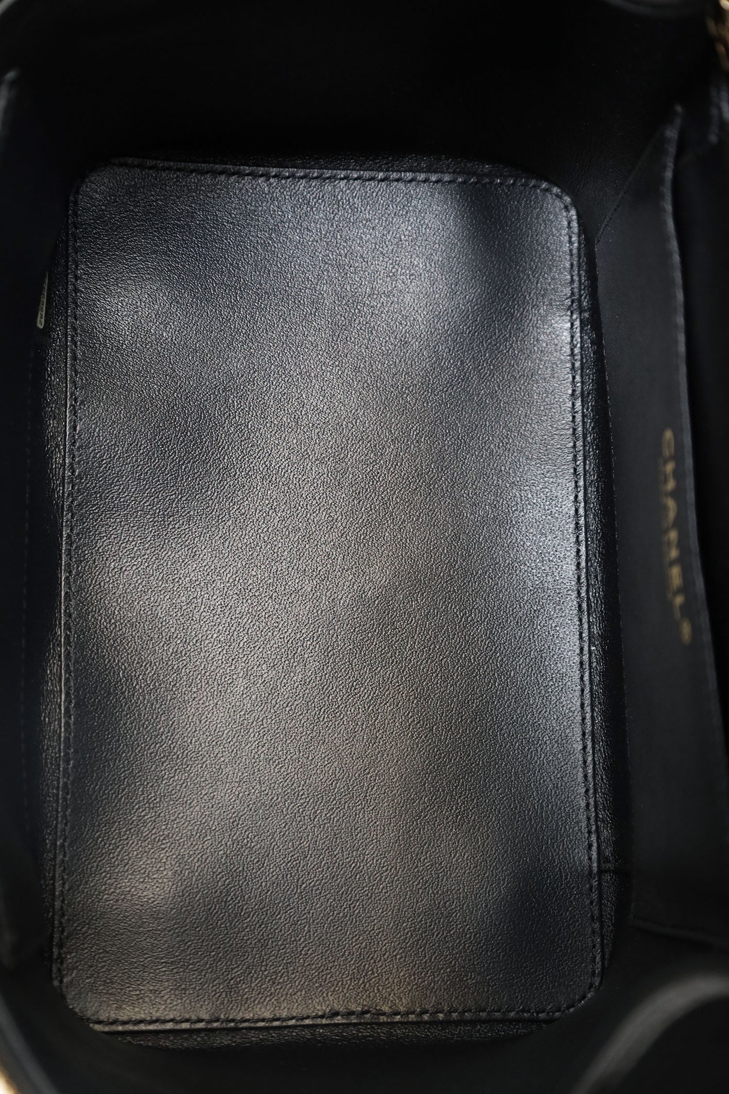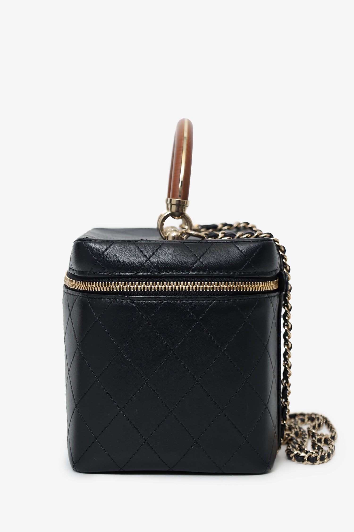 Pre-Loved Chanel™ Black Quilted Lambskin Knock On Wood Vanity Case. Front zip closure. Top handle. Chainlink crossbody strap. Protective base studs. Leather-lined interior. Single interior slip compartment. Gold-tone hardware. Tonal stitching.