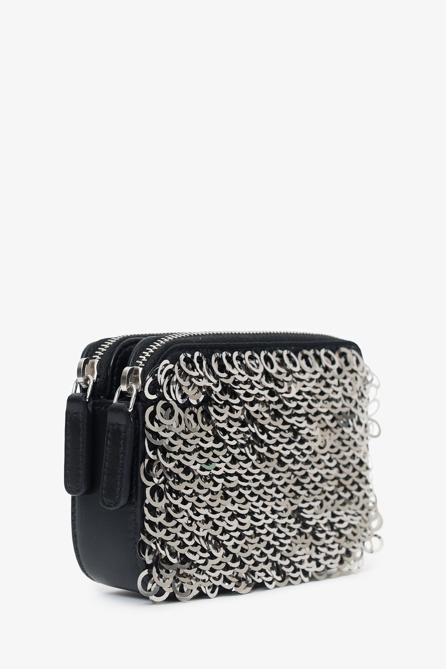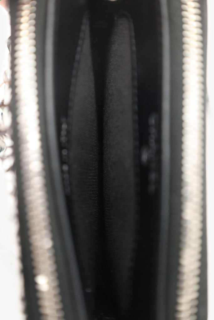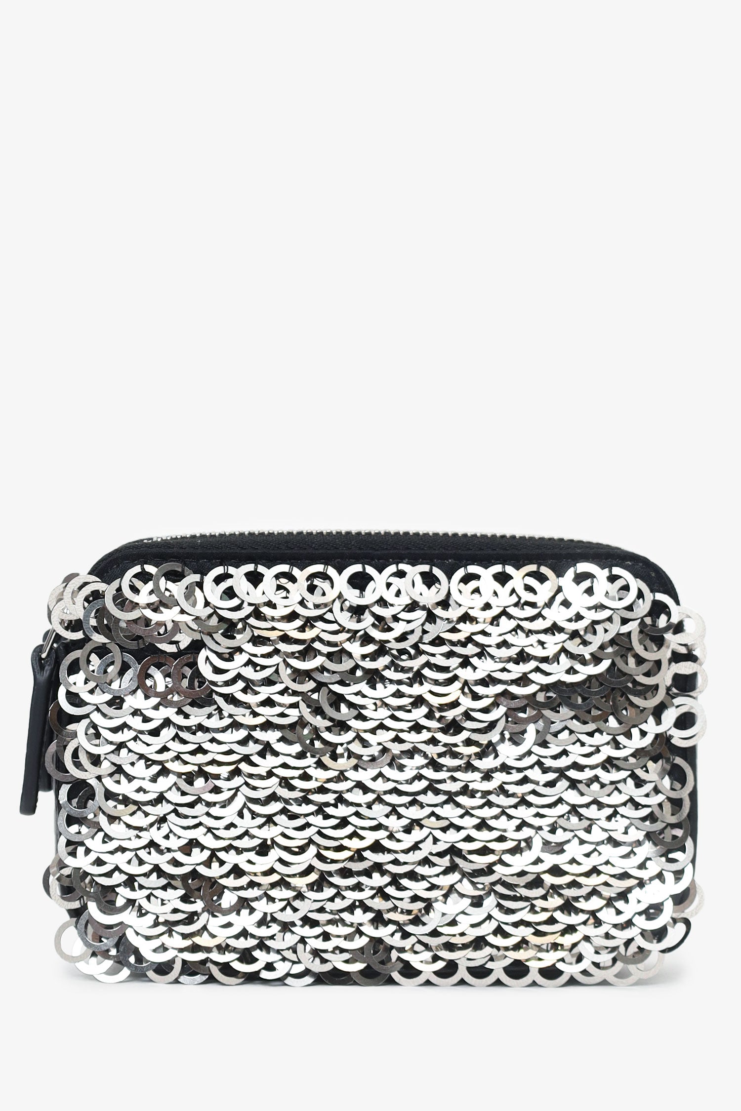 Pre-Loved Chanel™ Black Sequin Double Zip Clutch. 2 top zip closures. Removable chainlink and leather strap with lobster clasp closure. Lined interior. 3 interior compartments; front contains 3 card holders, middle contains 1 slip pocket, and rear contains 3 card holders. Silver-tone hardware. Tonal stitching.