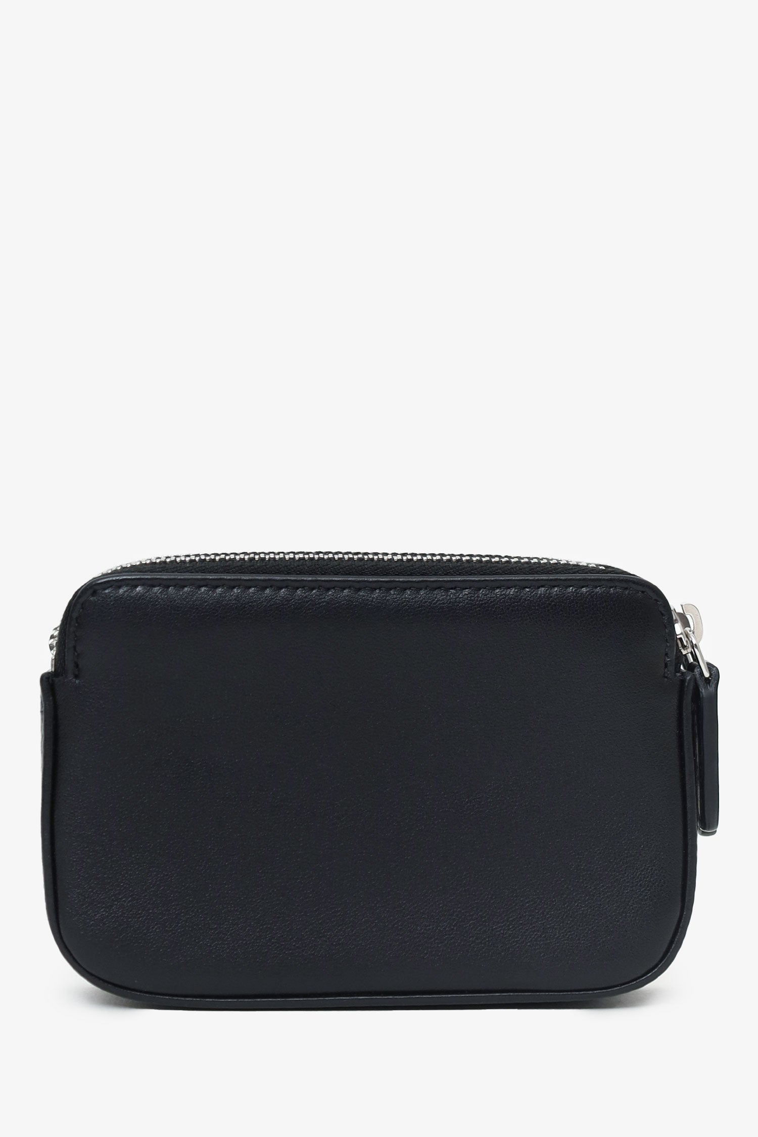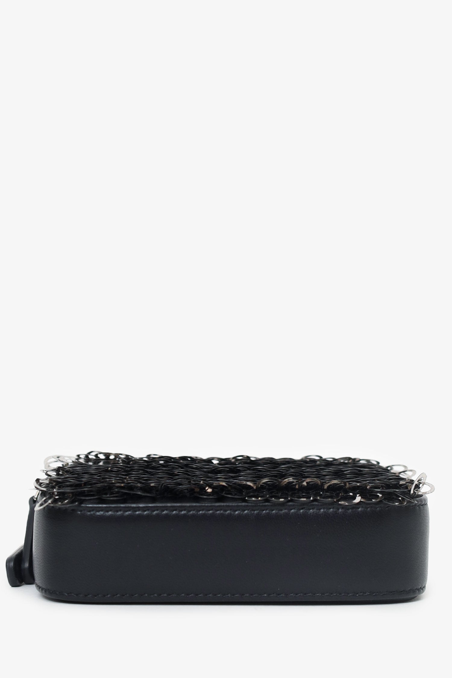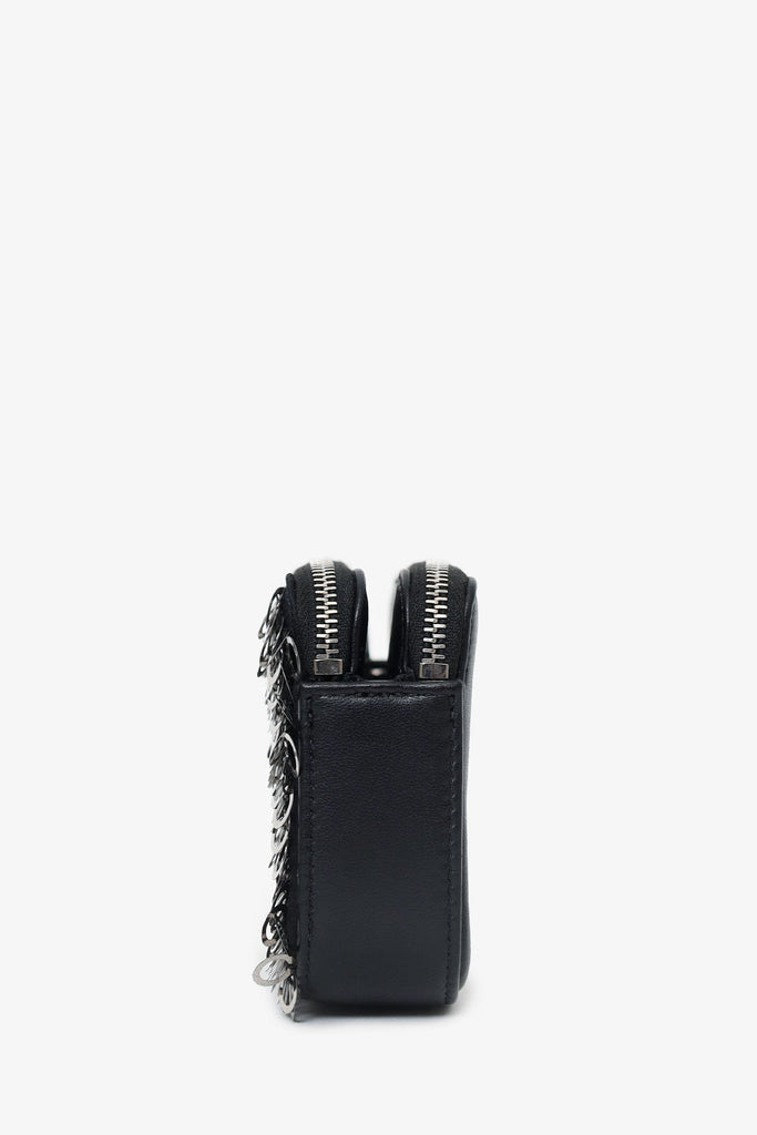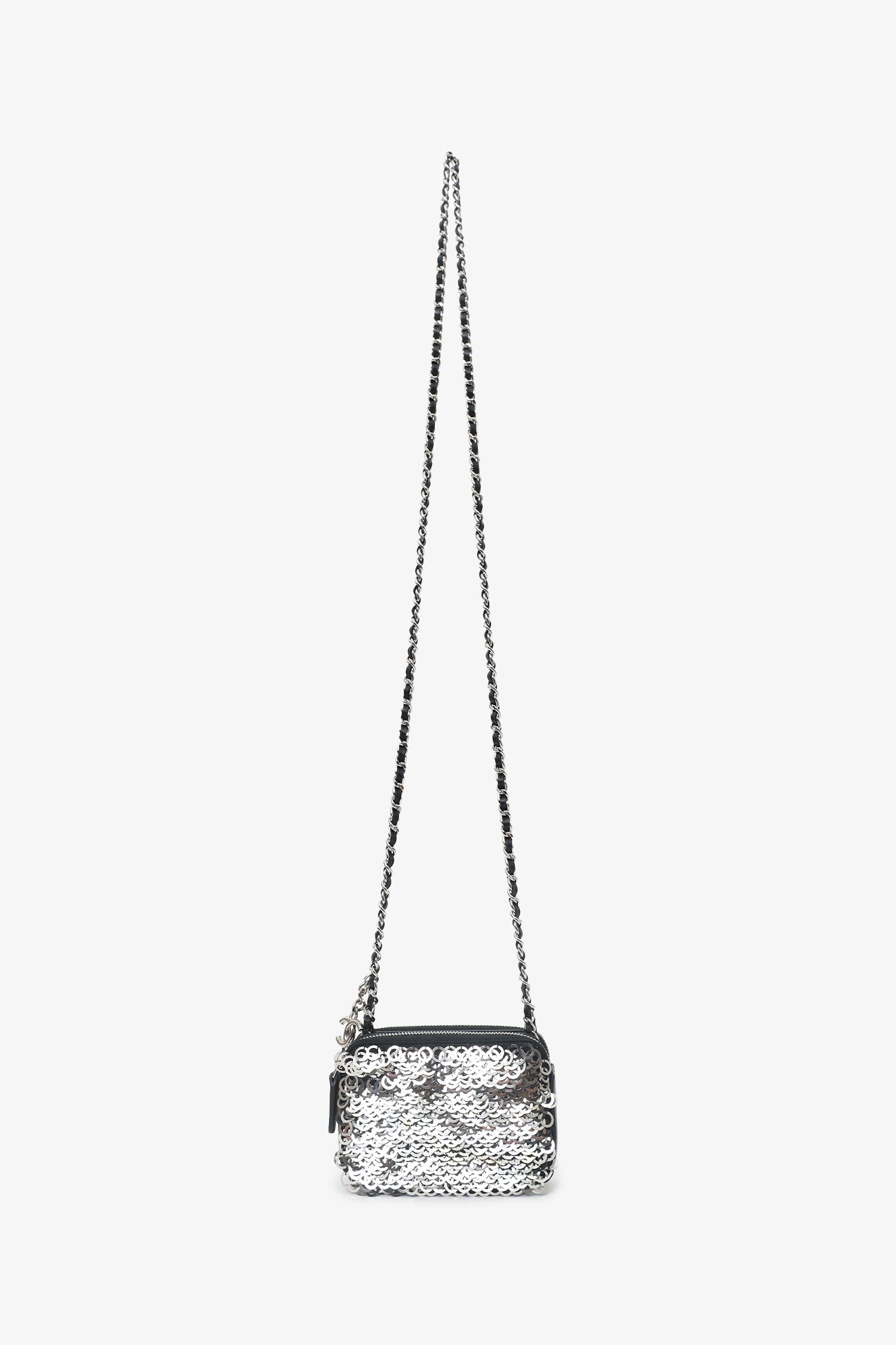 Pre-Loved Chanel™ Black Sequin Double Zip Clutch. 2 top zip closures. Removable chainlink and leather strap with lobster clasp closure. Lined interior. 3 interior compartments; front contains 3 card holders, middle contains 1 slip pocket, and rear contains 3 card holders. Silver-tone hardware. Tonal stitching.