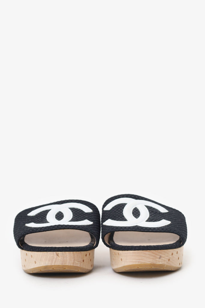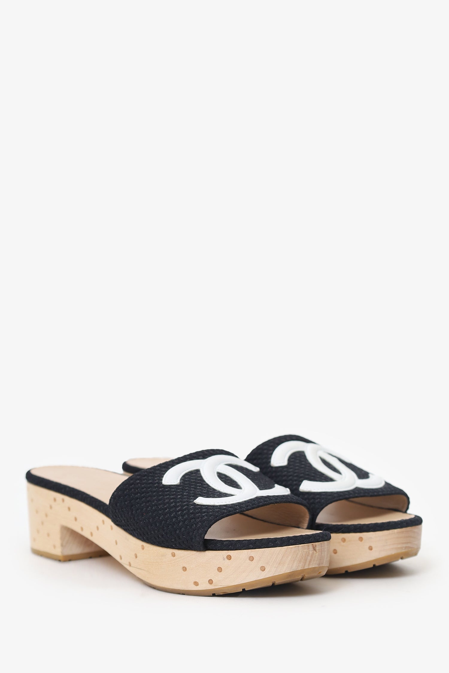 Pre-Loved Chanel™ Black/White Leather/Canvas 'CC' Wooden Block Heels Size 39.5