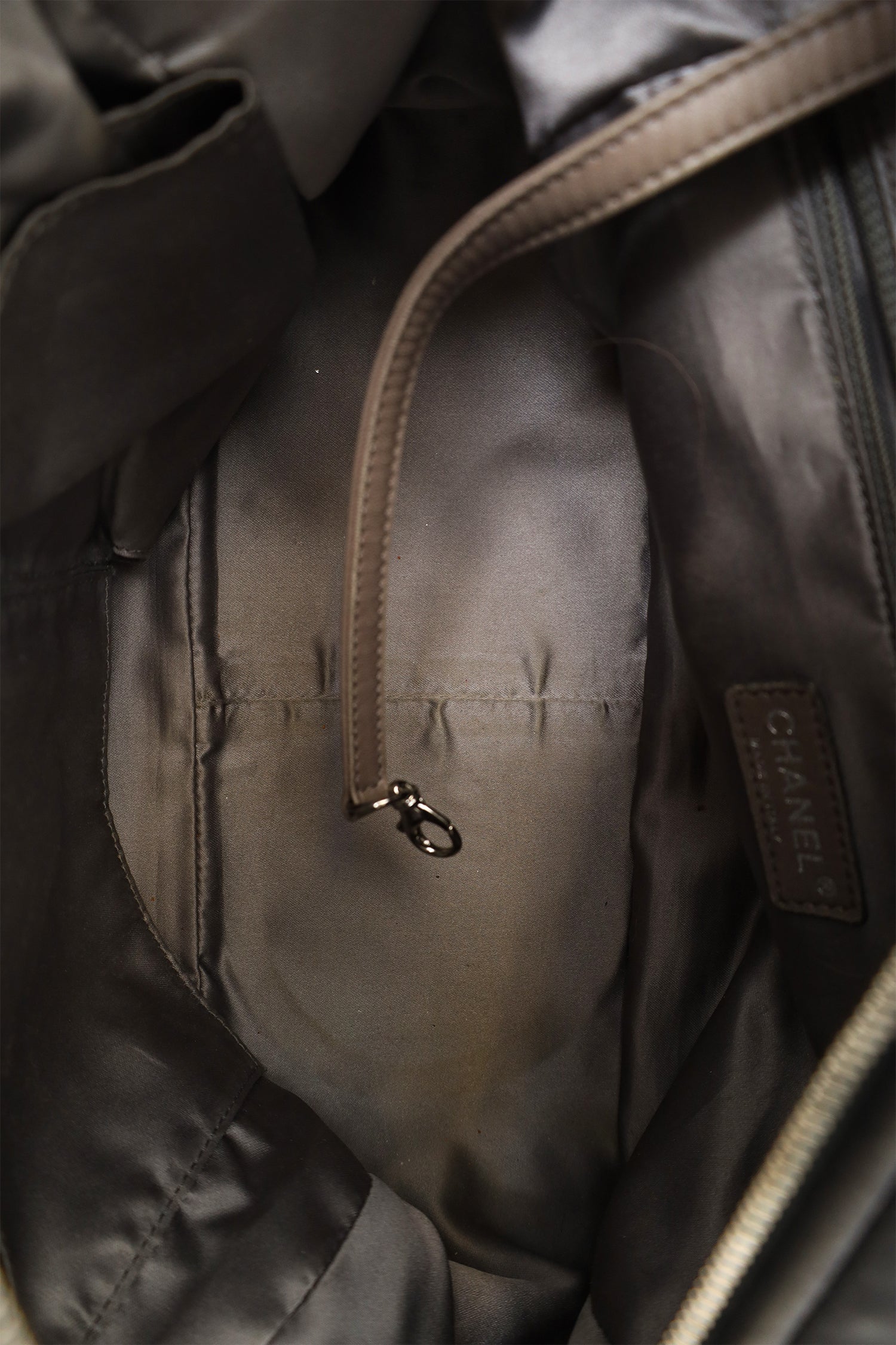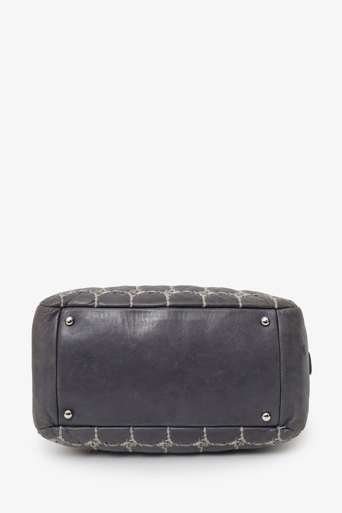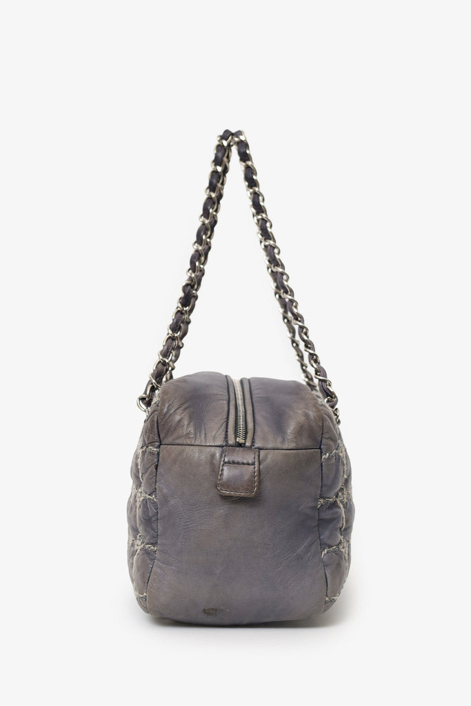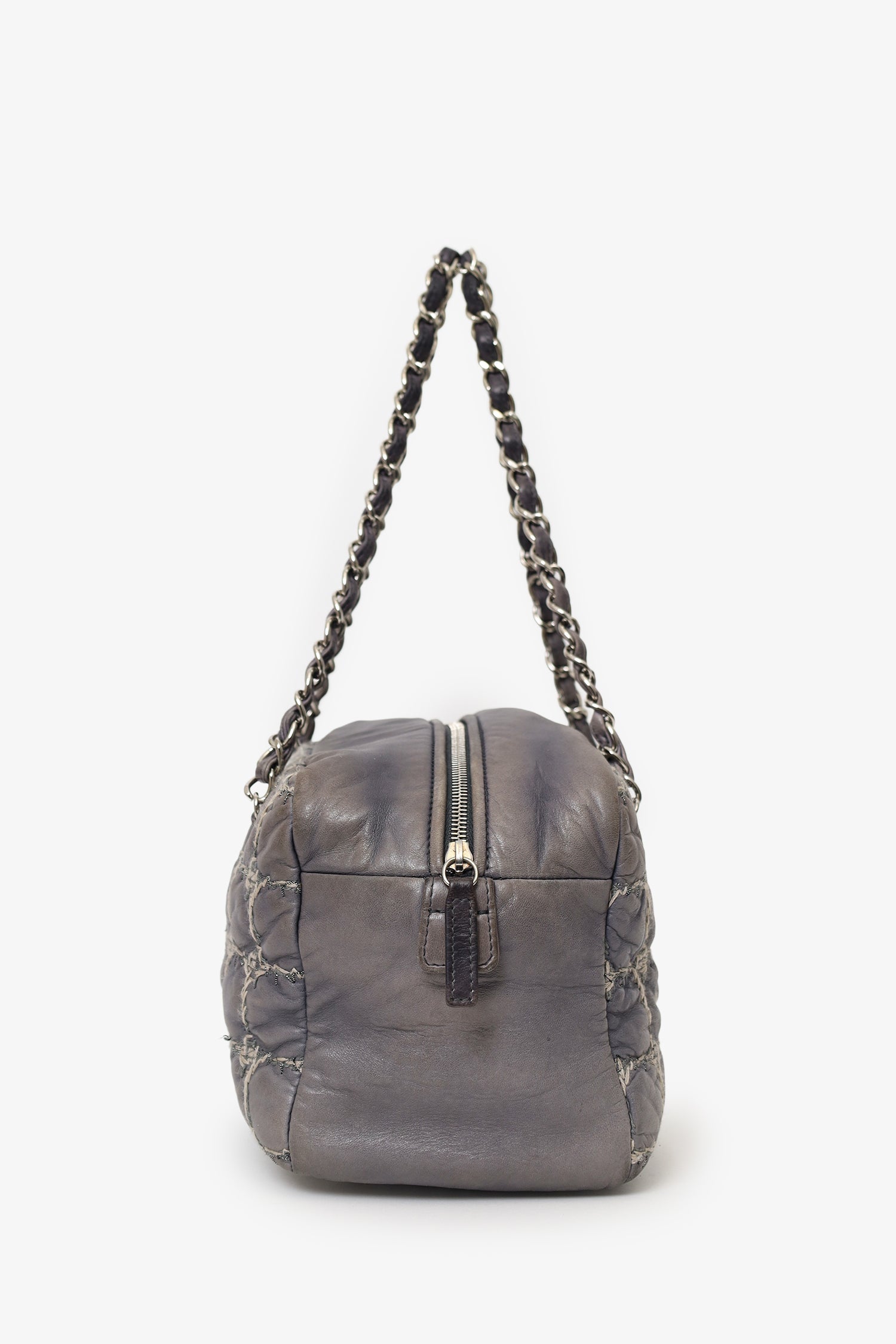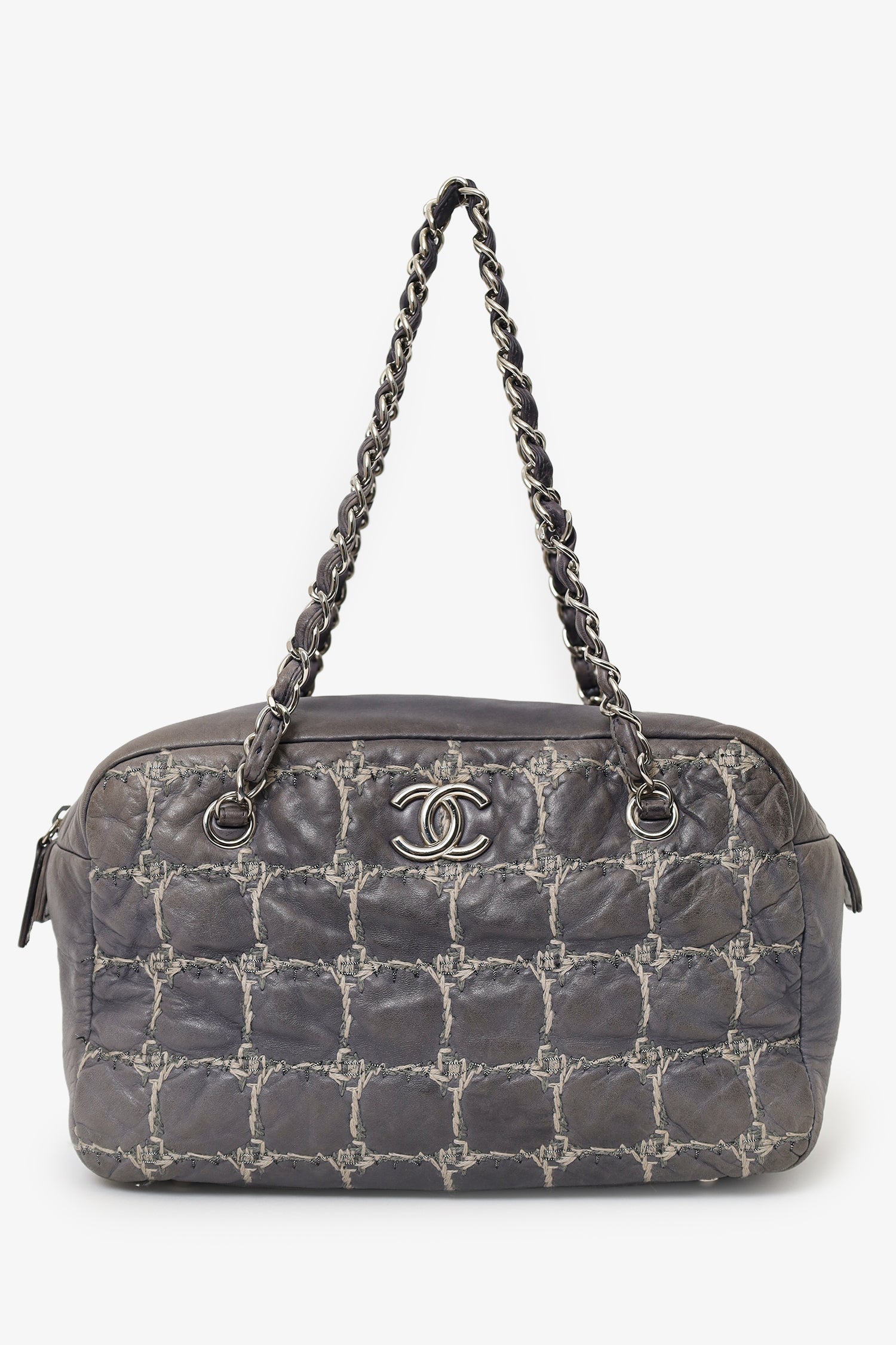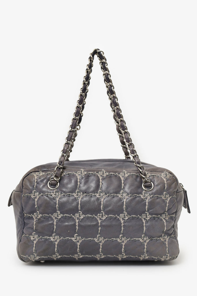 Pre-Loved Chanel™ Grey Leather/Tweed Double Bowler Bag. Top zip closure. Twin shoulder straps. Protective bass studs. Lined interior. 3 interior pockets; 1 zip and 2 slip. Silver-tone hardware. Tonal and contrast stitching.