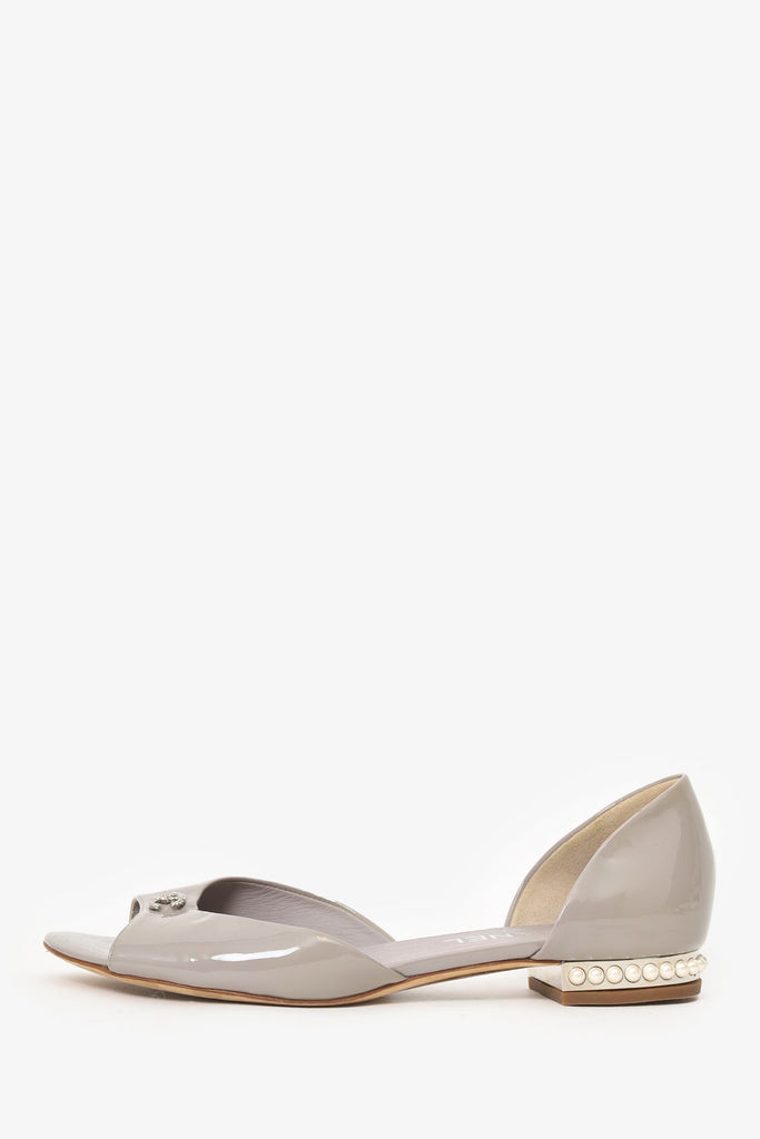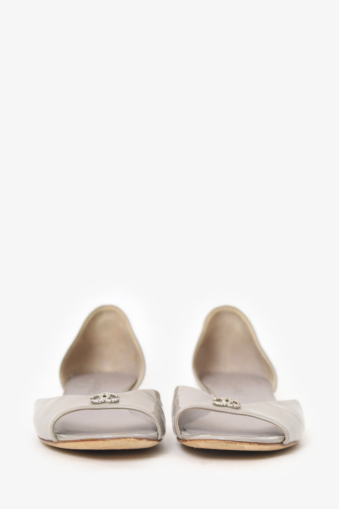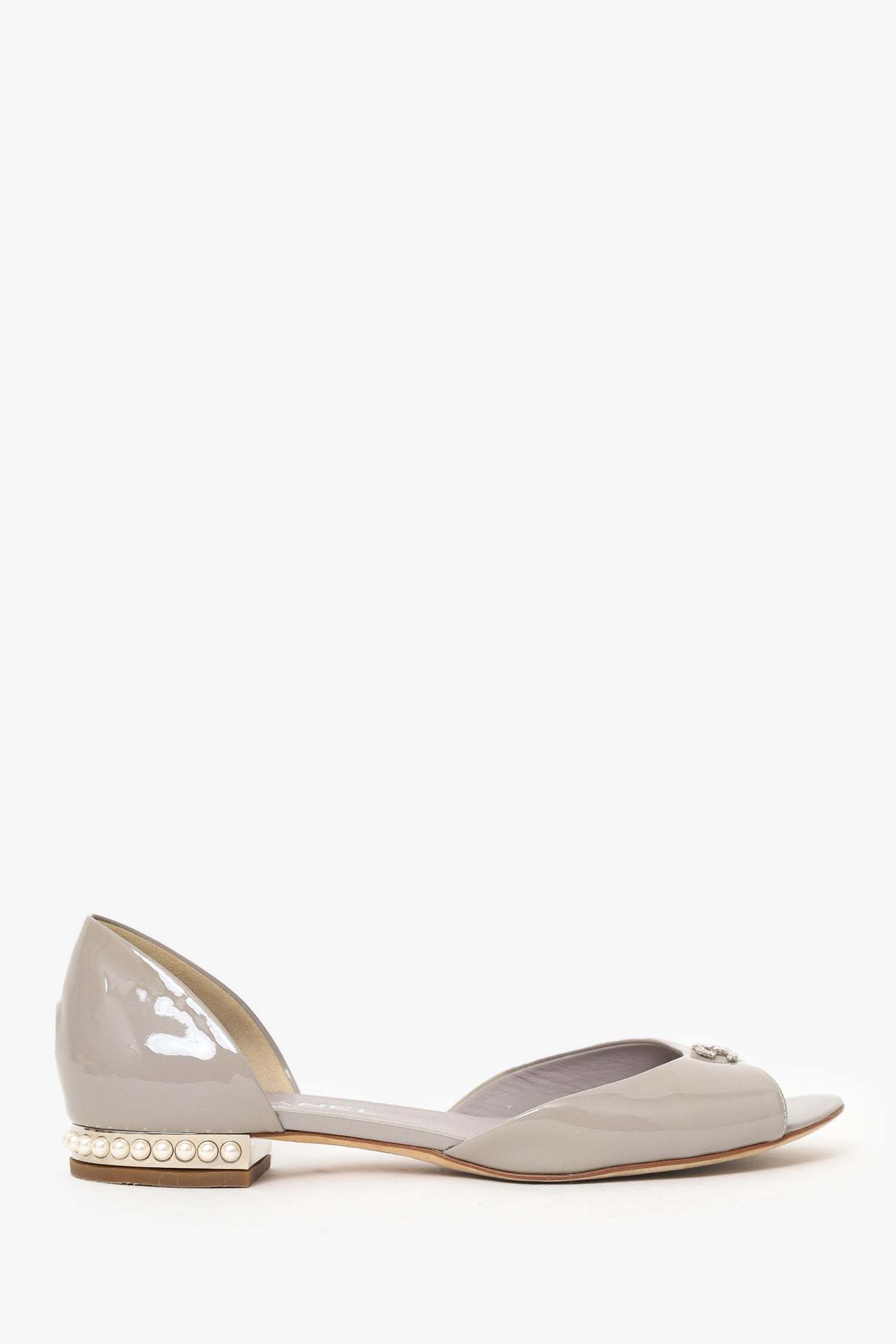 Pre-Loved Chanel™ Grey Patent Leather Pearl Embellished Heel Peep Toe Flats Size 38