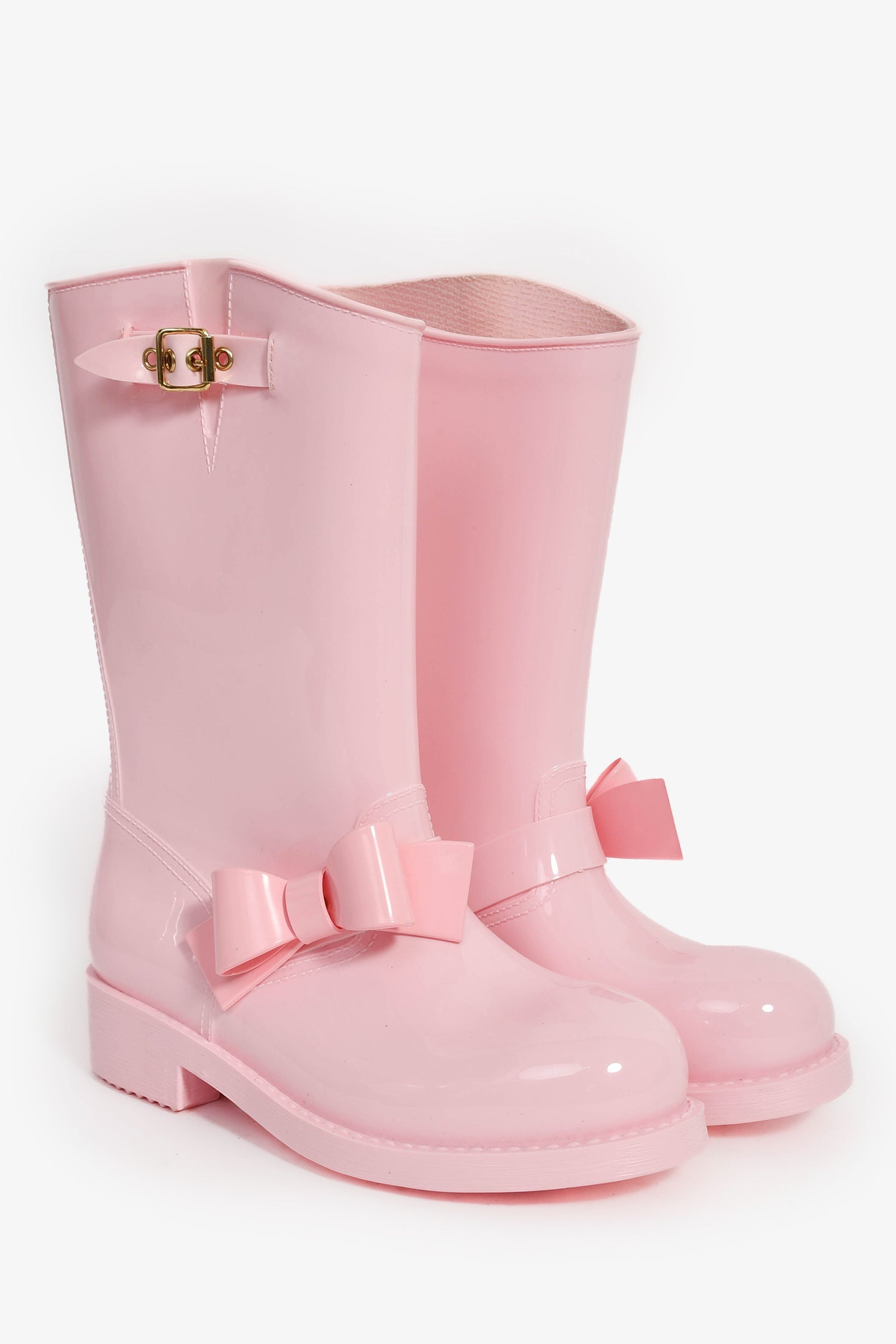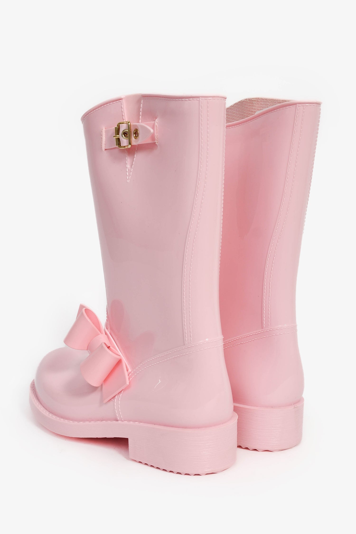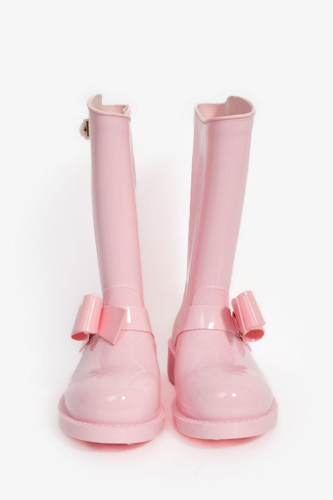 Red Valentino Pink Rubber Bow Detail Rain Boots. Pull-on. Round toe. Textile interior. Gold-tone hardware.