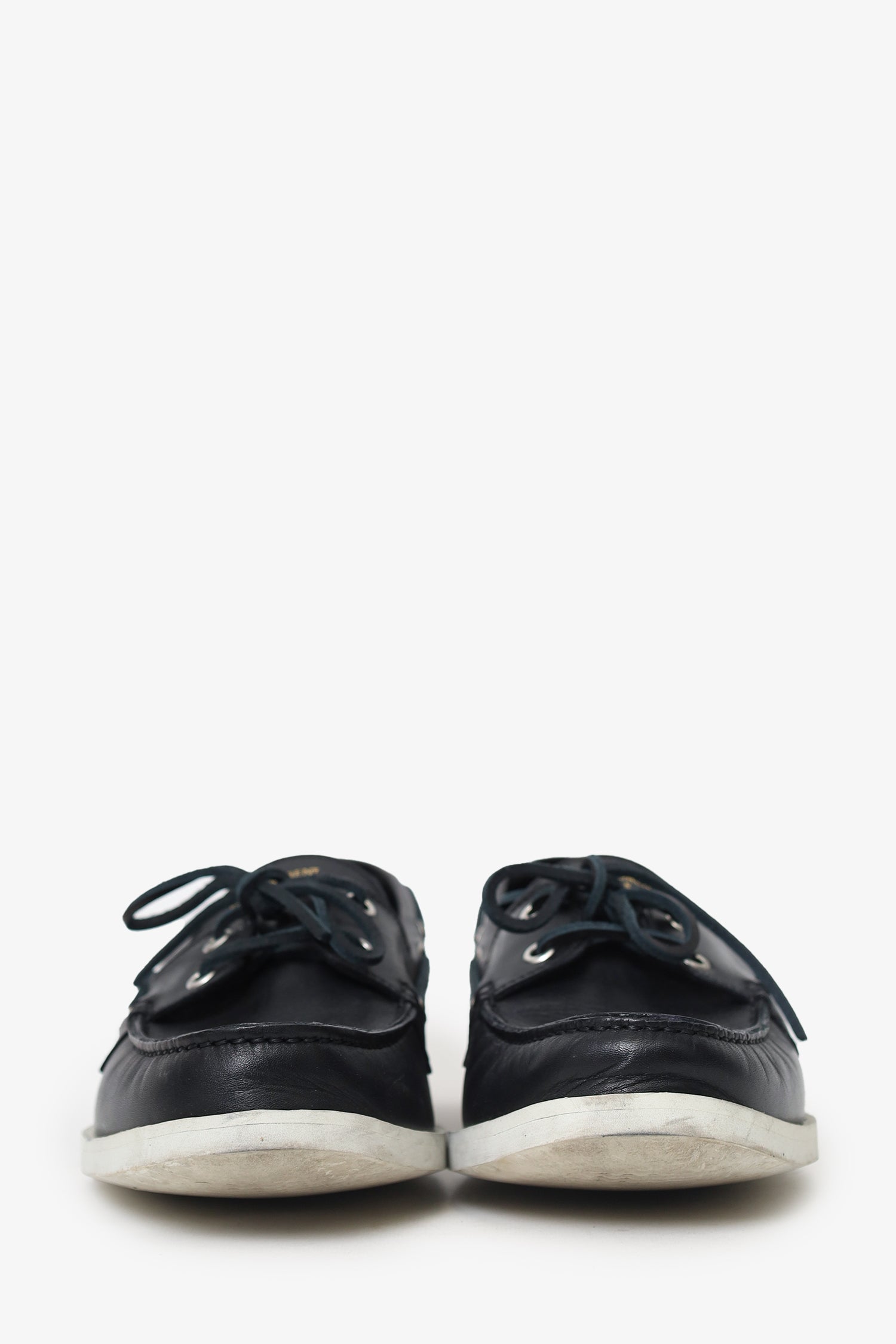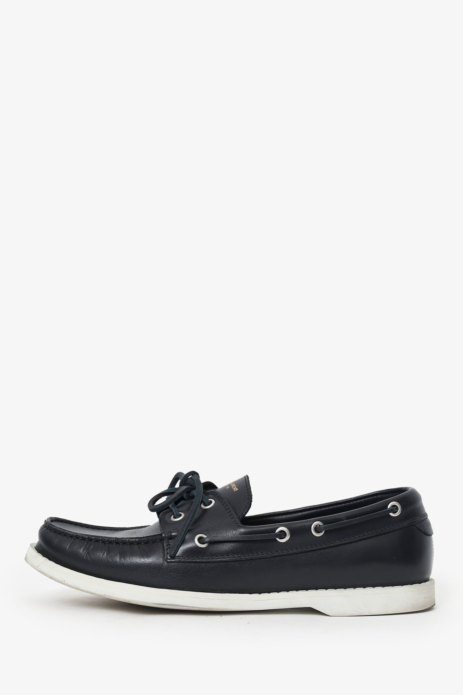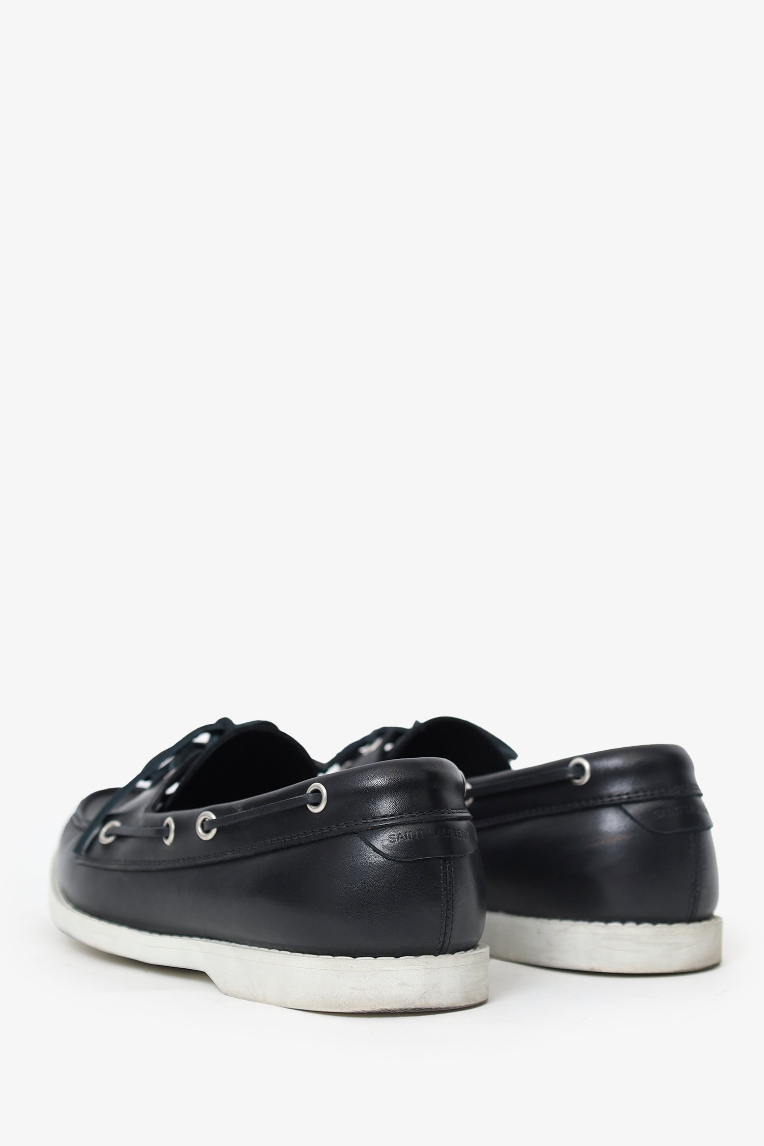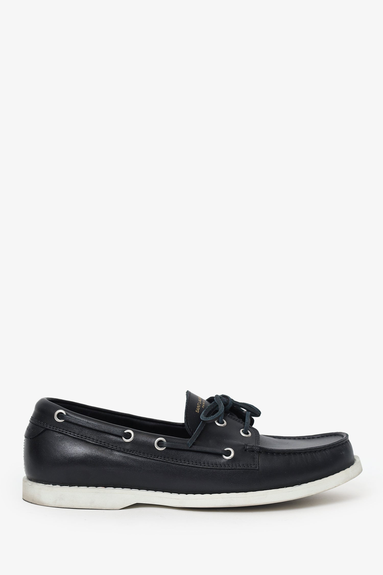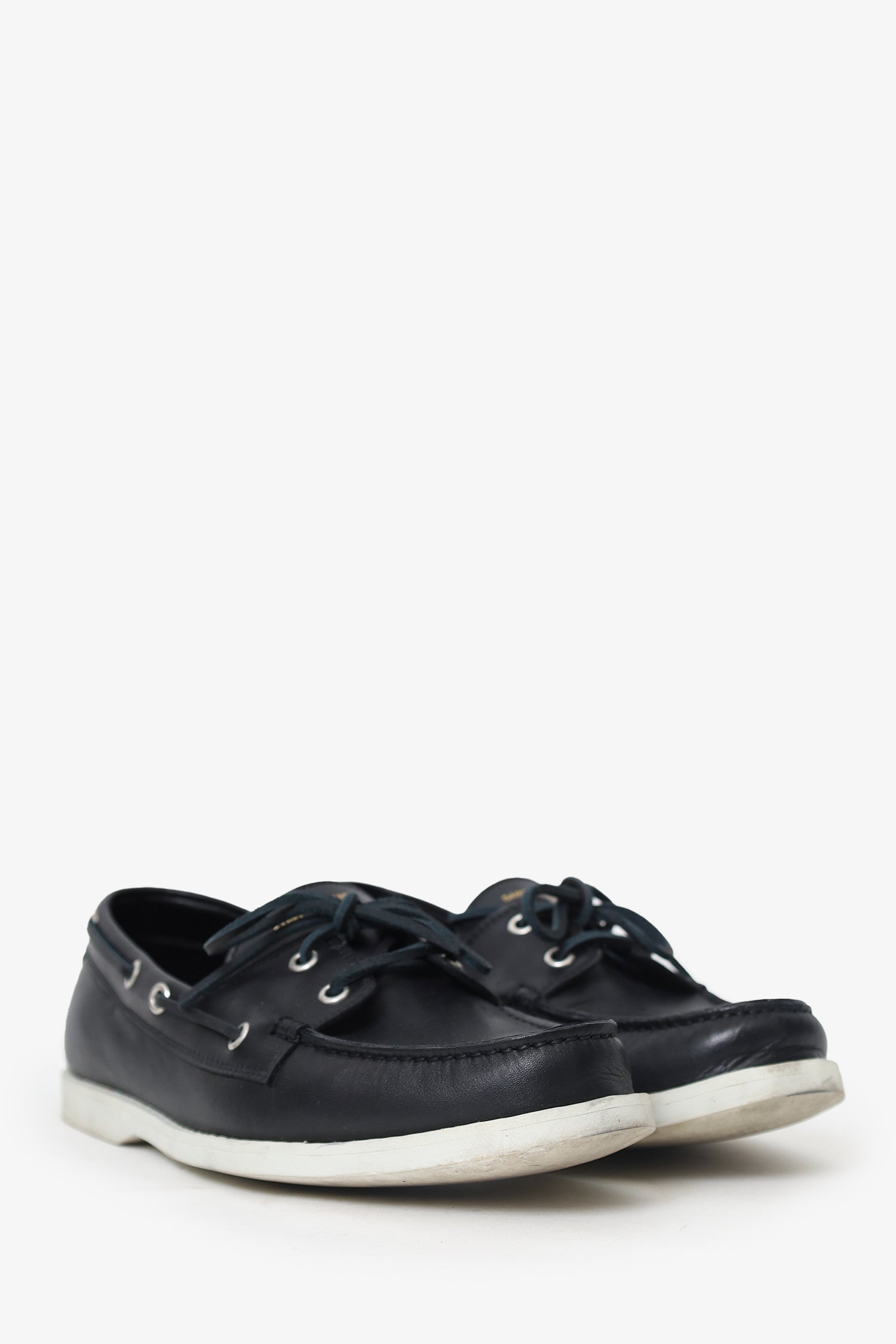 Saint Laurent Black Leather Boat Shoes. Slip-on. Round toe. Front lace-up closure. Silver-tone hardware. Tonal stitching.
