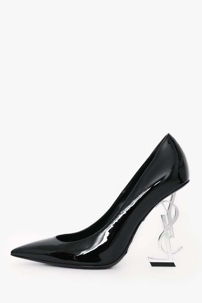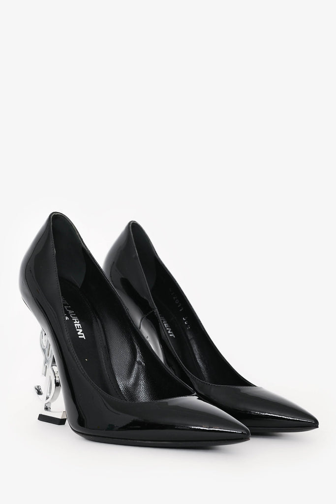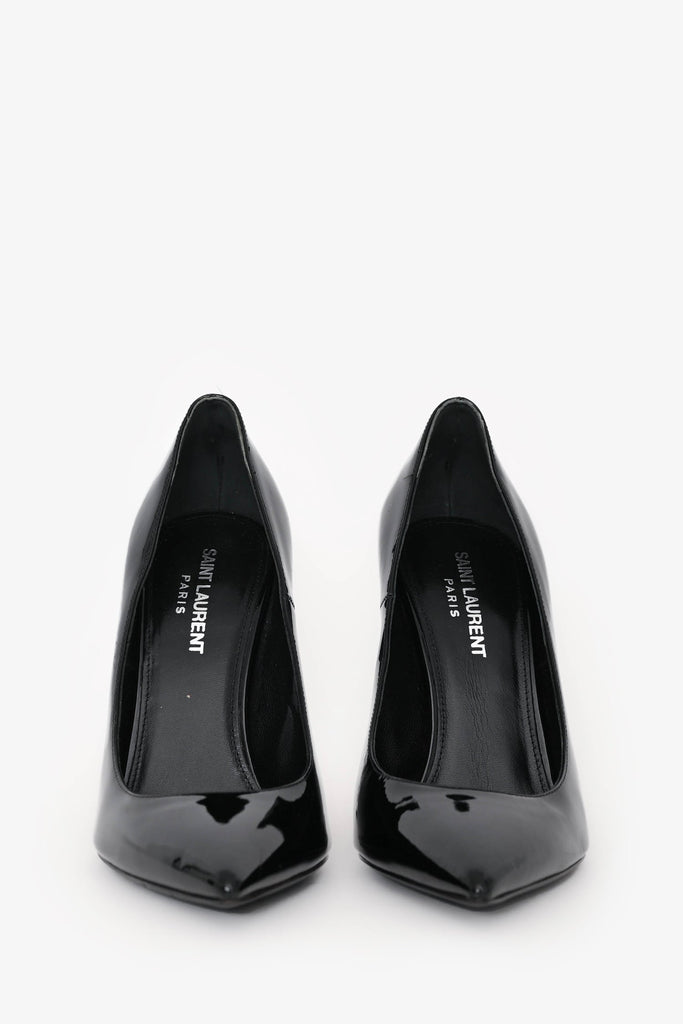 Saint Laurent Black Patent Leather Opyum Heels. Slip-on. Pointed toe. Tonal stitching.