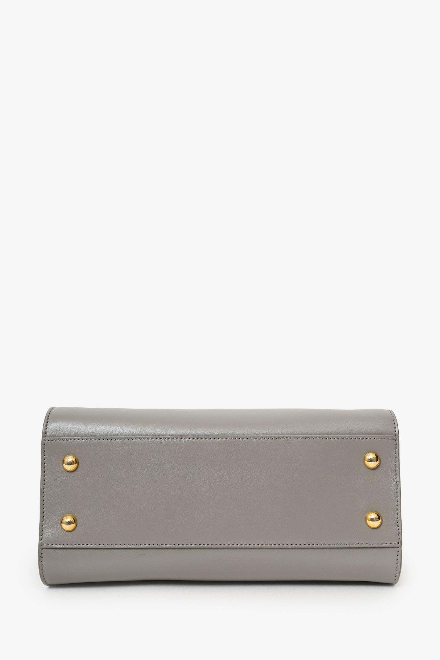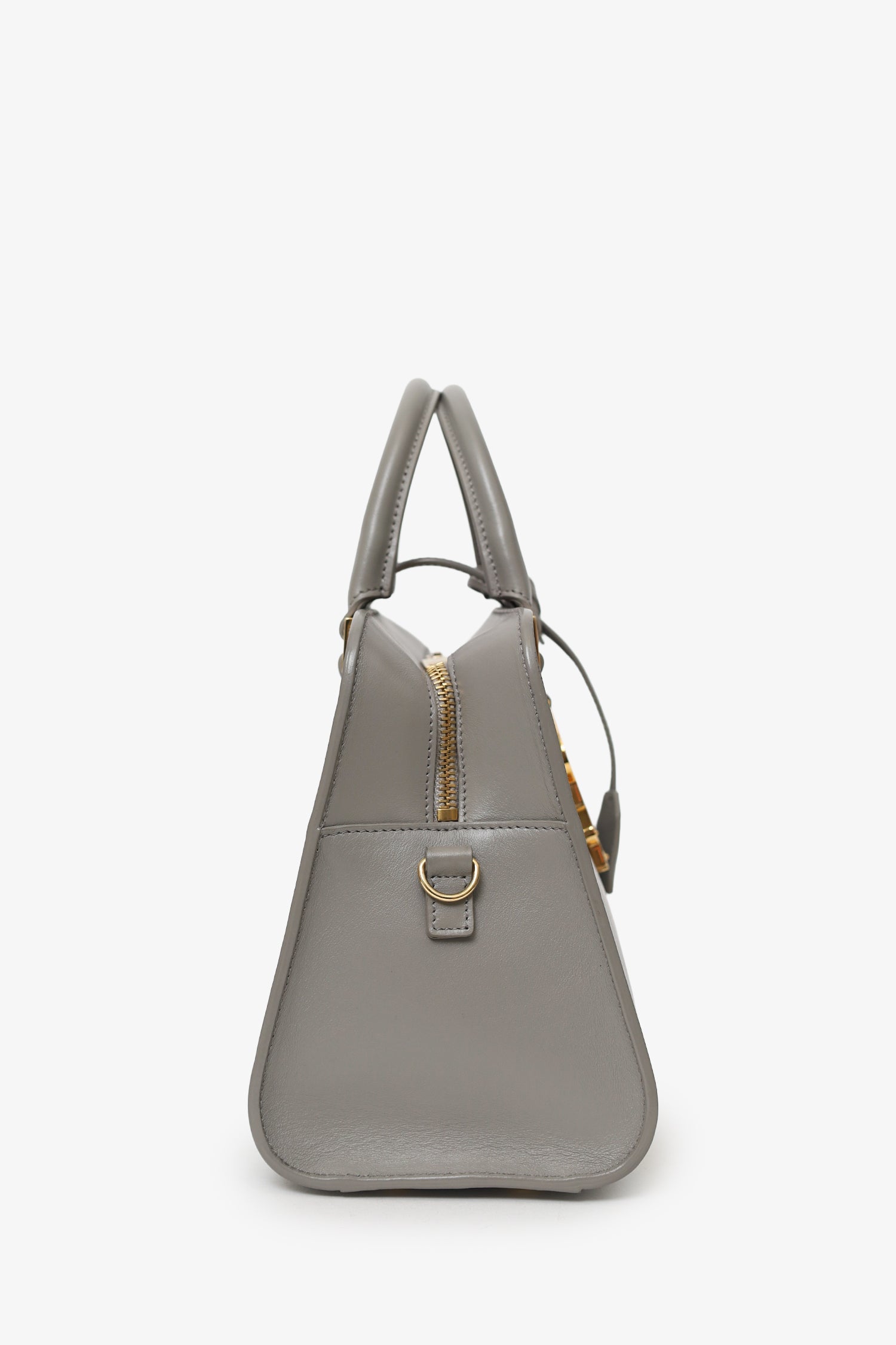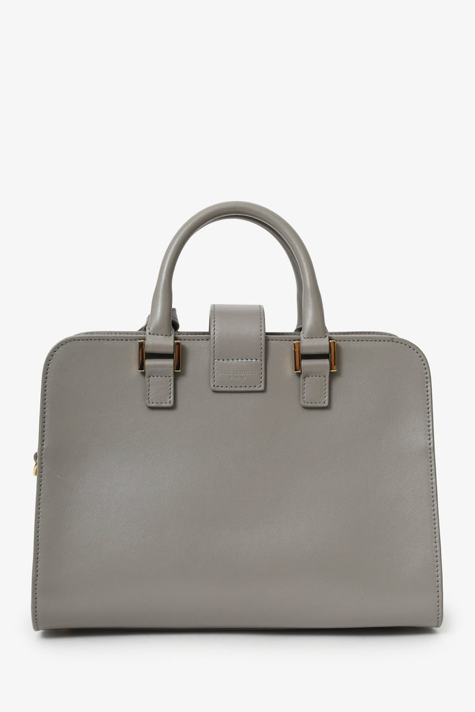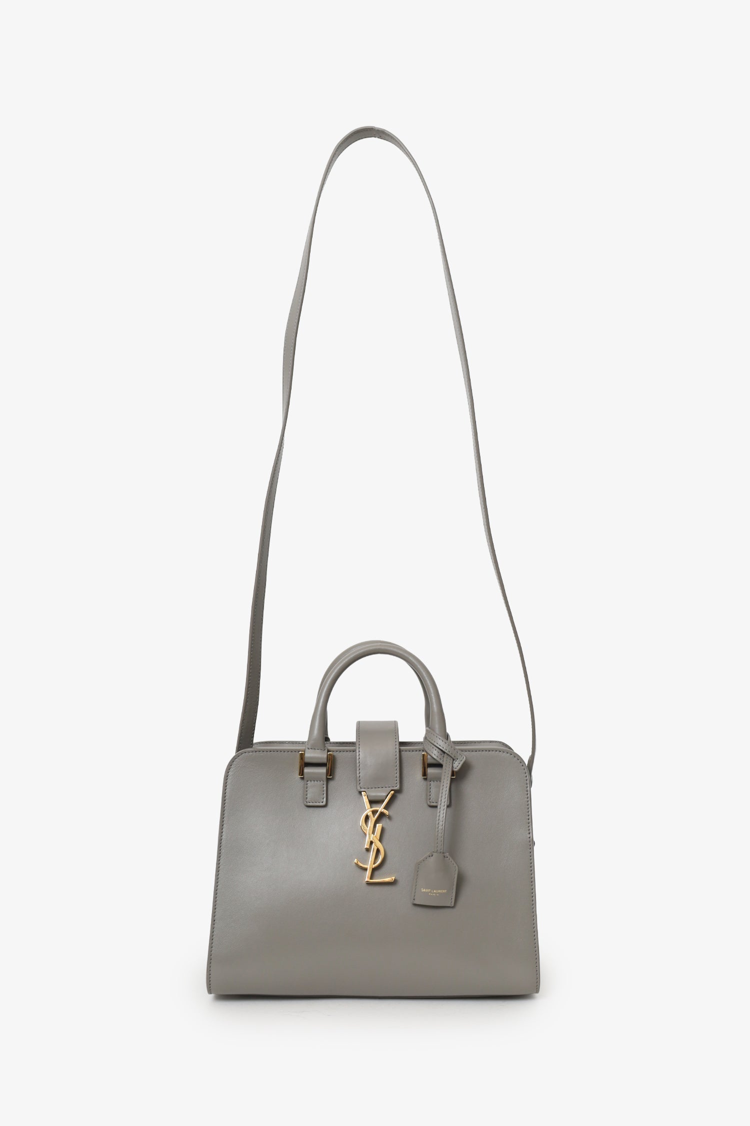 Saint Laurent Grey Leather Baby YSL Cabas Top Handle With Strap. Top zip closure. Front fold-over flap with magnetic snap-button. Twin top handles with removable clochette. Removable crossbody strap. Leather lined interior. Single interior wall slip pocket. Gold-tone hardware. Tonal stitching.