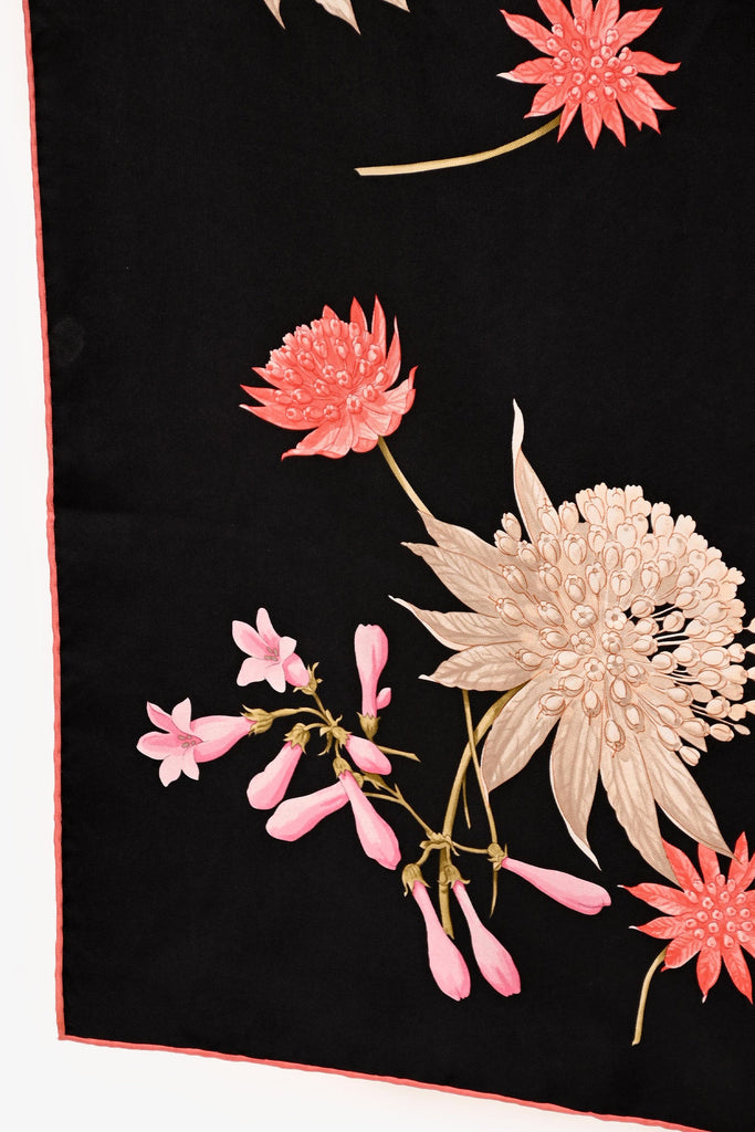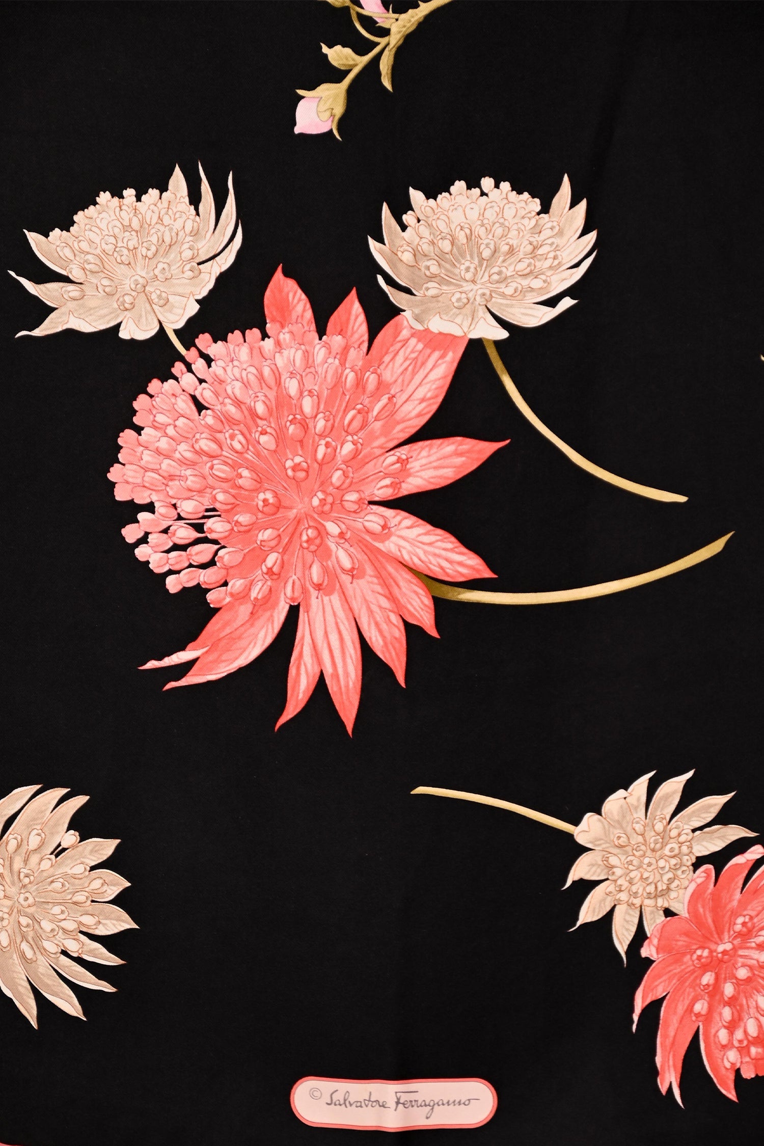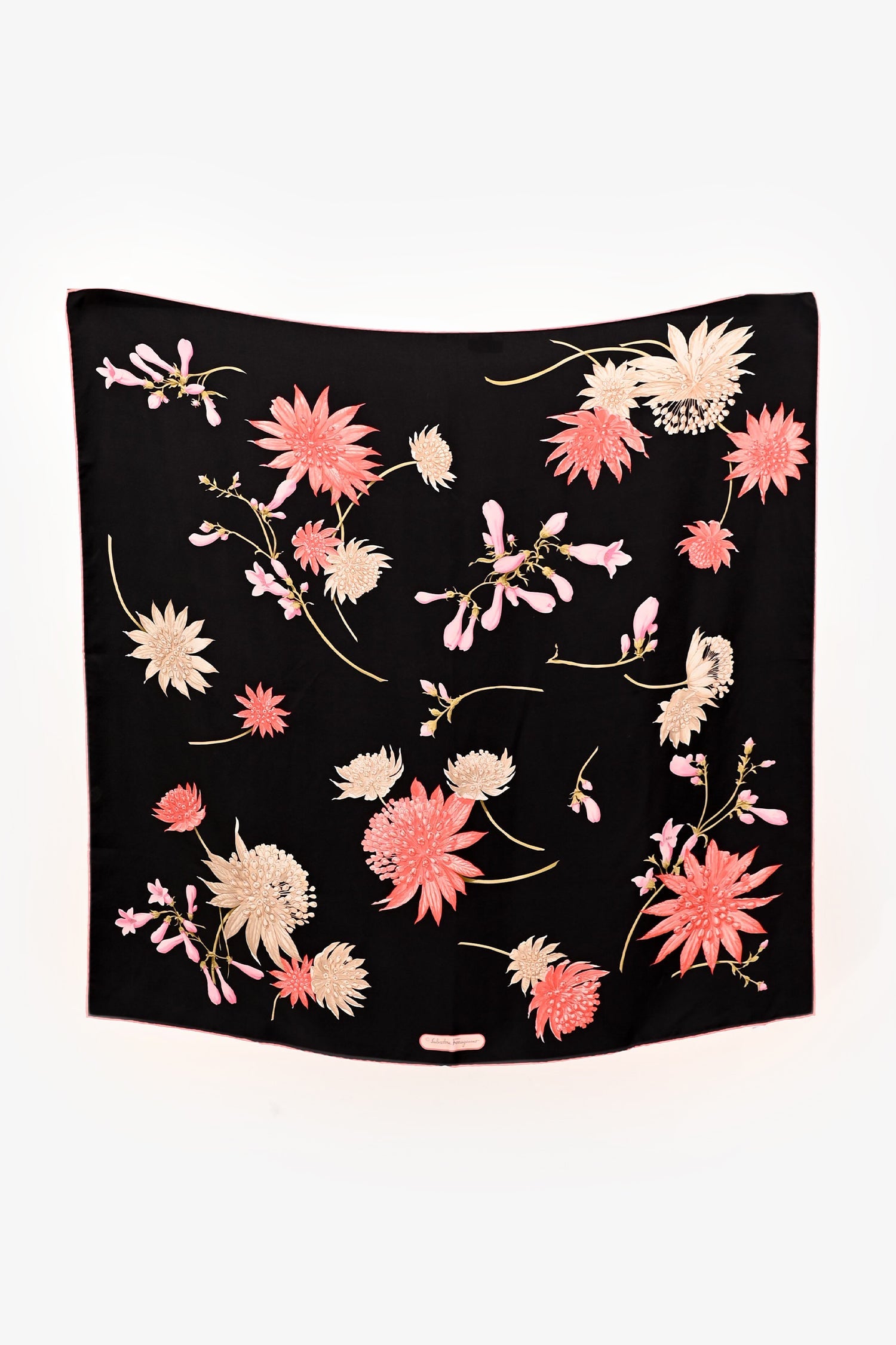 Salvatore Ferragamo Black Floral Square Scarf. Tonal stitching.