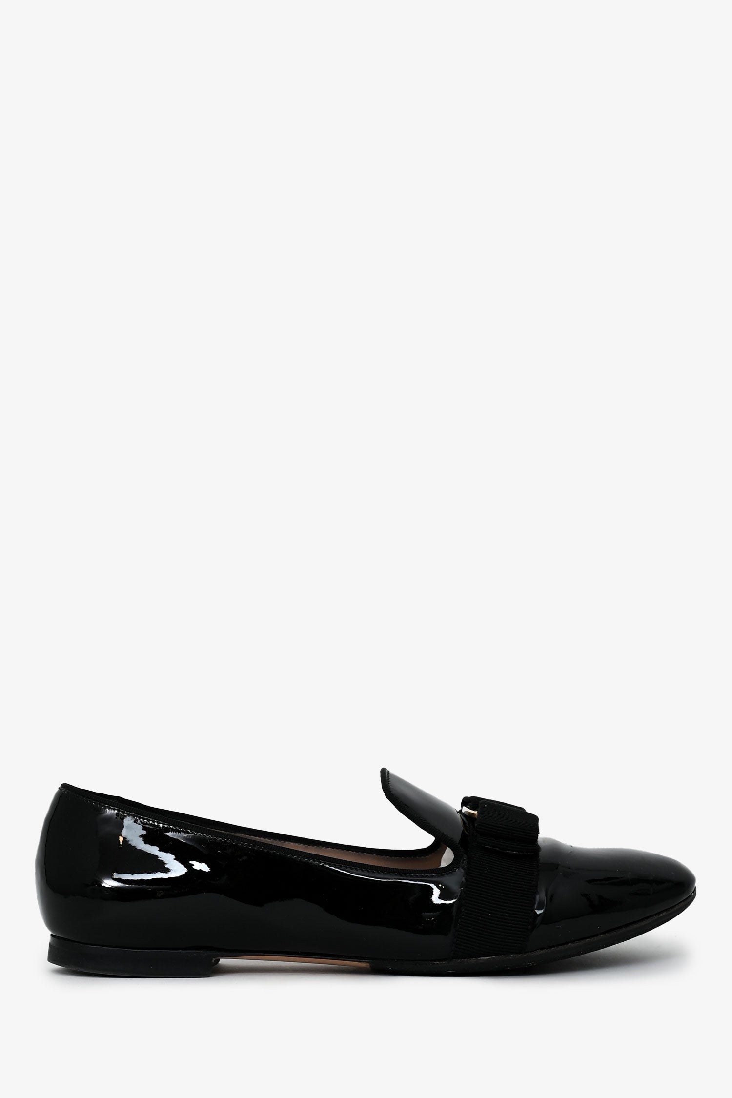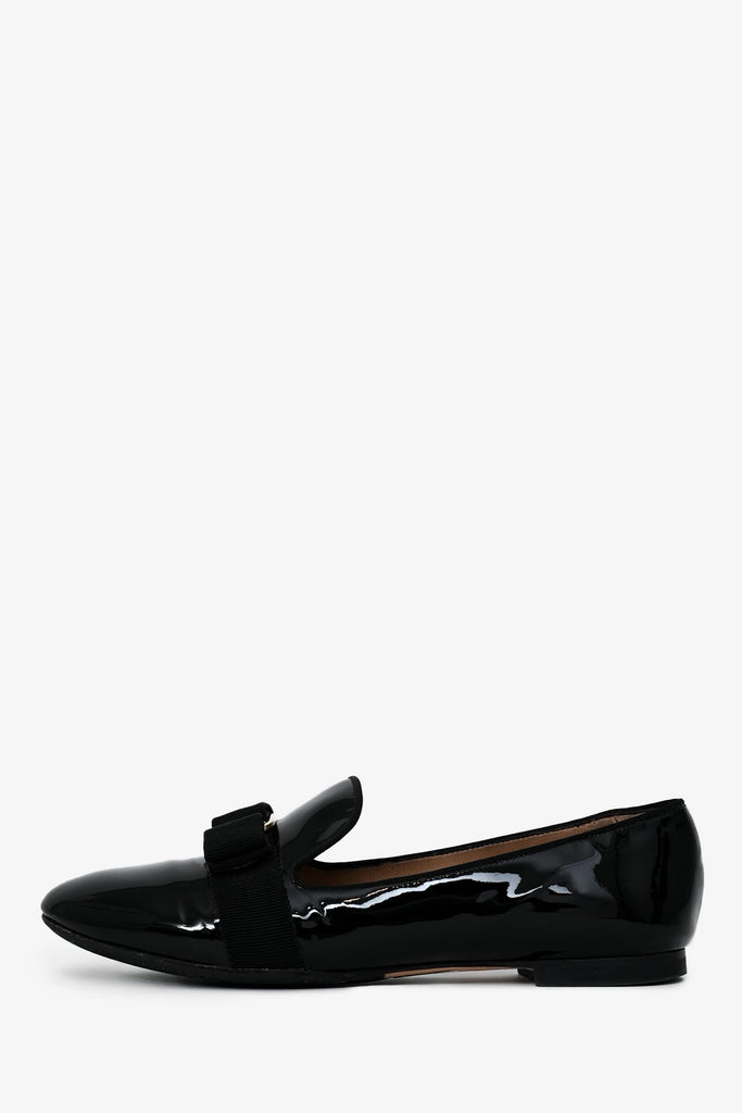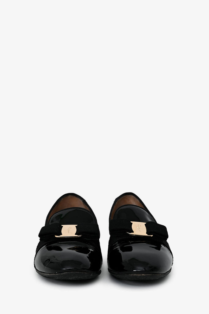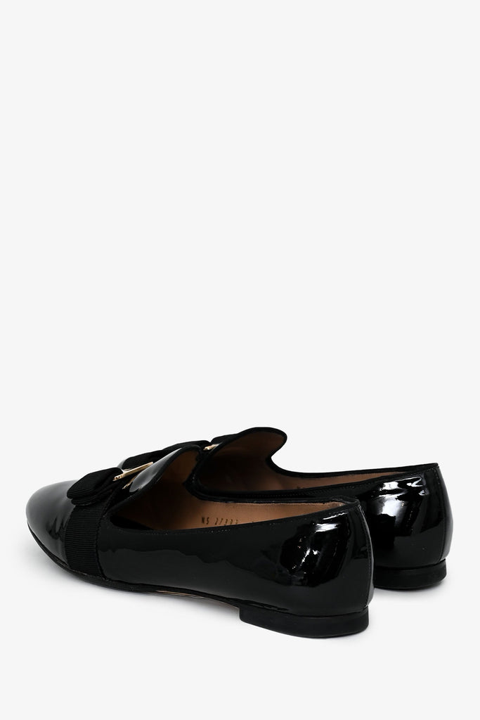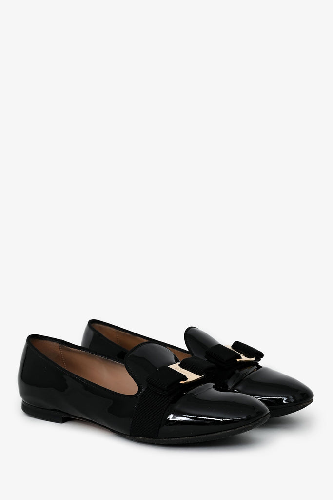 Salvatore Ferragamo Black Patent 'Scotty' Loafers. Slip-on. Round toe. Gold-tone hardware. Tonal stitching.