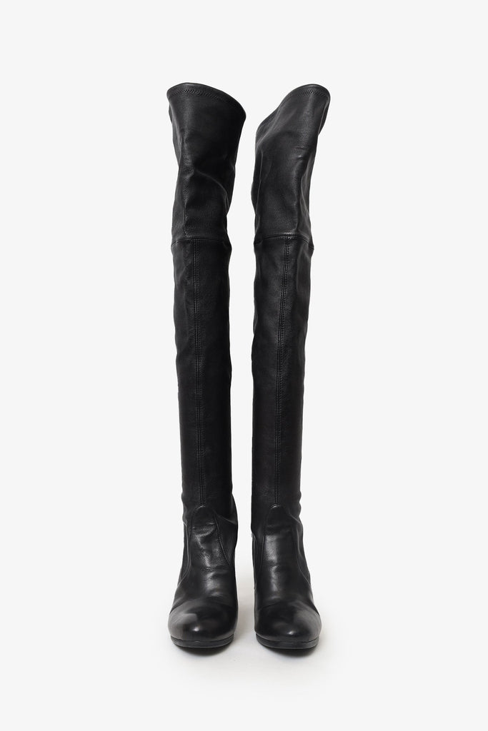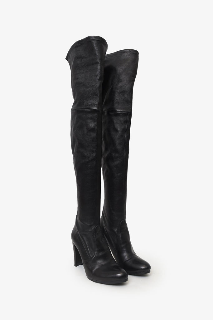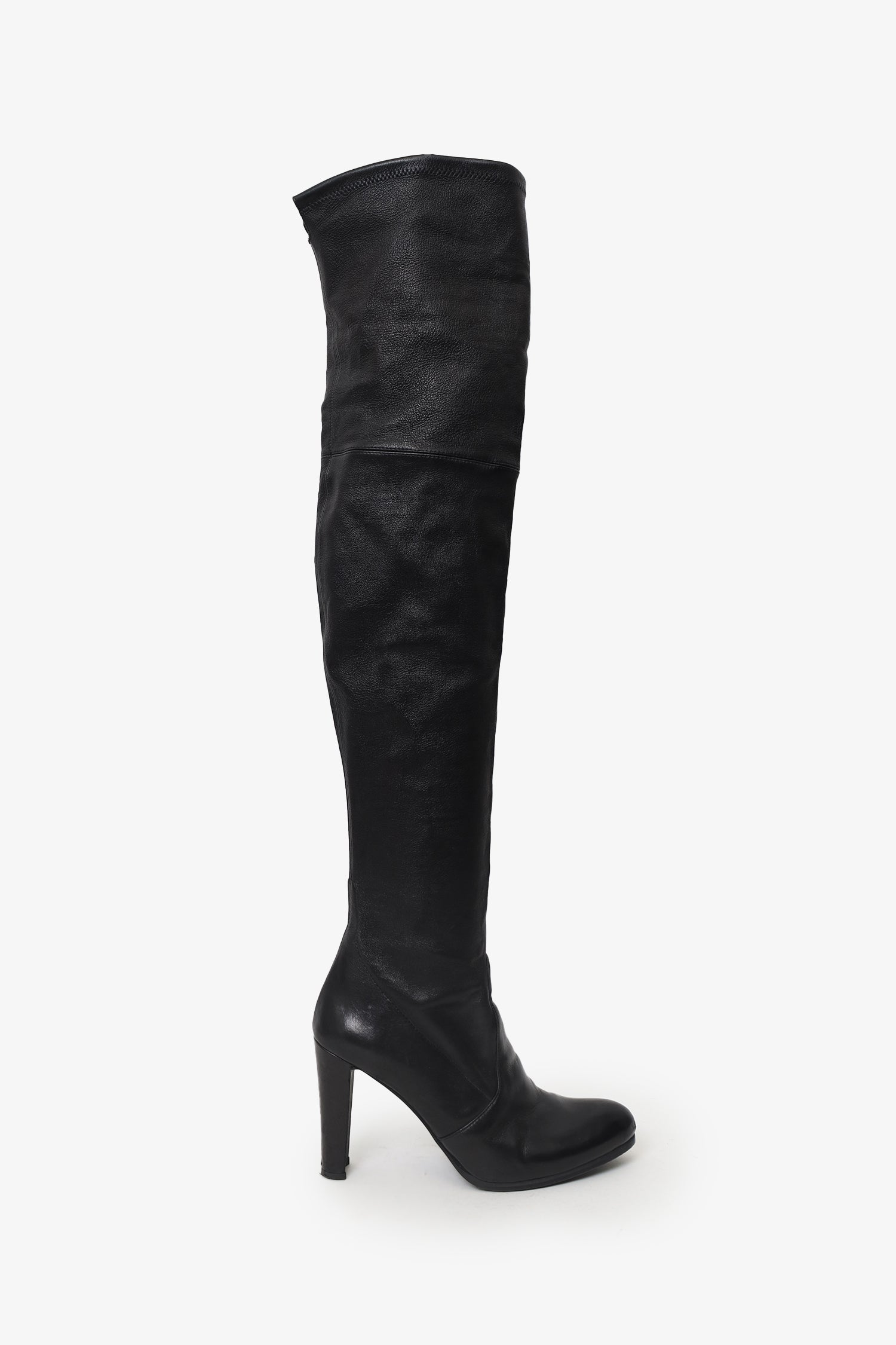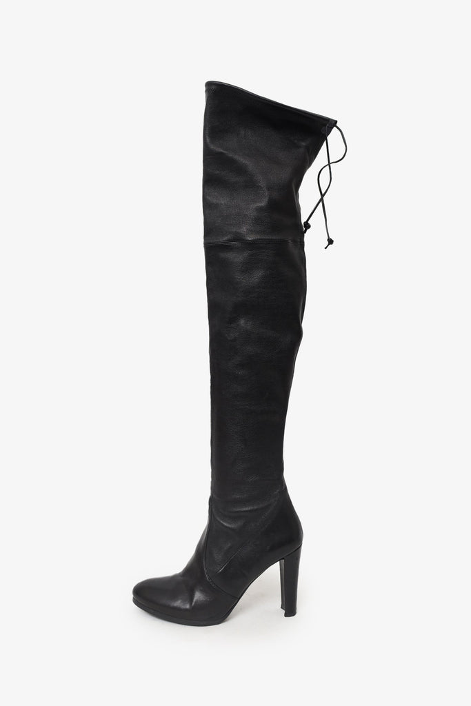 Stuart Weitzman Black Leather Knee High Boots. Pull-on. Round toe. Cinch cord around top. Tonal stitching.